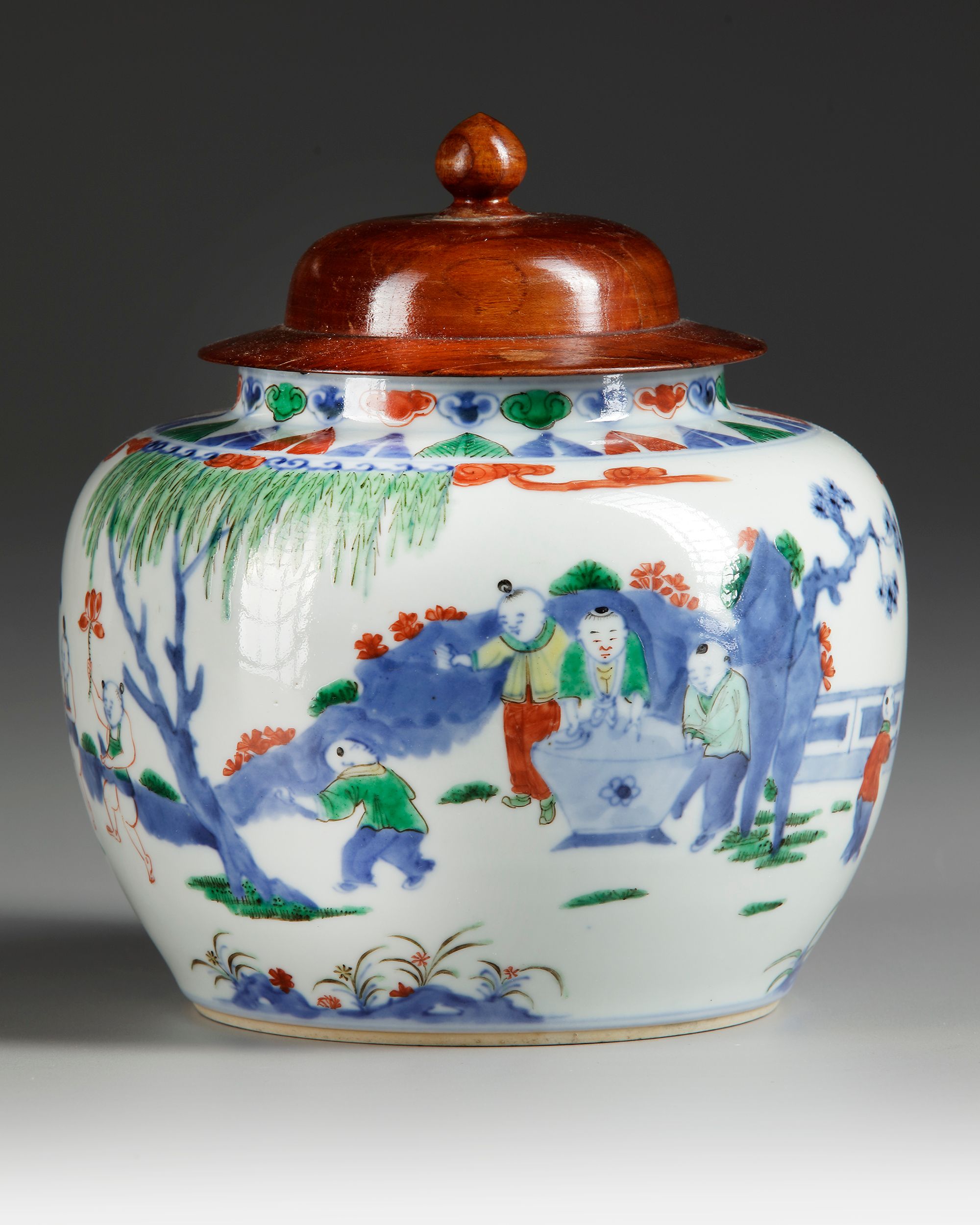 A vibrant wucai porcelain jar decorated with lively scenes of children at play, painted in rich overglaze enamels of red, green, and blue. The jar features a wide body, short neck, and a later wooden cover. The playful figures, floral elements, and bold border patterns.
