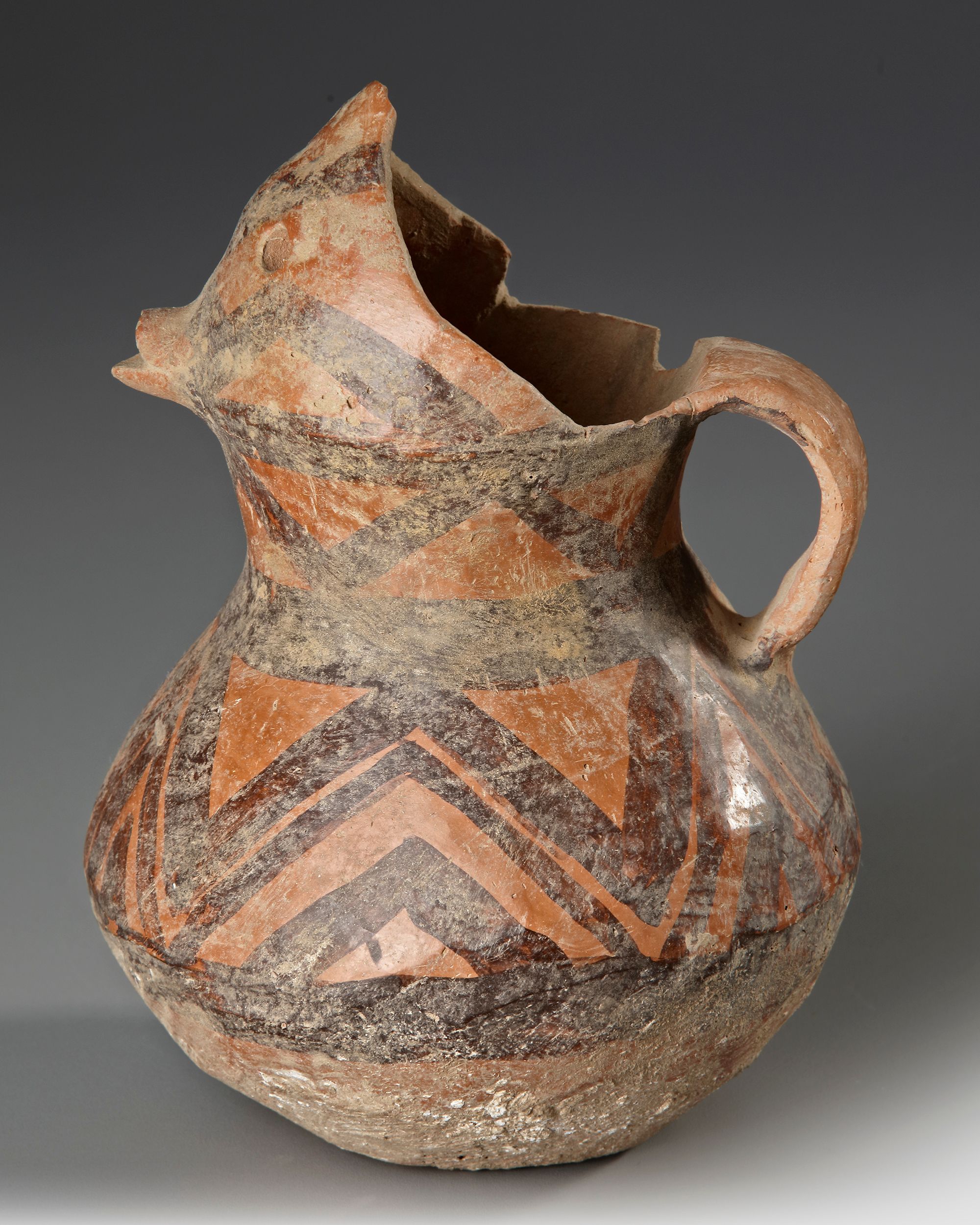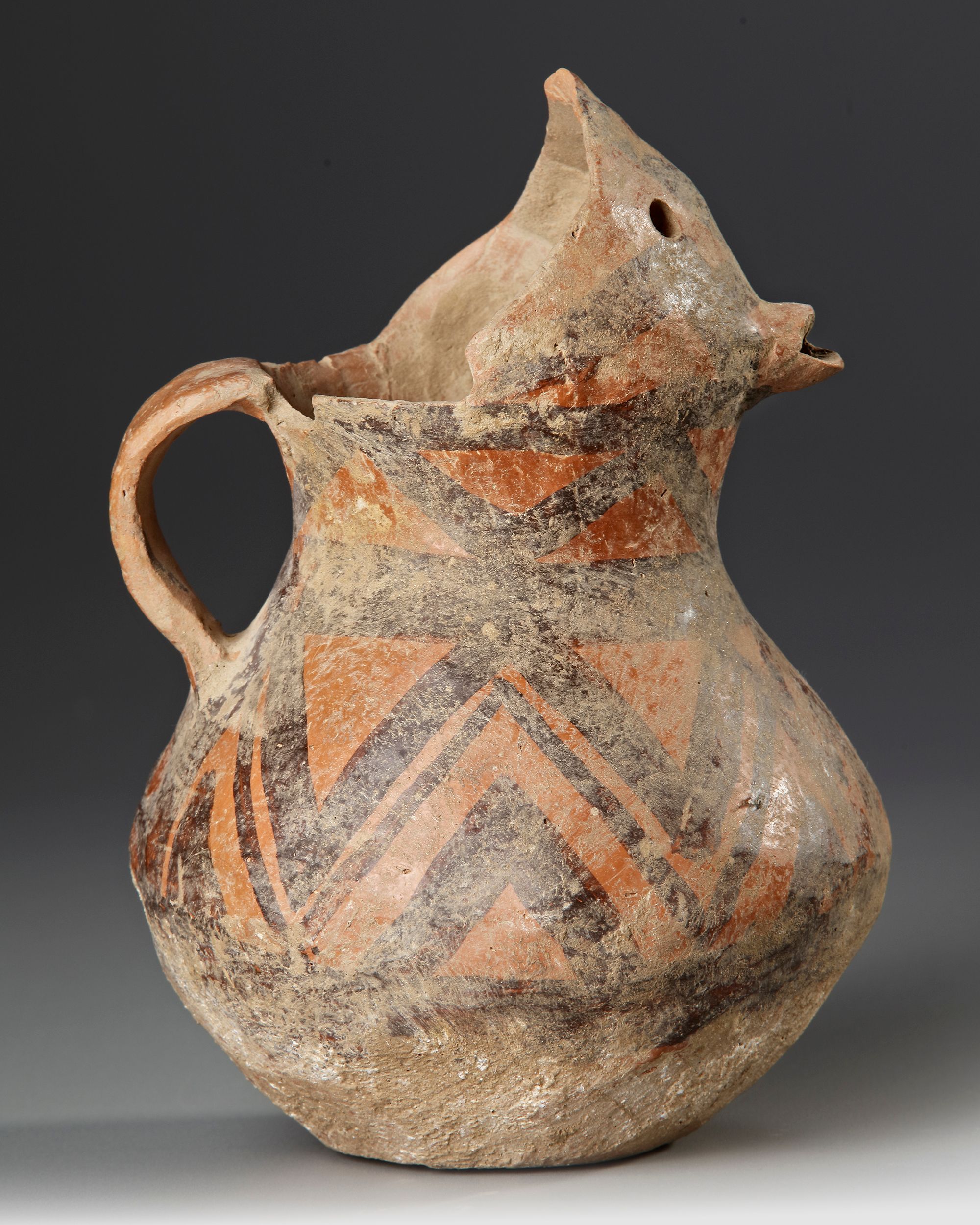 a neolithic pottery jar from the banshan culture, featuring bold geometric painted designs in red and black. its rounded form, loop handle, and stylized animal-shaped spout