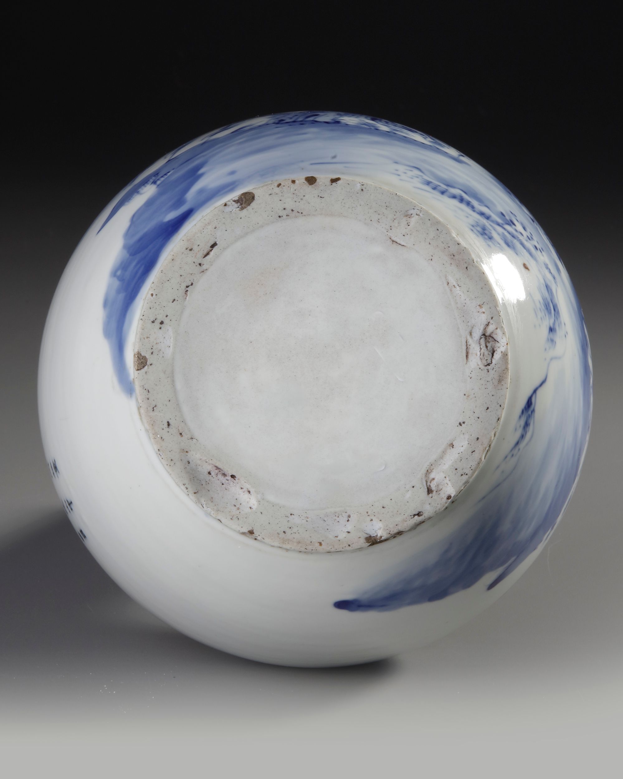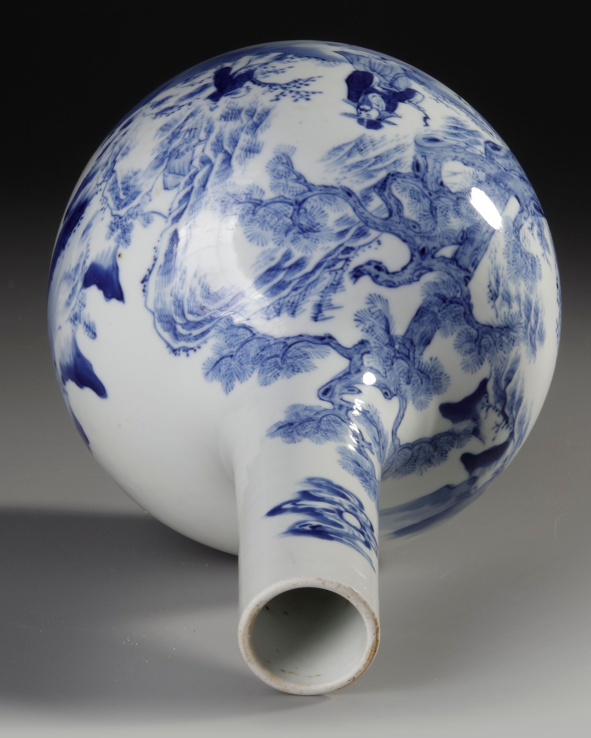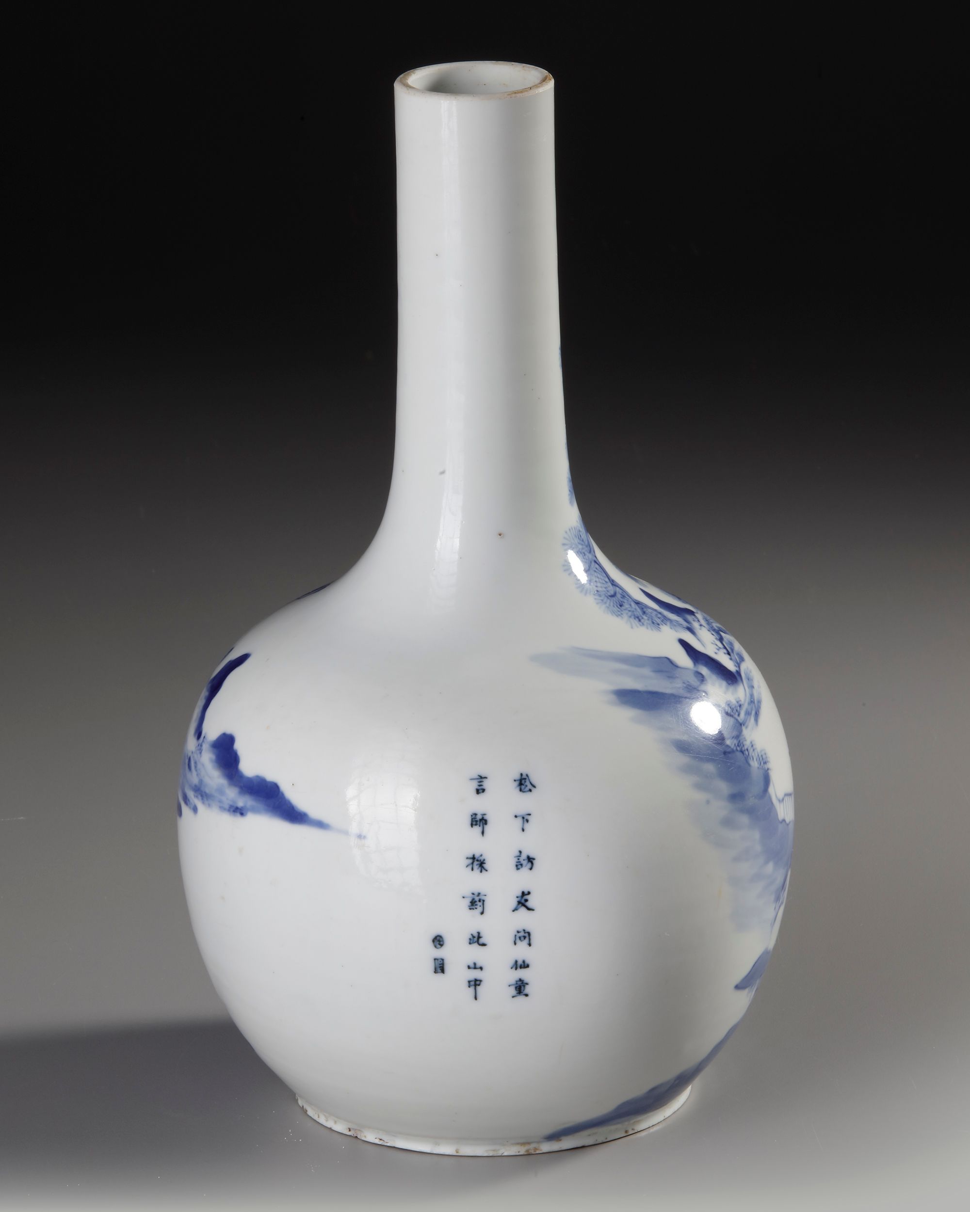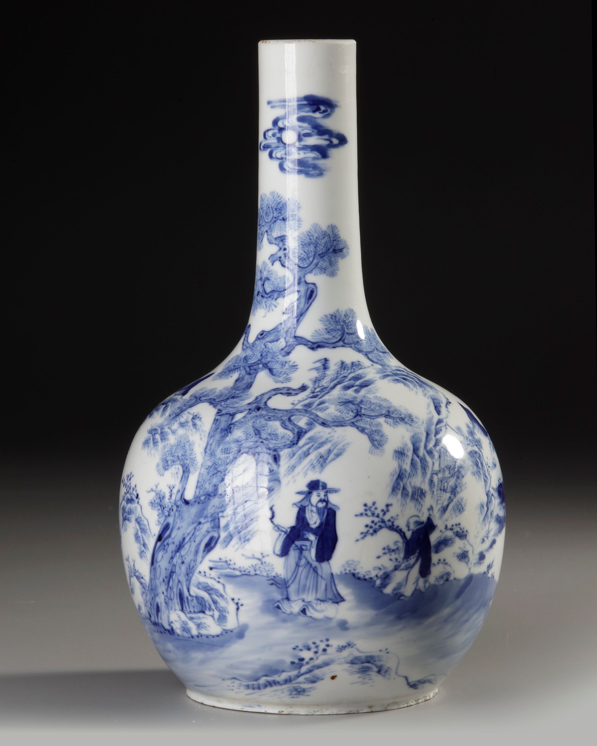 A finely painted Qing Dynasty blue-and-white vase, decorated with an elegant scholar-in-landscape scene . H. 28 cm.