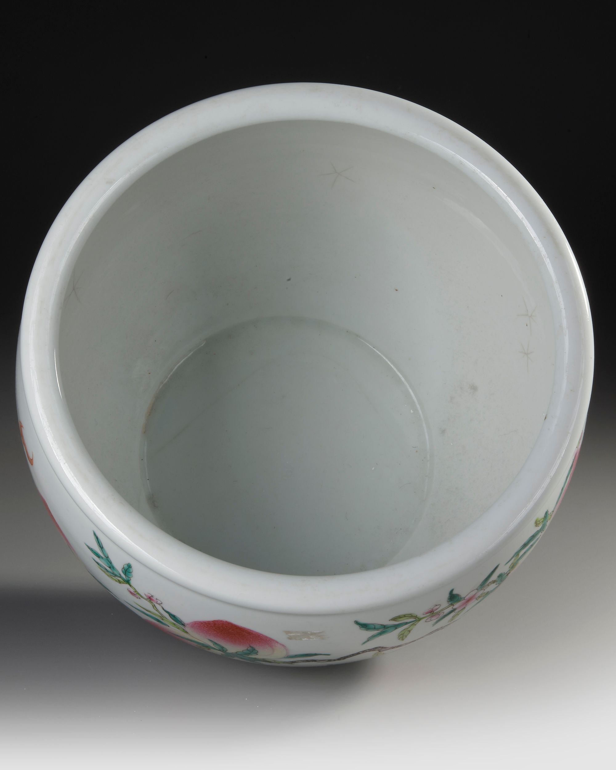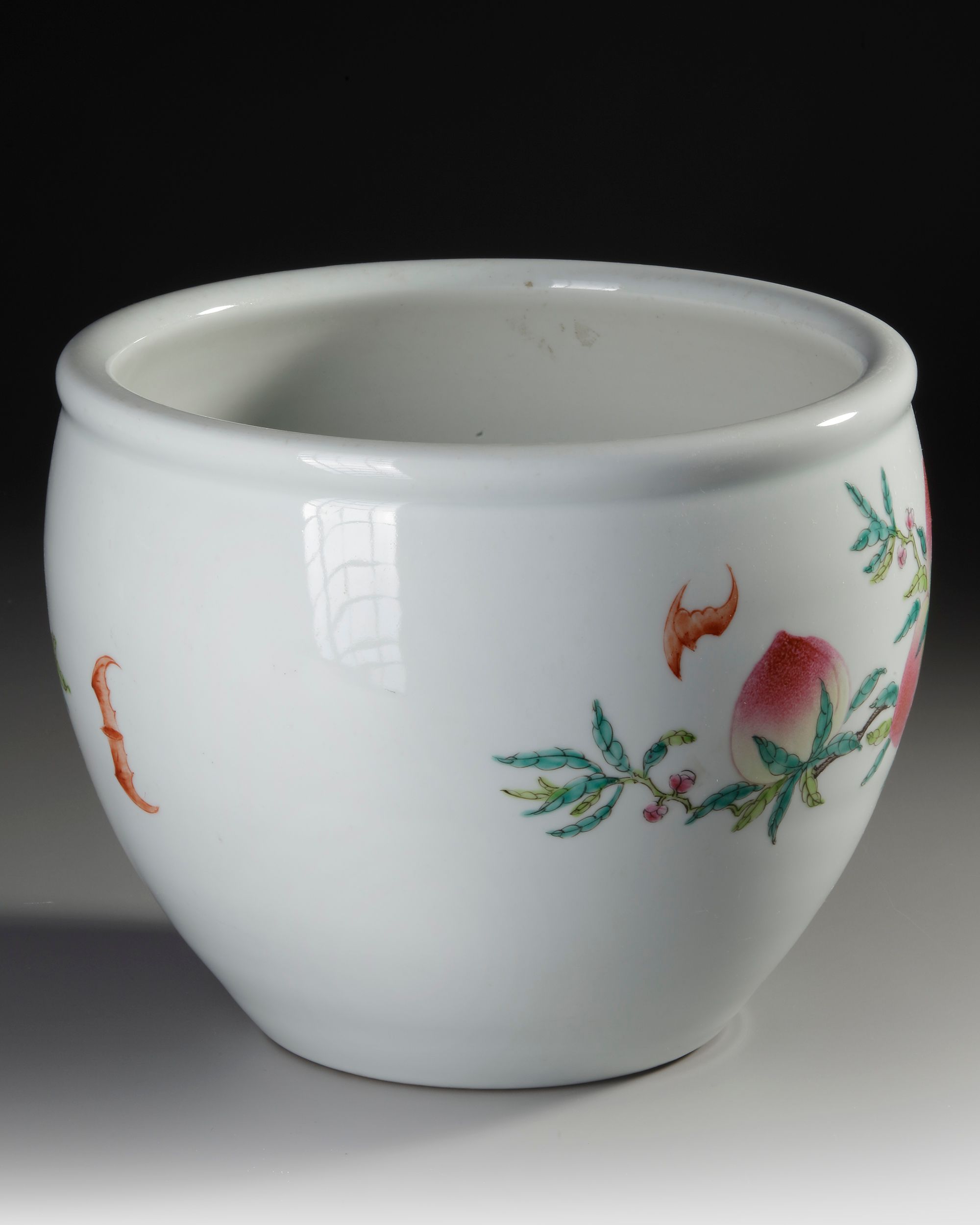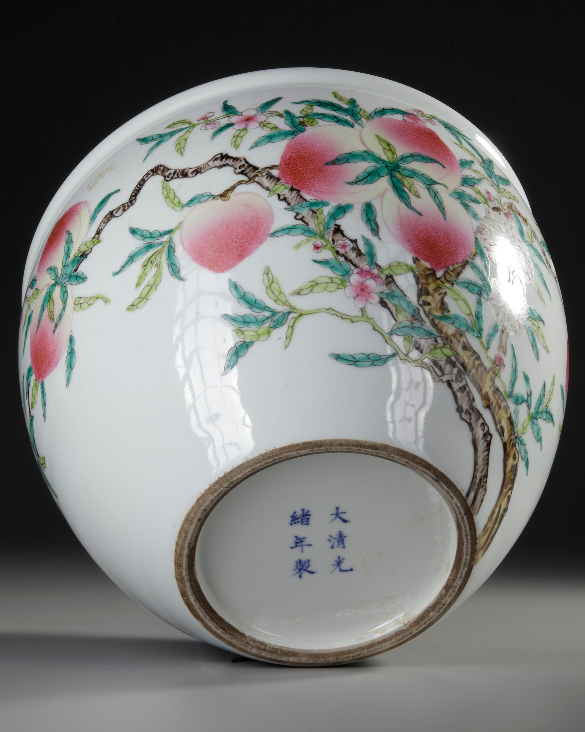 A finely painted famille rose porcelain pot featuring lush peach branches, vibrant blossoms, and delicate foliage rendered in soft enamels. The rounded body displays the traditional longevity peach motif, symbolizing prosperity and long life. Marked on the base with an apocryphal Guangxu reign mark.