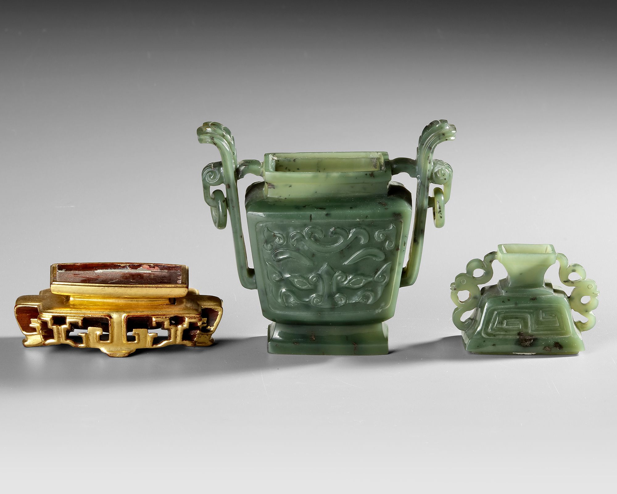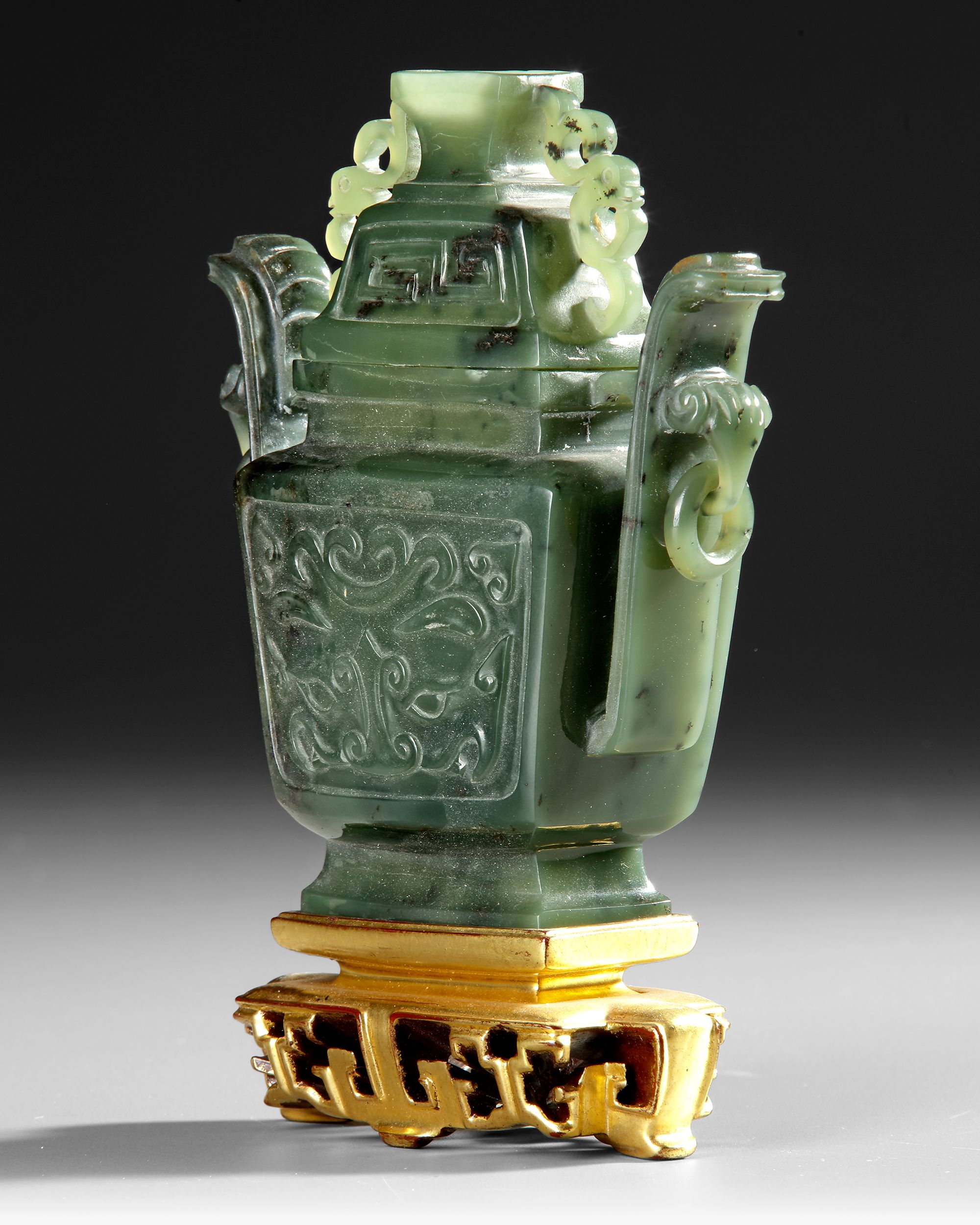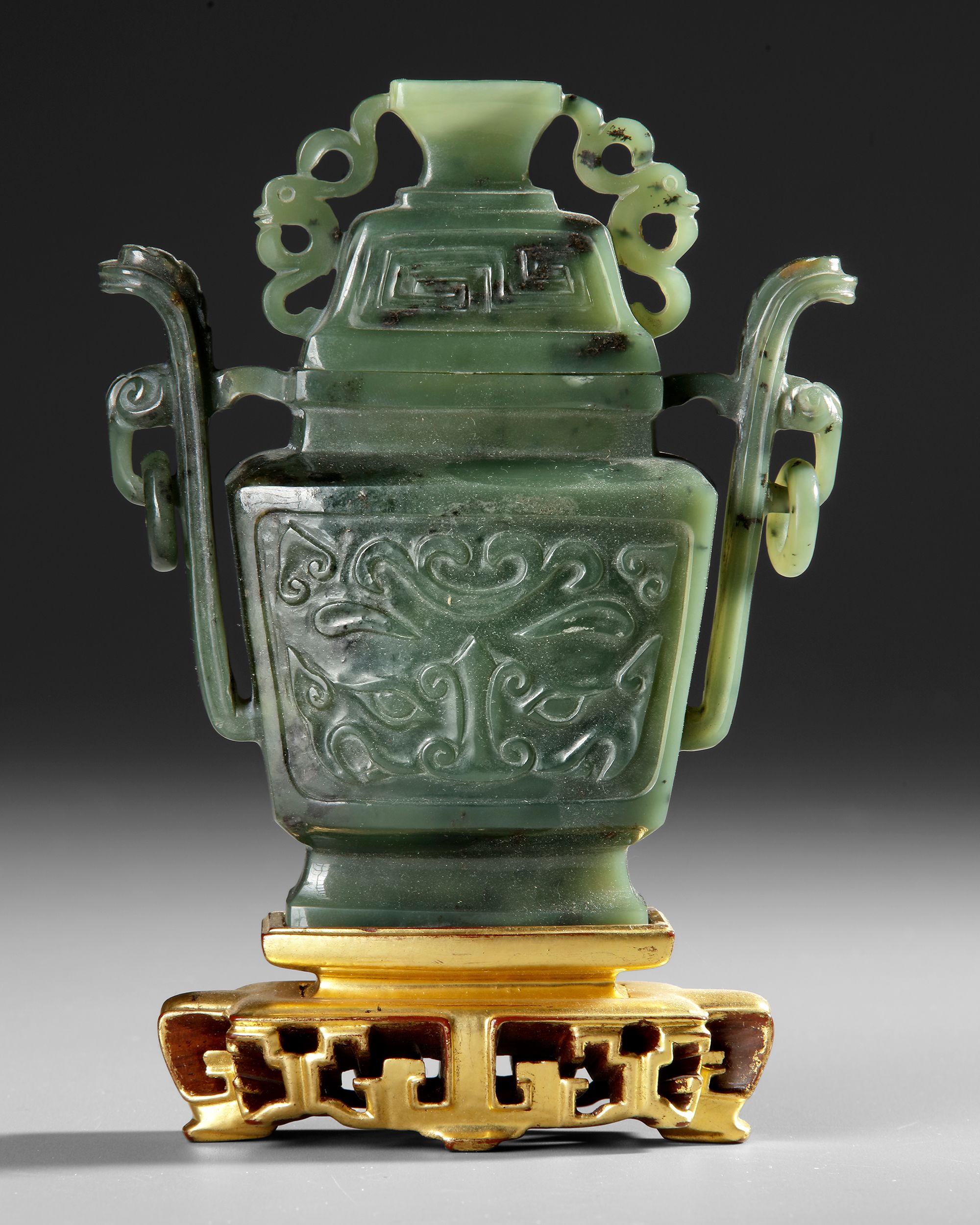 A finely carved Chinese jade vase featuring intricate scrolling motifs, flanked by ornate dragon-form handles. The matching jade cover is adorned with pierced decorative elements, all resting on an elegant gilt and lacquered wooden stand.