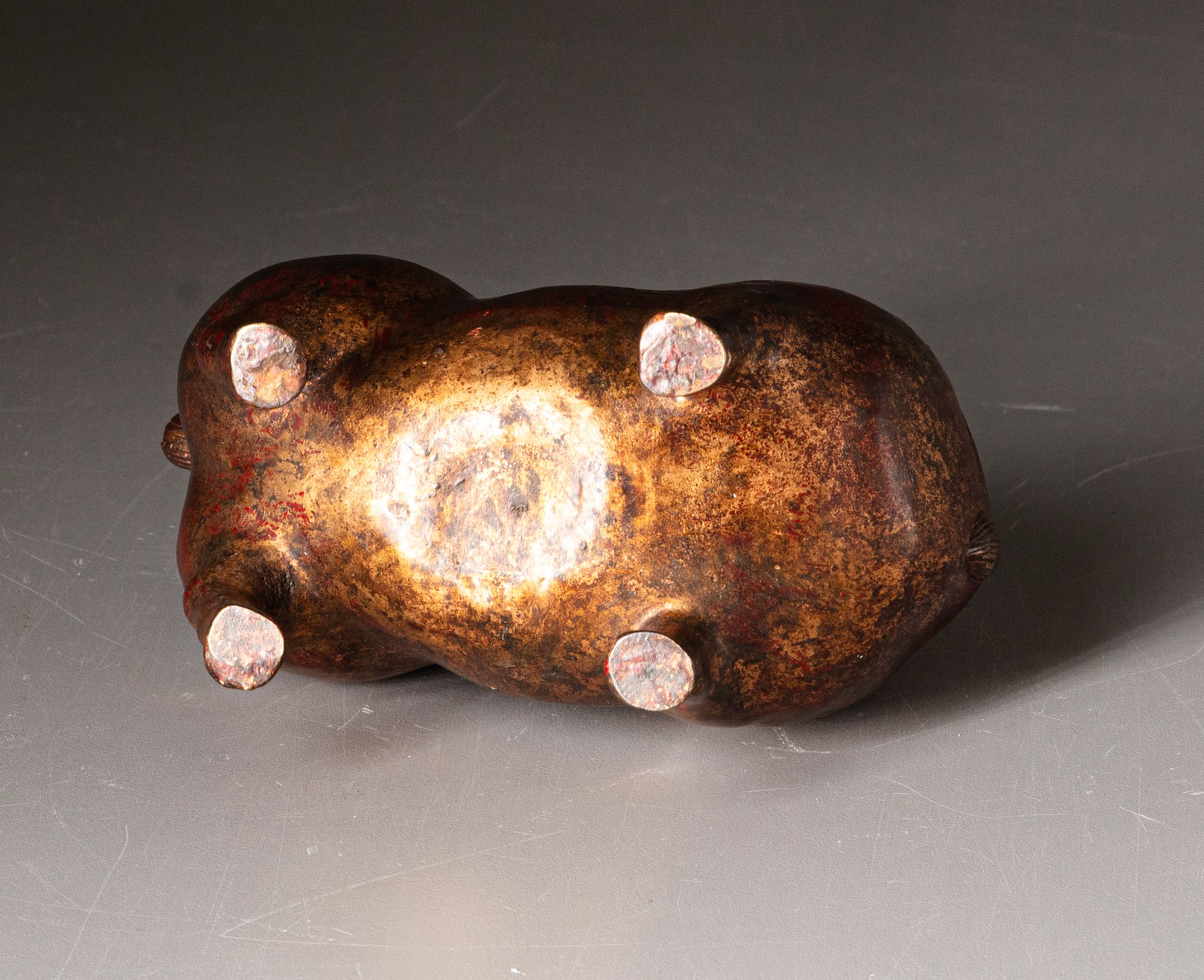 A Chinese cast bronze horse features a rounded, exaggerated form with a pronounced mane, detailed saddle, and small yet sturdy legs with traces of gilding.