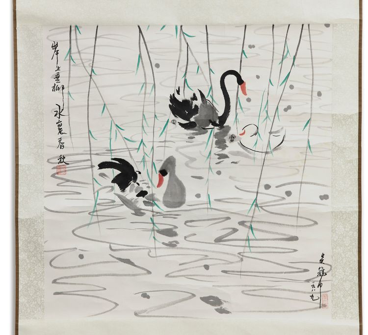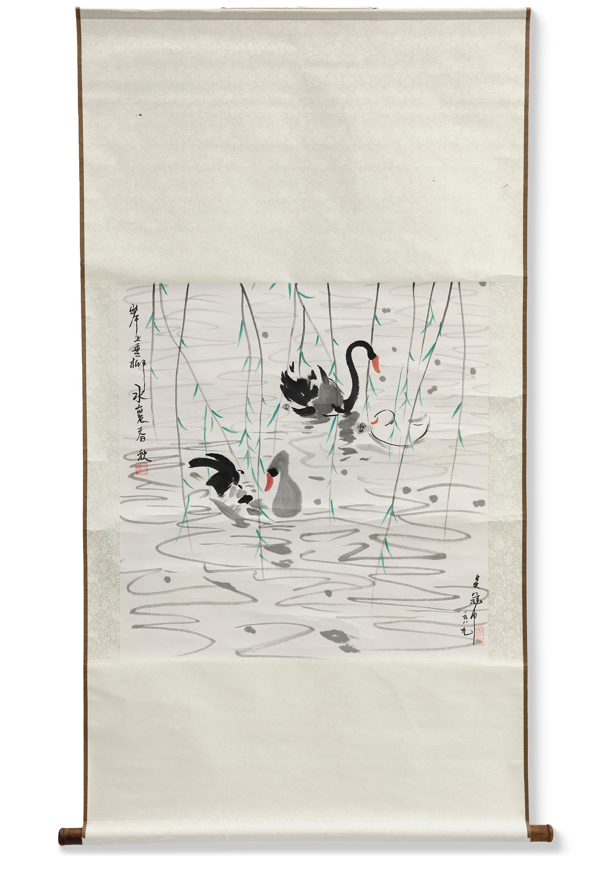 Elegant Chinese hanging scroll depicts graceful black swans gliding through calm water beneath delicate willow branches. The composition combines expressive ink brushwork with subtle color accents, creating a peaceful and poetic scene.