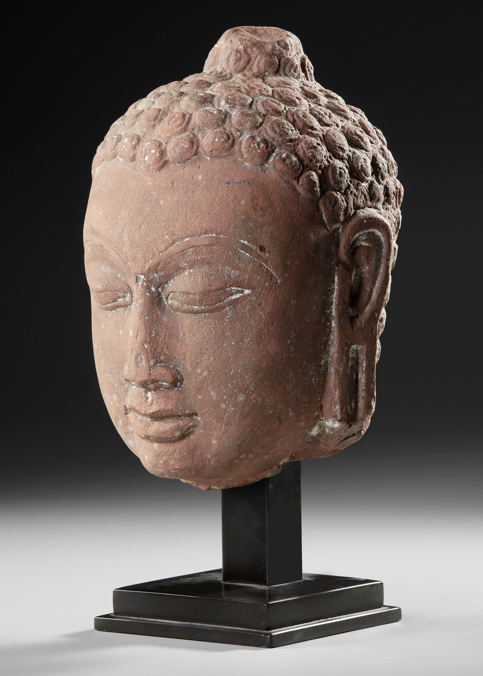 Stone sculpture of a Buddha head from India . The serene expression, softly modeled features, and stylized curled hair reflect the spiritual idealism characteristic of Gupta Buddhist sculpture. The elongated earlobes and calm meditative gaze symbolize wisdom and enlightenment.
