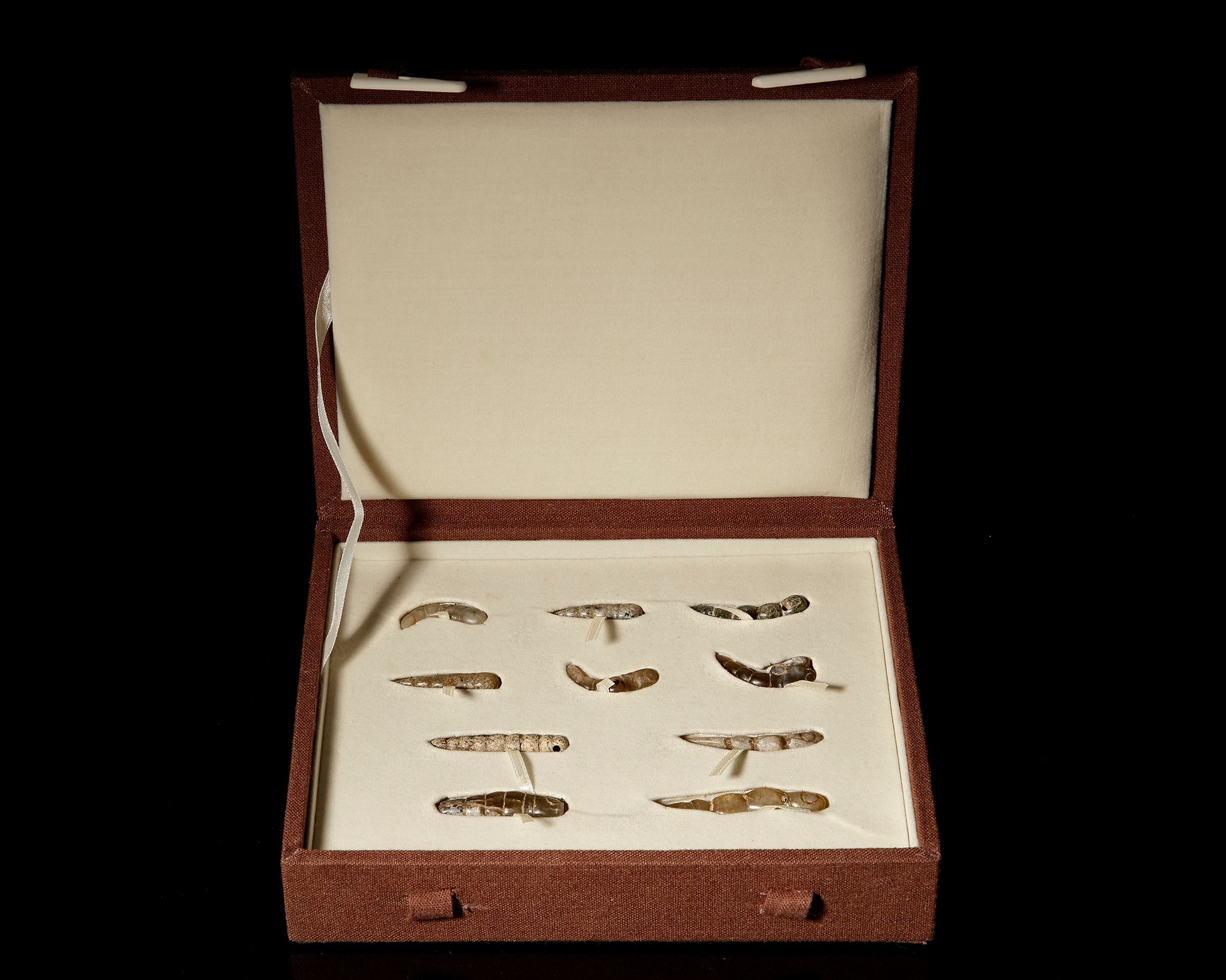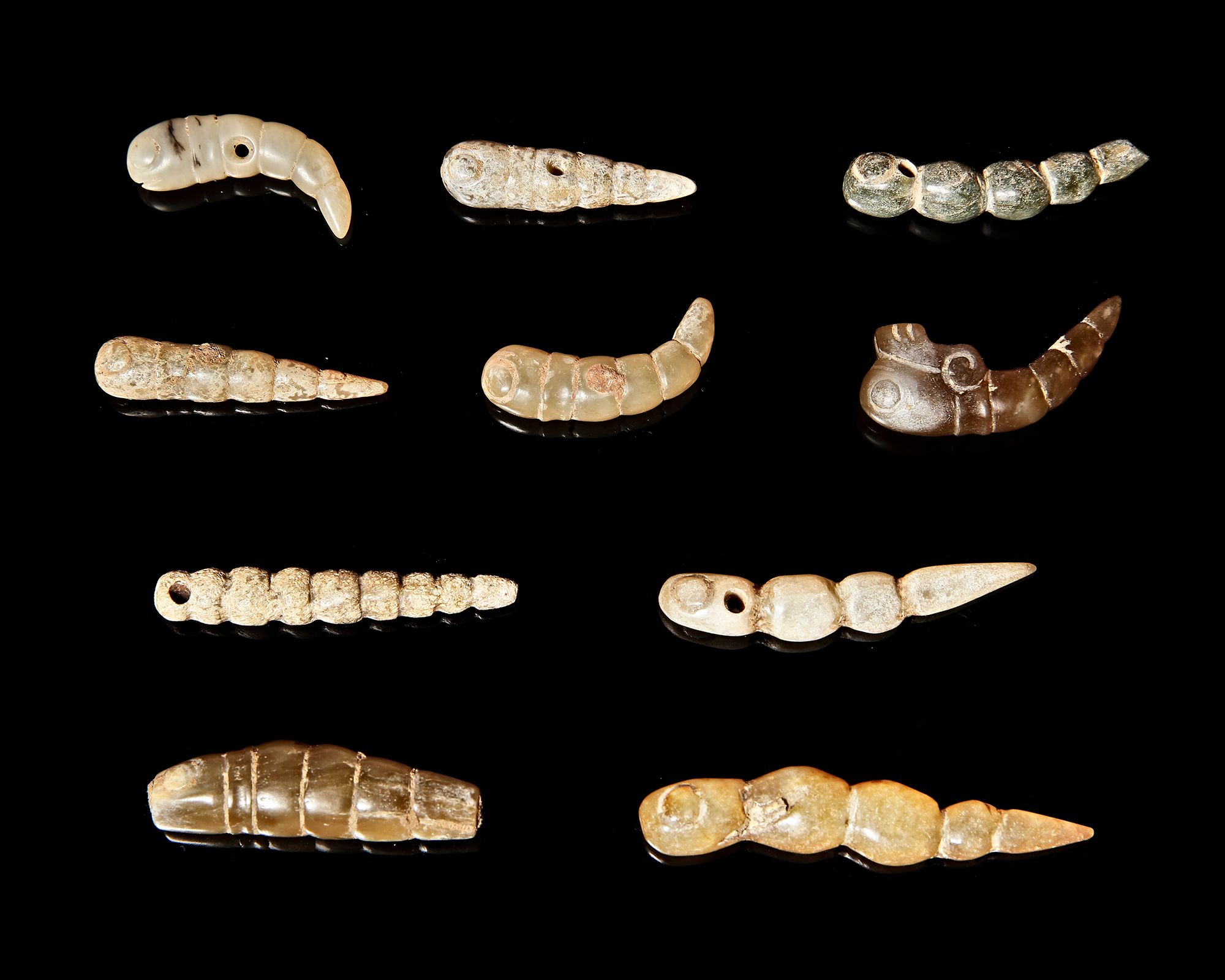 A rare set of ten small jade pendants carved in the form of silkworms . Each pendant is finely shaped with segmented bodies and subtle details that capture the natural form of the silkworm.