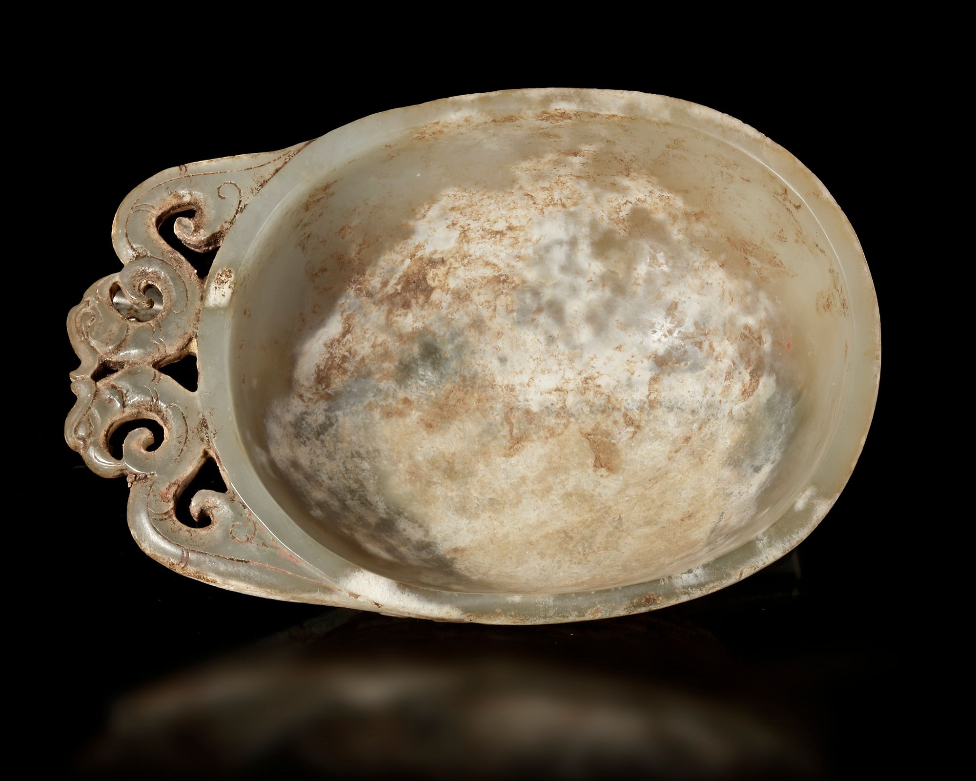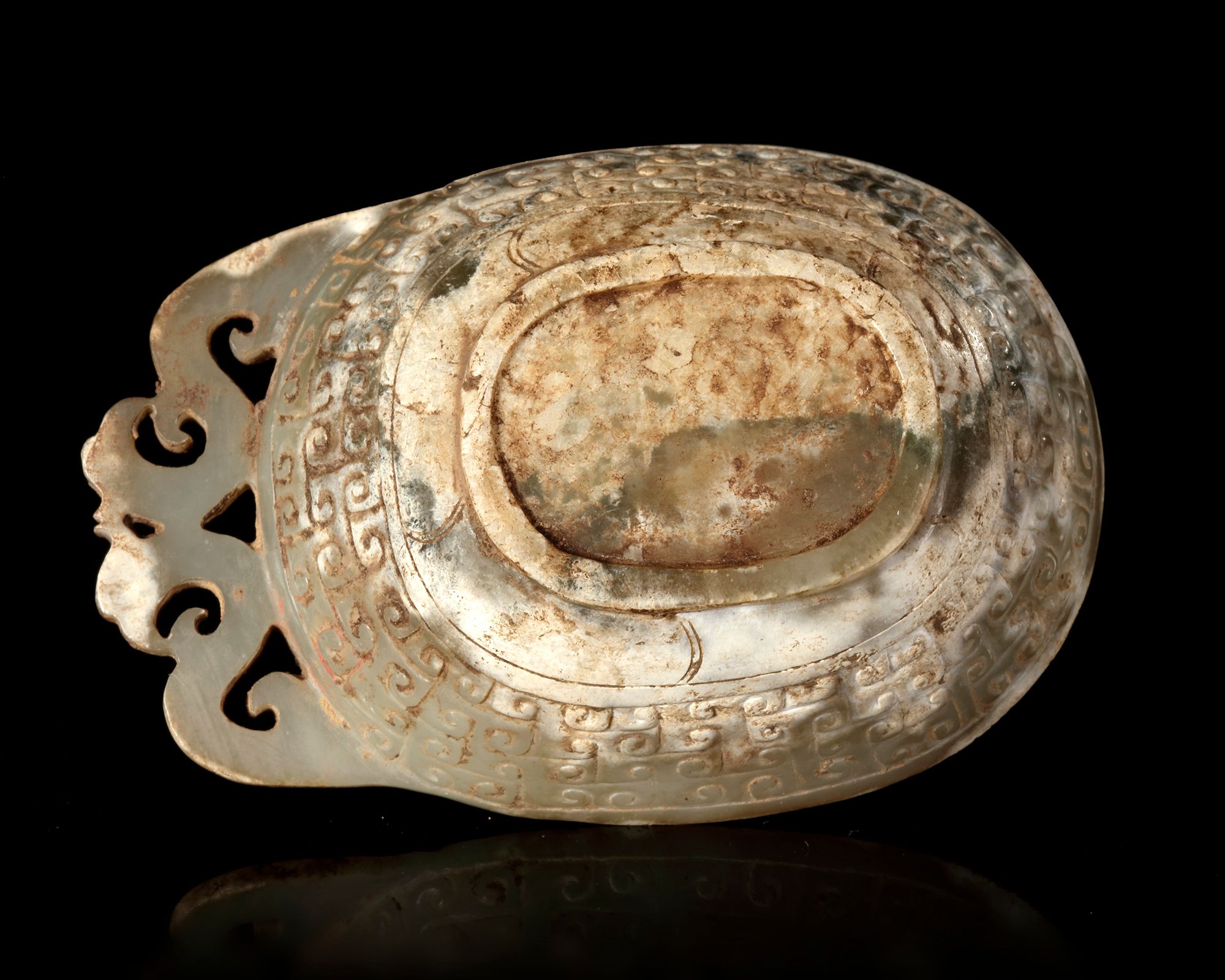 A finely carved grey jade vessel . The shallow bowl features a gracefully curved body decorated with repeating archaistic scroll motifs inspired by earlier bronze ritual designs. One side is formed with an elegant openwork handle, adding both balance and decorative refinement to the piece.The jade shows natural mottling and earthy inclusions,