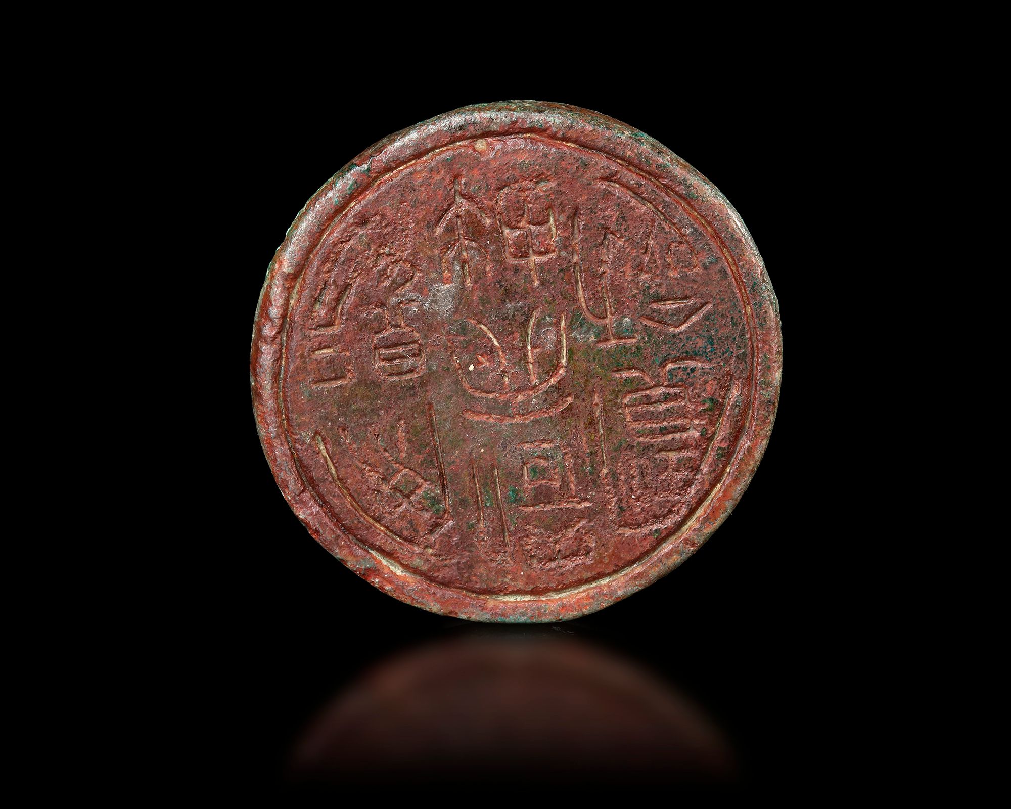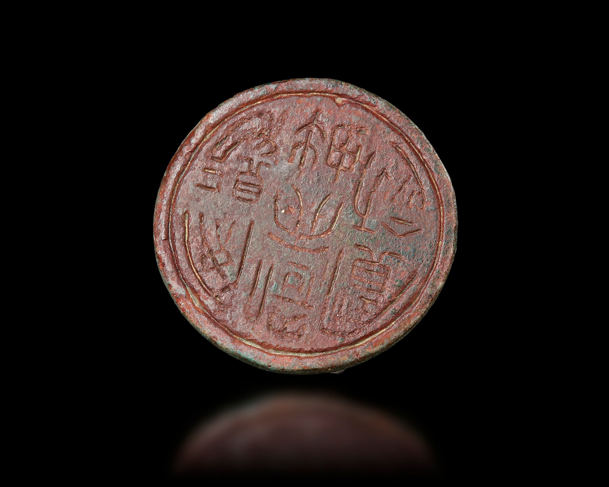A small cast bronze weight dating to the , featuring a domed body with a loop handle at the top for easy handling and suspension. The base bears an incised inscription indicating its official standard use. The surface shows natural green and red patination typical of ancient bronze.
