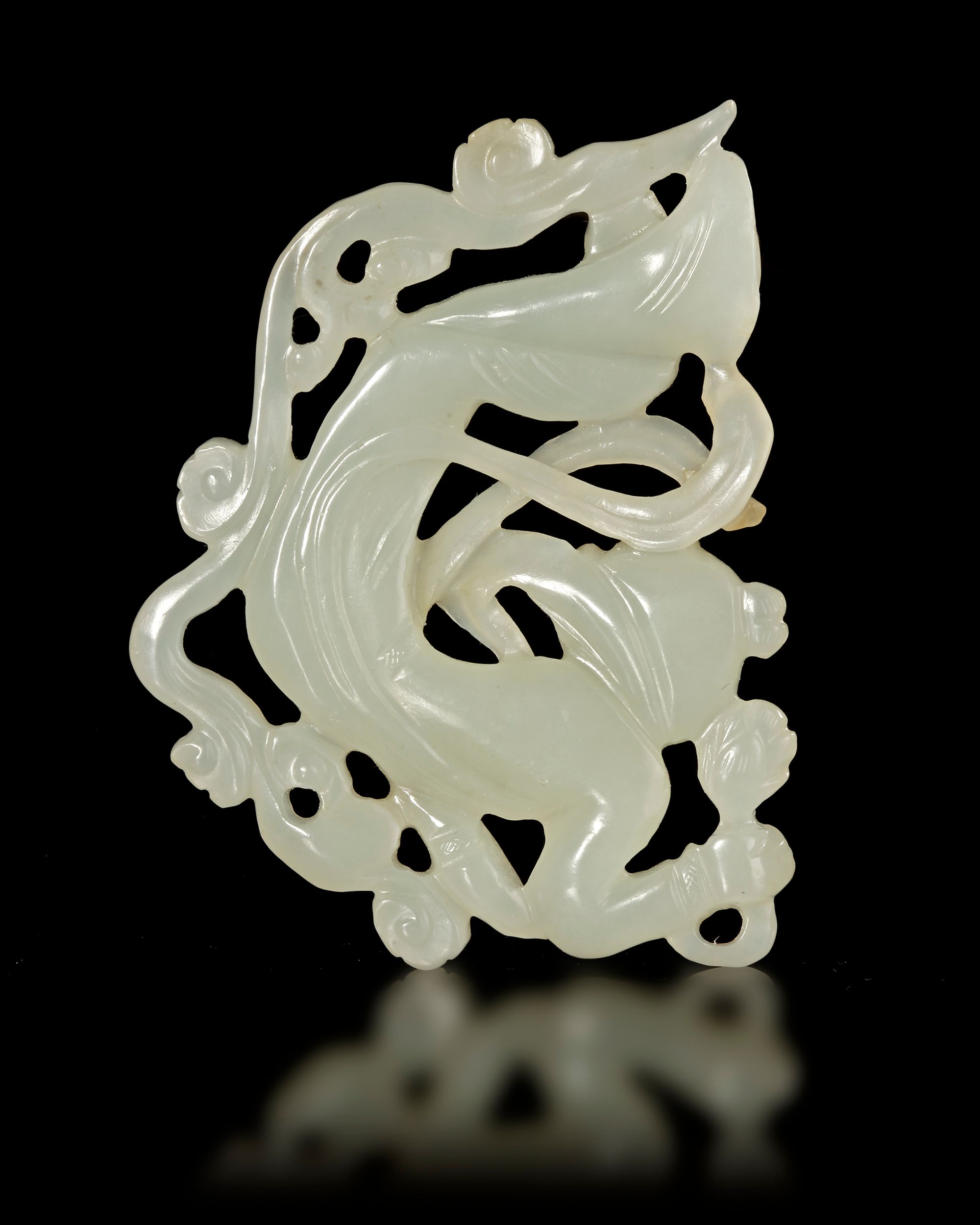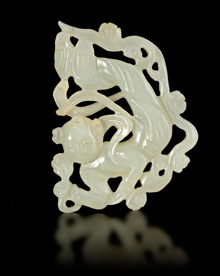 Finely carved openwork pendant in white jade depicting an elegant apsara (celestial dancer) surrounded by flowing ribbons and stylized clouds. The delicate carving and fluid movement reflect the refined aesthetic of Ming dynasty jade craftsmanship. The stone shows a soft, translucent white tone with natural inclusions that enhance its character.