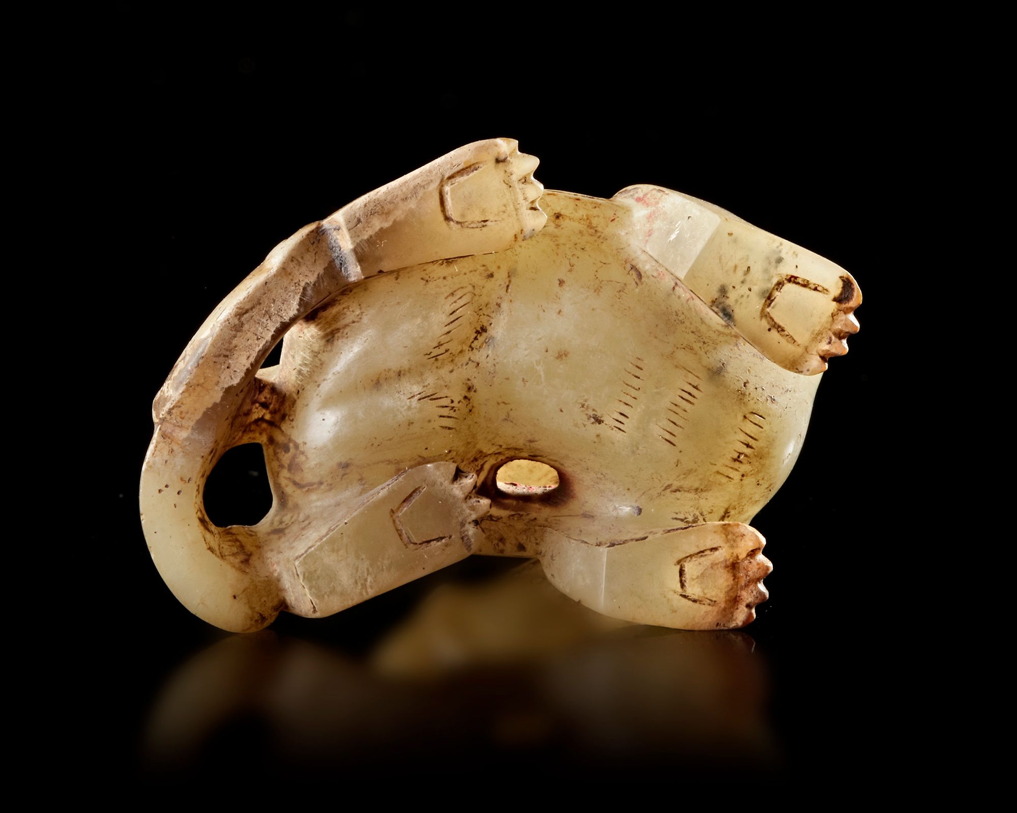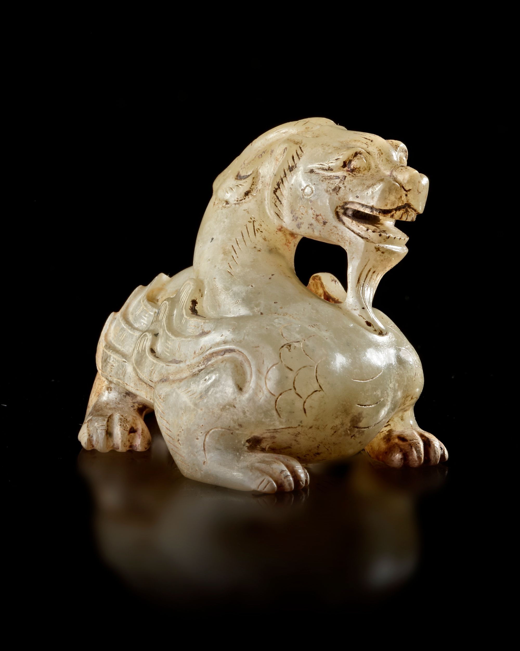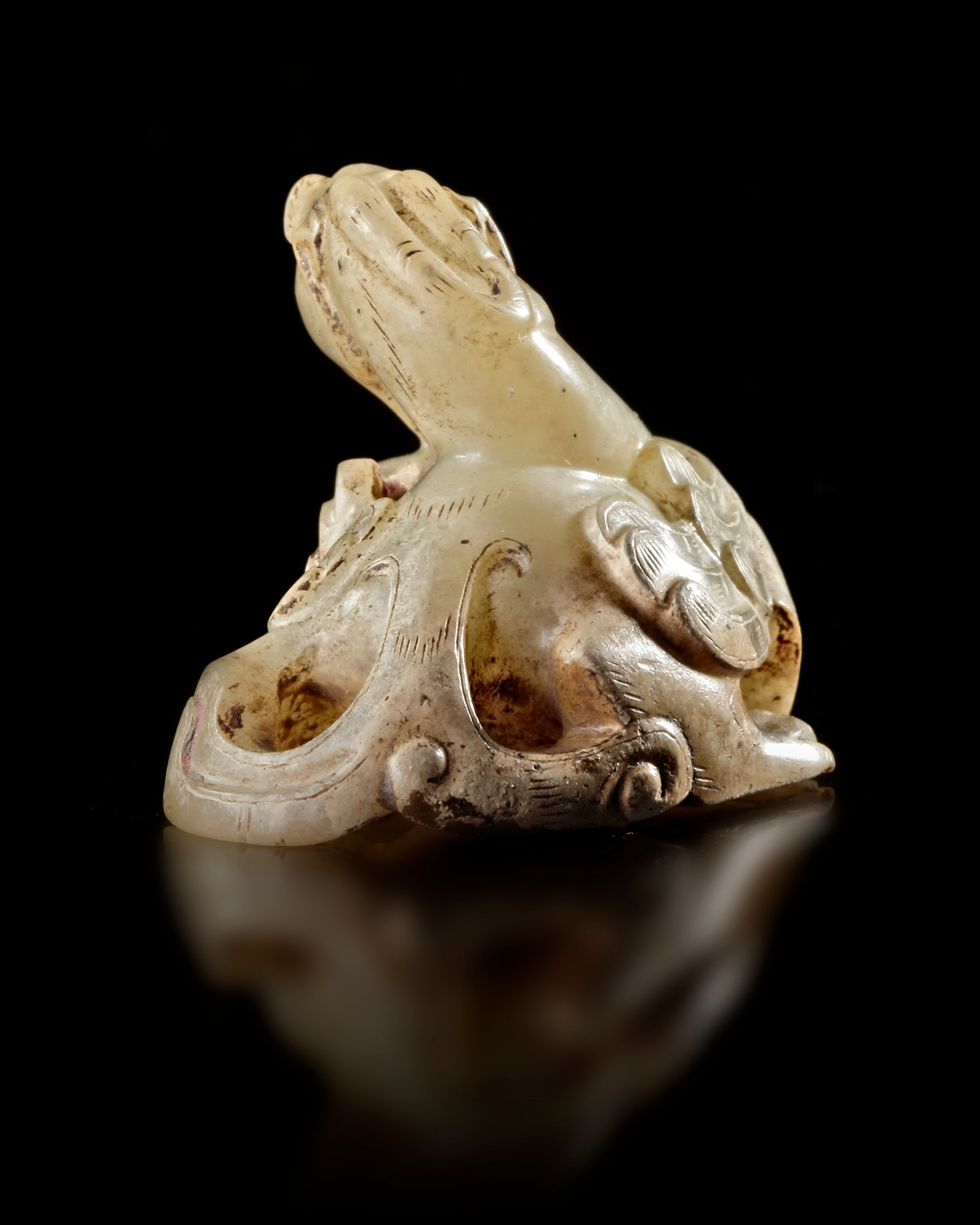Small carved jade figure depicting a mythical animal with stylized wings and expressive features ,