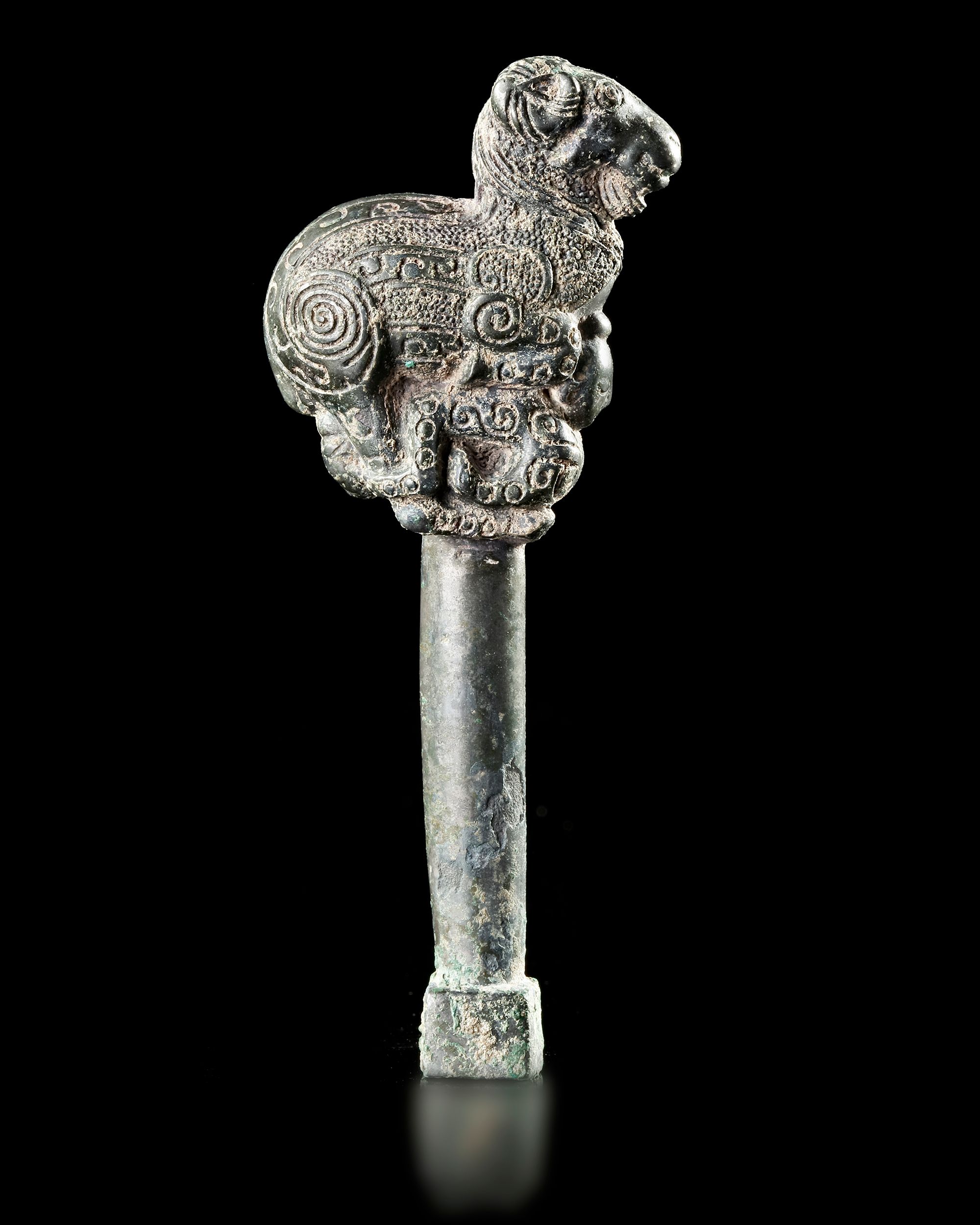 Finely cast bronze key surmounted by a sculptural ram’s head, richly decorated with swirling motifs . The detailed animal form reflects both symbolic protection and refined craftsmanship,