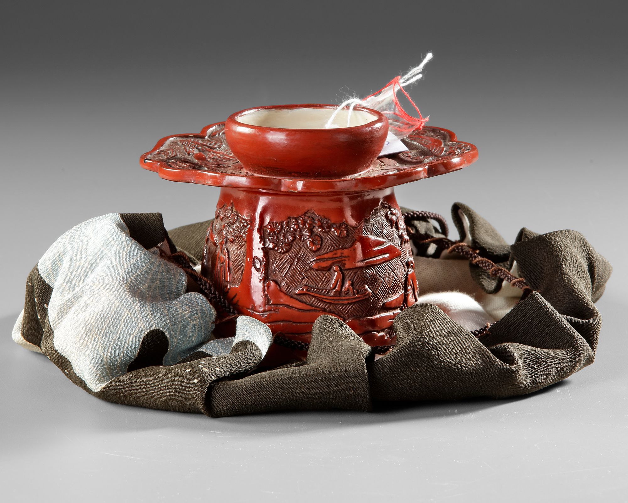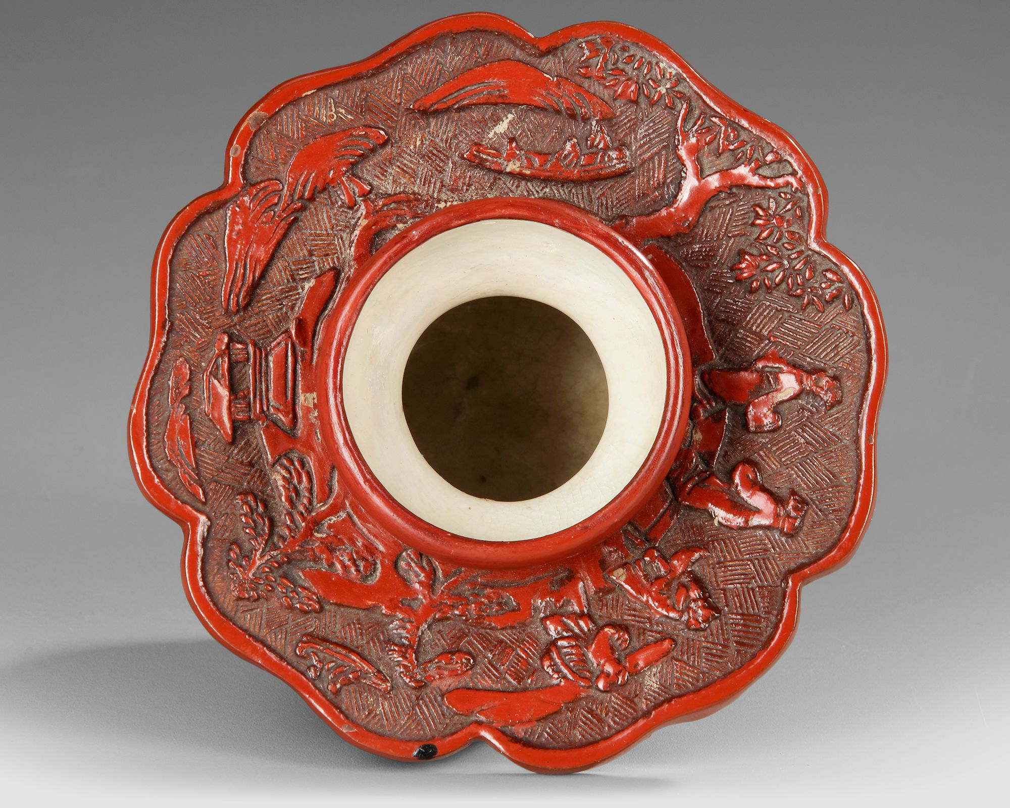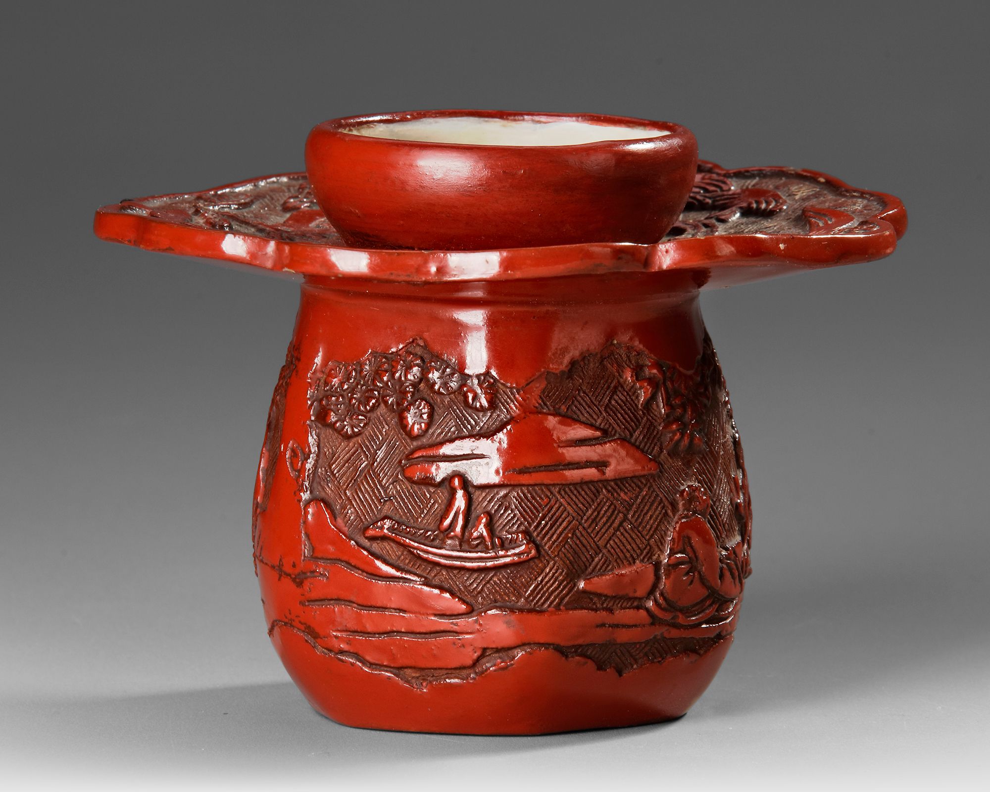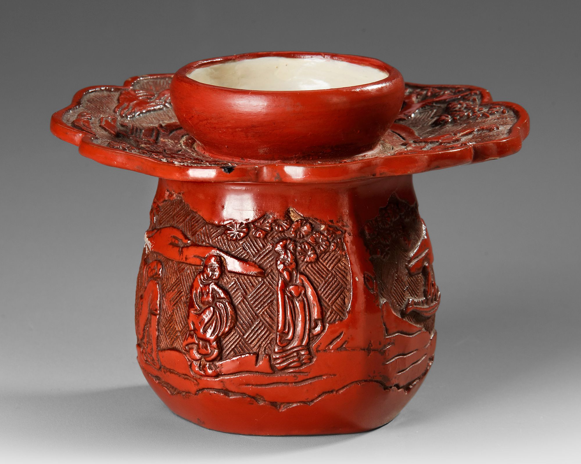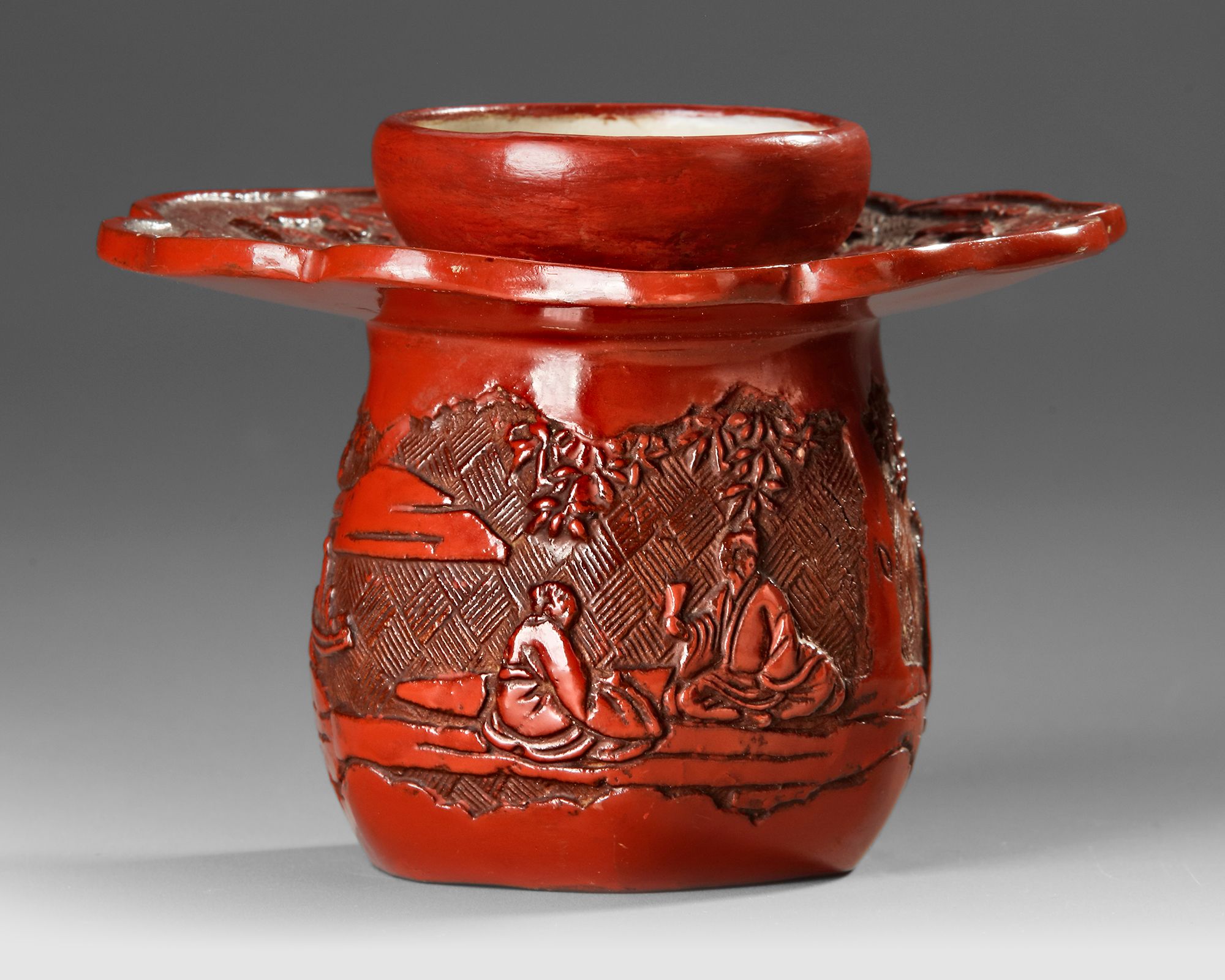 Finely crafted red lacquer vessel is decorated with deeply carved relief scenes depicting scholars in a landscape setting, surrounded by trees and architectural elements. The richly layered lacquer surface shows the characteristic depth and glossy finish associated with traditional Chinese lacquer work. The scalloped rim and detailed carved motifs reflect the refined decorative style of the Qing dynasty. Such objects were often used as elegant containers or scholar’s desk pieces,