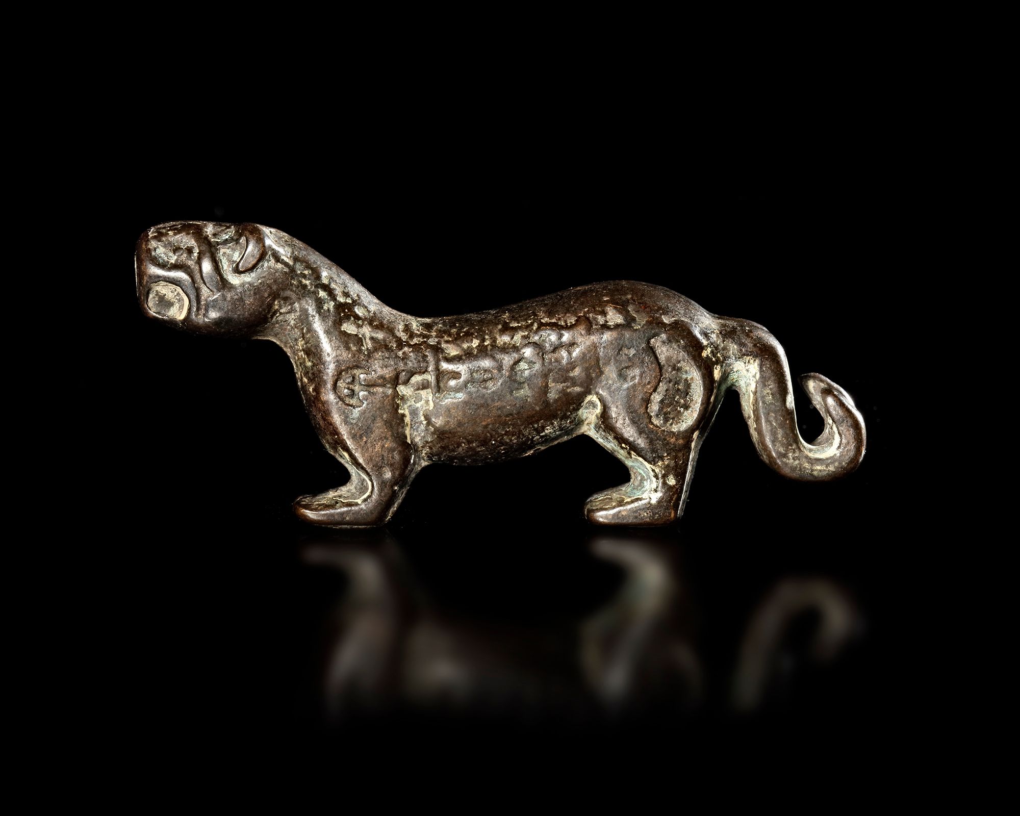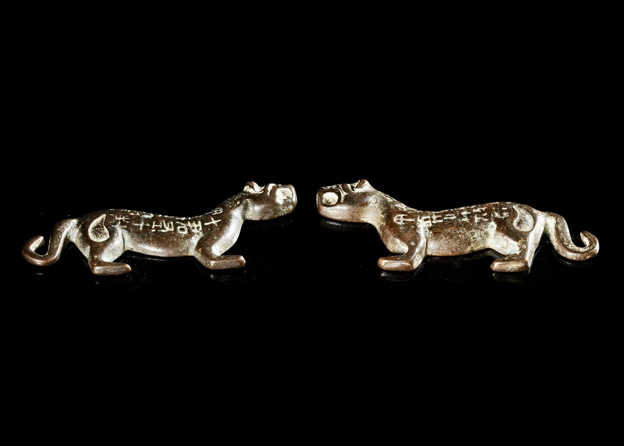 A finely cast bronze tally in the form of a stylized animal. The piece features engraved characters along the body, typical of ancient Chinese tally tokens used for identification, authority, or official verification.