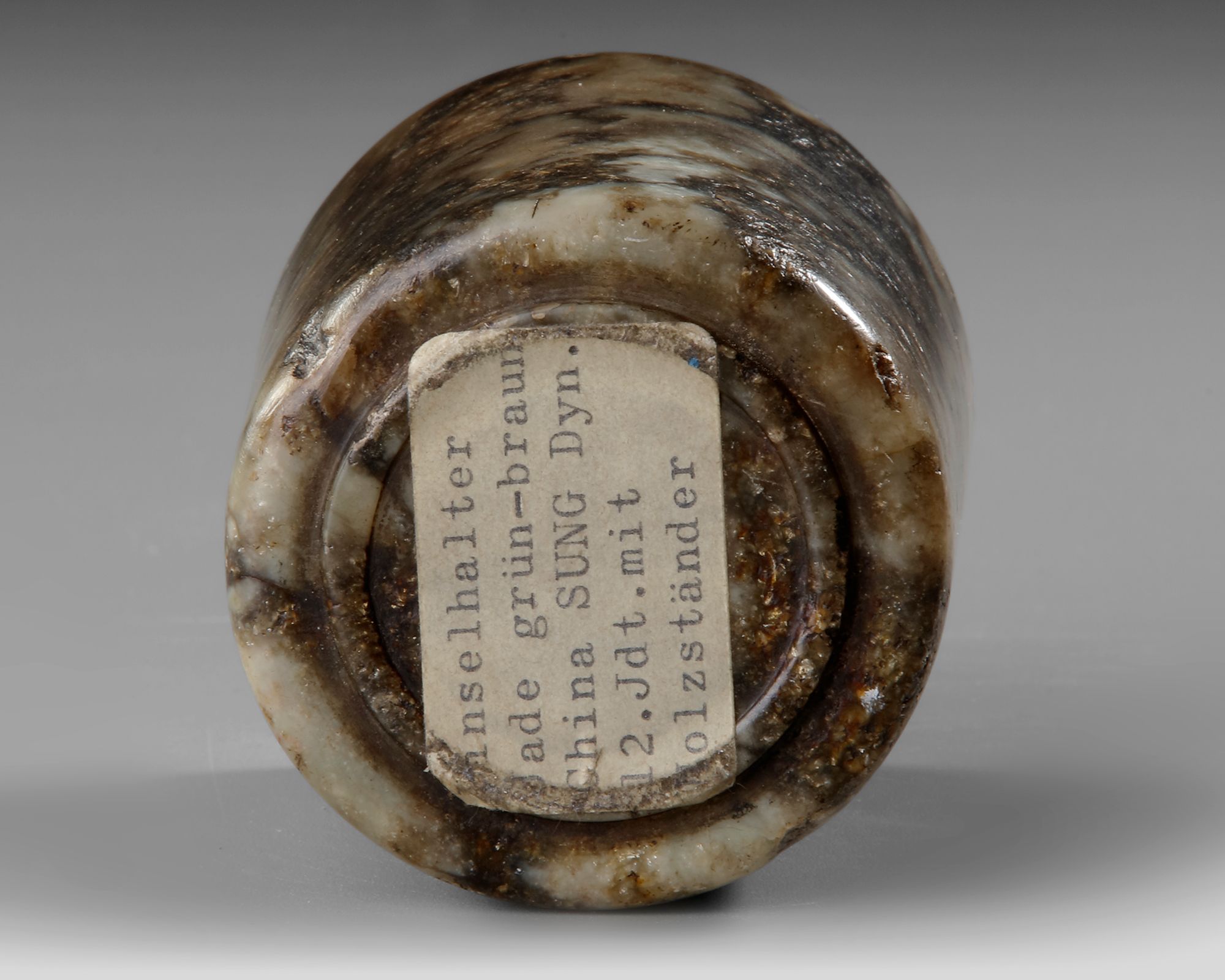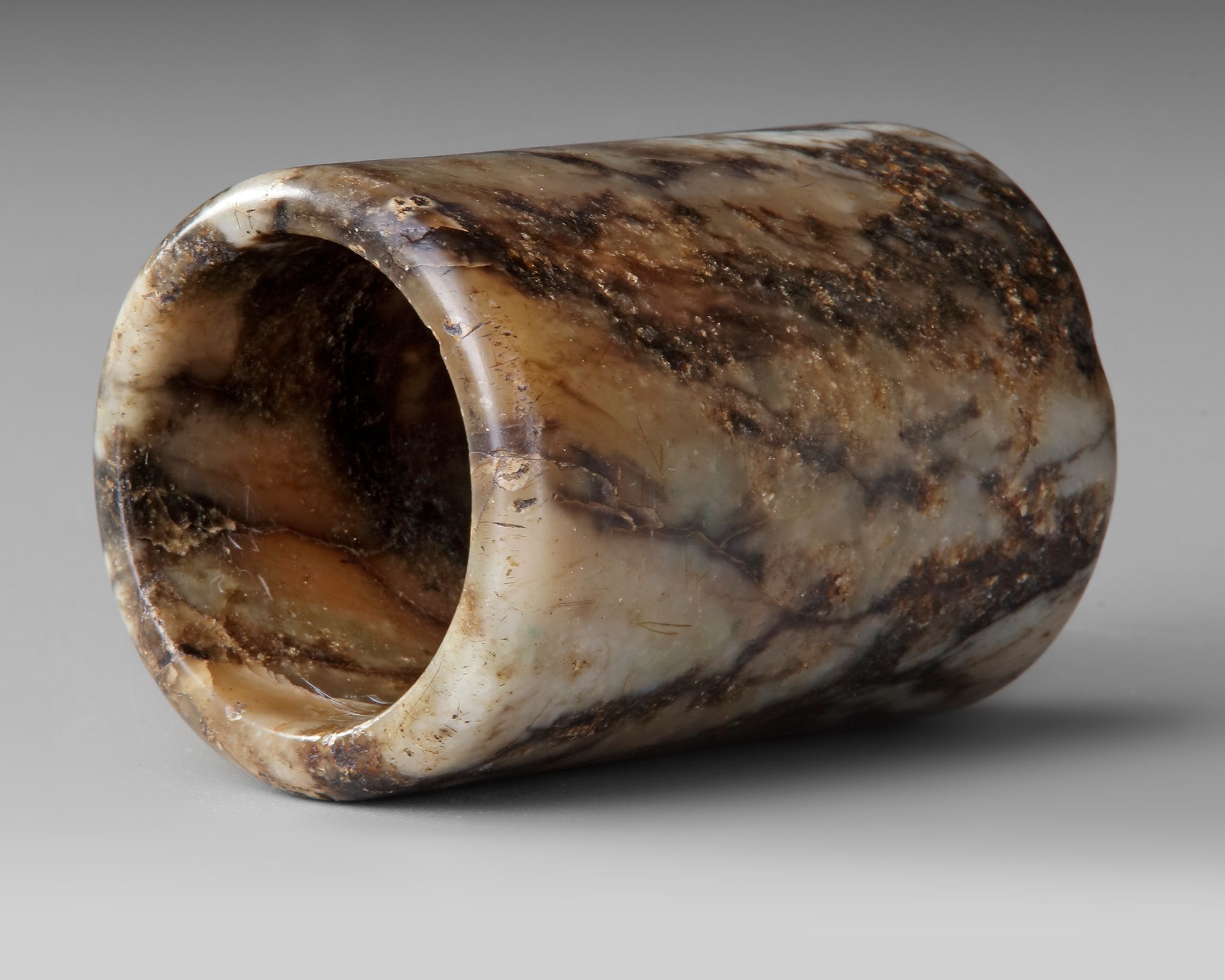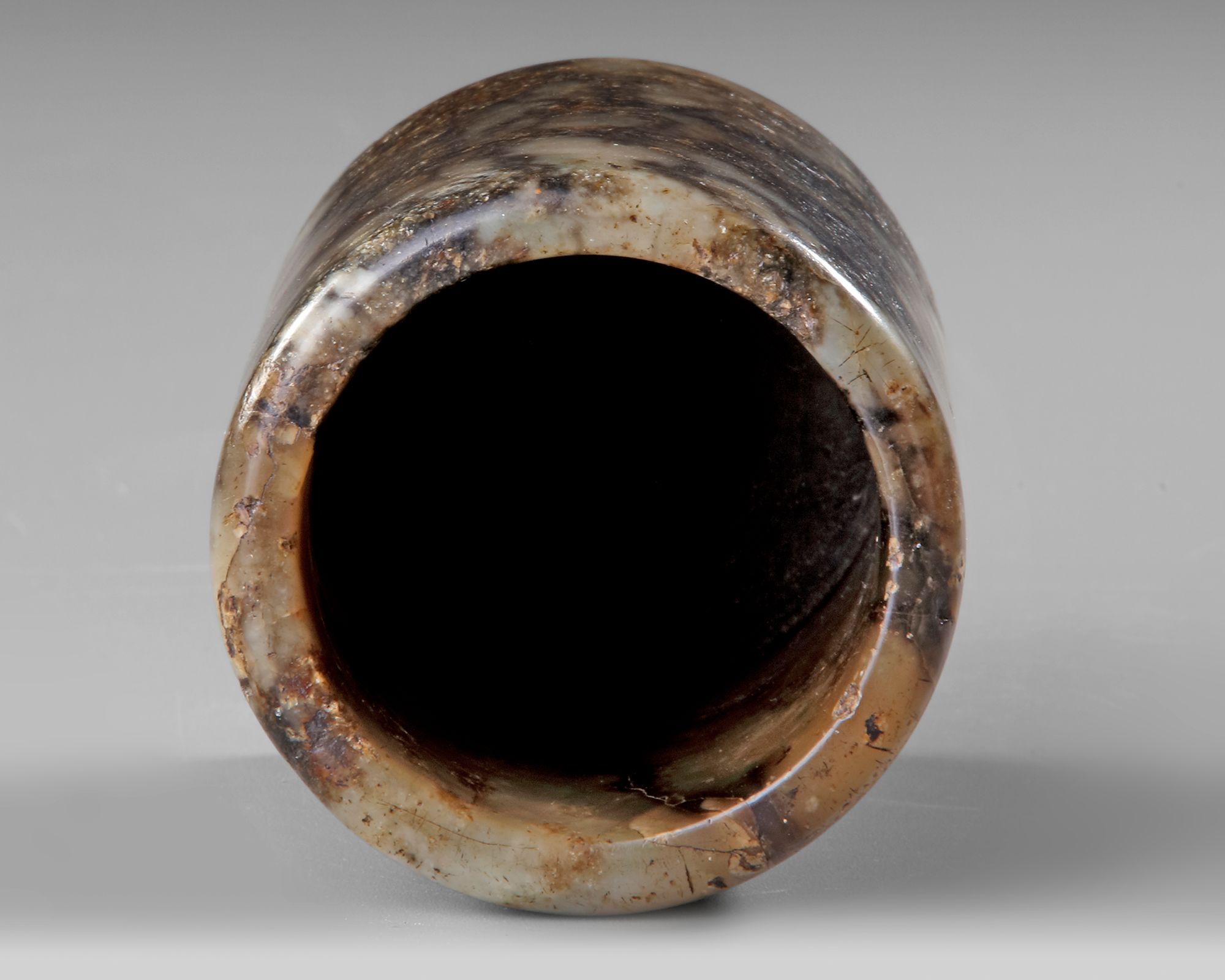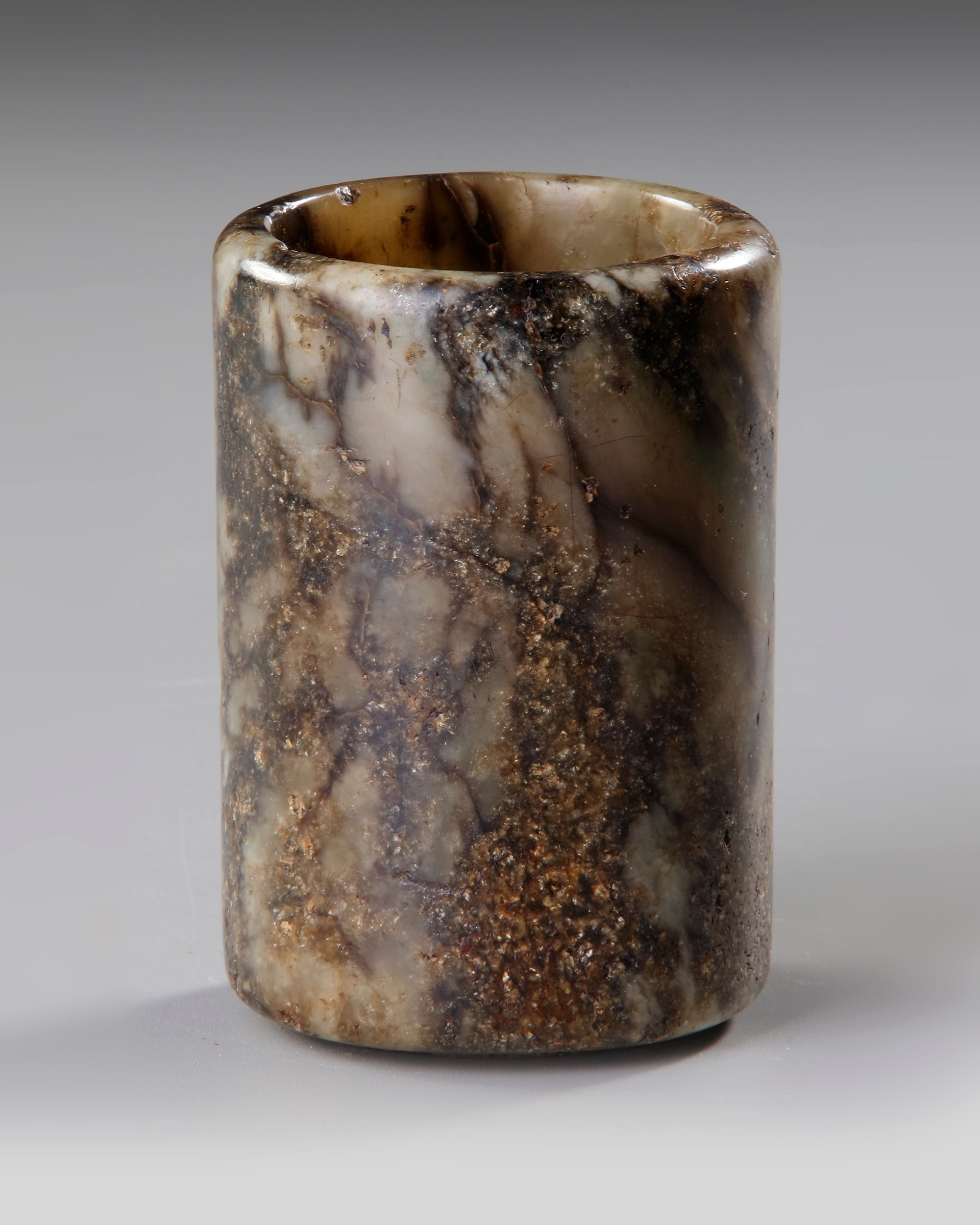 A beautifully polished brown jade brush holder. The cylindrical form highlights the stone’s striking natural marbling in shades of cream, amber, and dark brown, creating a landscape-like pattern across the surface.