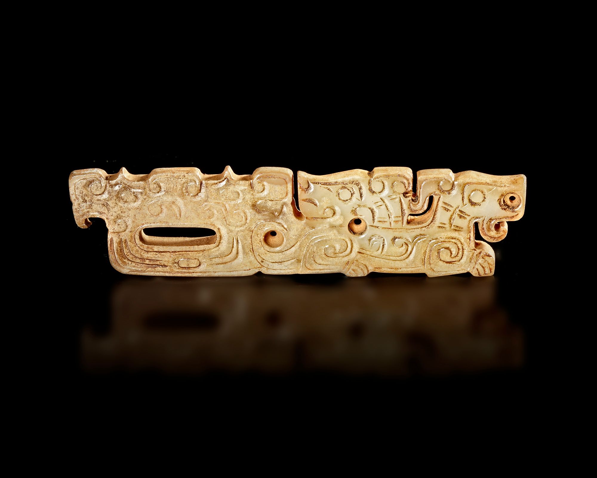 A finely carved jade pendant .The elongated plaque is decorated with stylized animal and scroll motifs,The jade shows a soft natural tone with subtle surface patina developed over centuries.