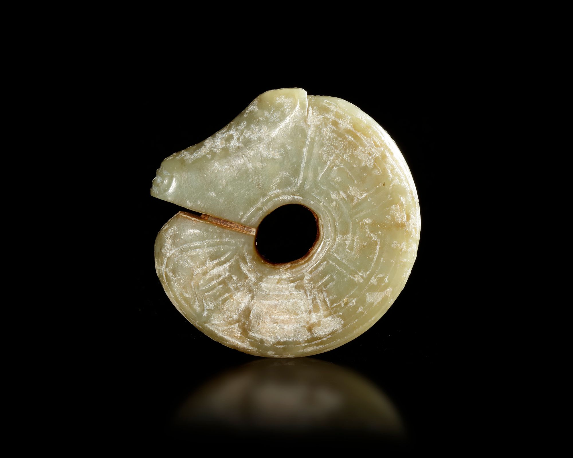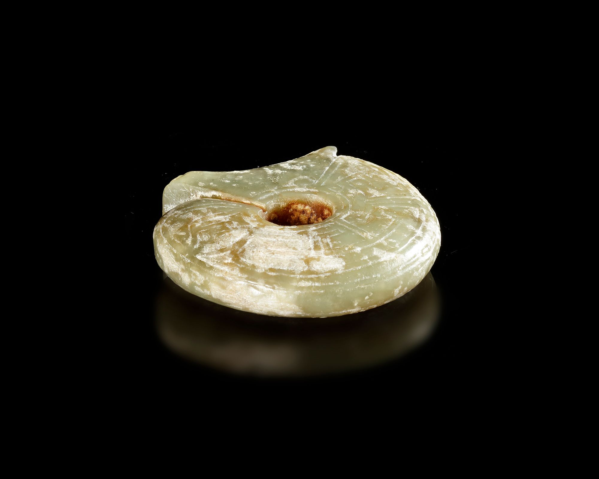 A finely carved jade dragon pendant . The piece is formed in a circular, coiled dragon shape with a central perforation and a stylized dragon head. Subtle carved patterns