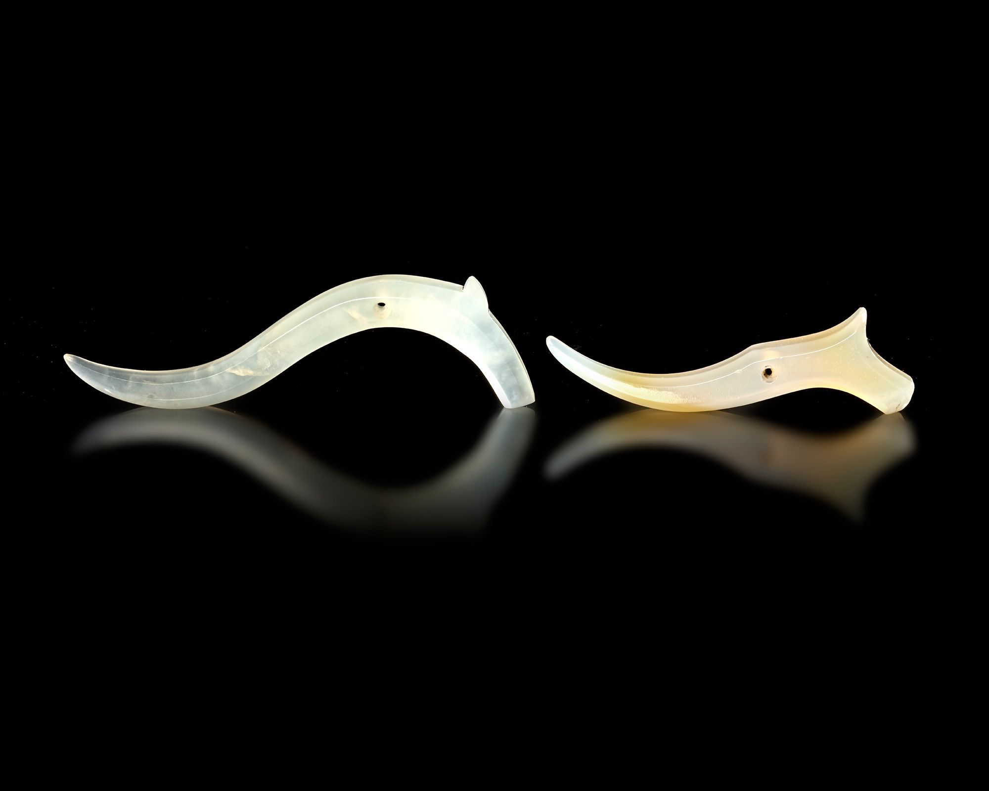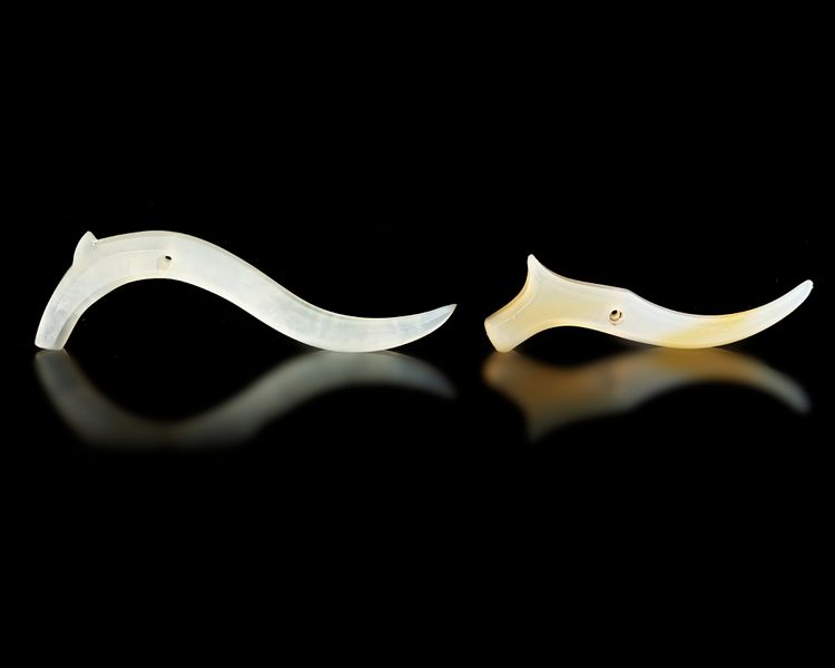 The smooth curves and minimalistic design highlight the natural translucency and soft green tone of the jade. Small perforations indicate they were likely worn as ornamental pendants or elements of ceremonial jewelry.