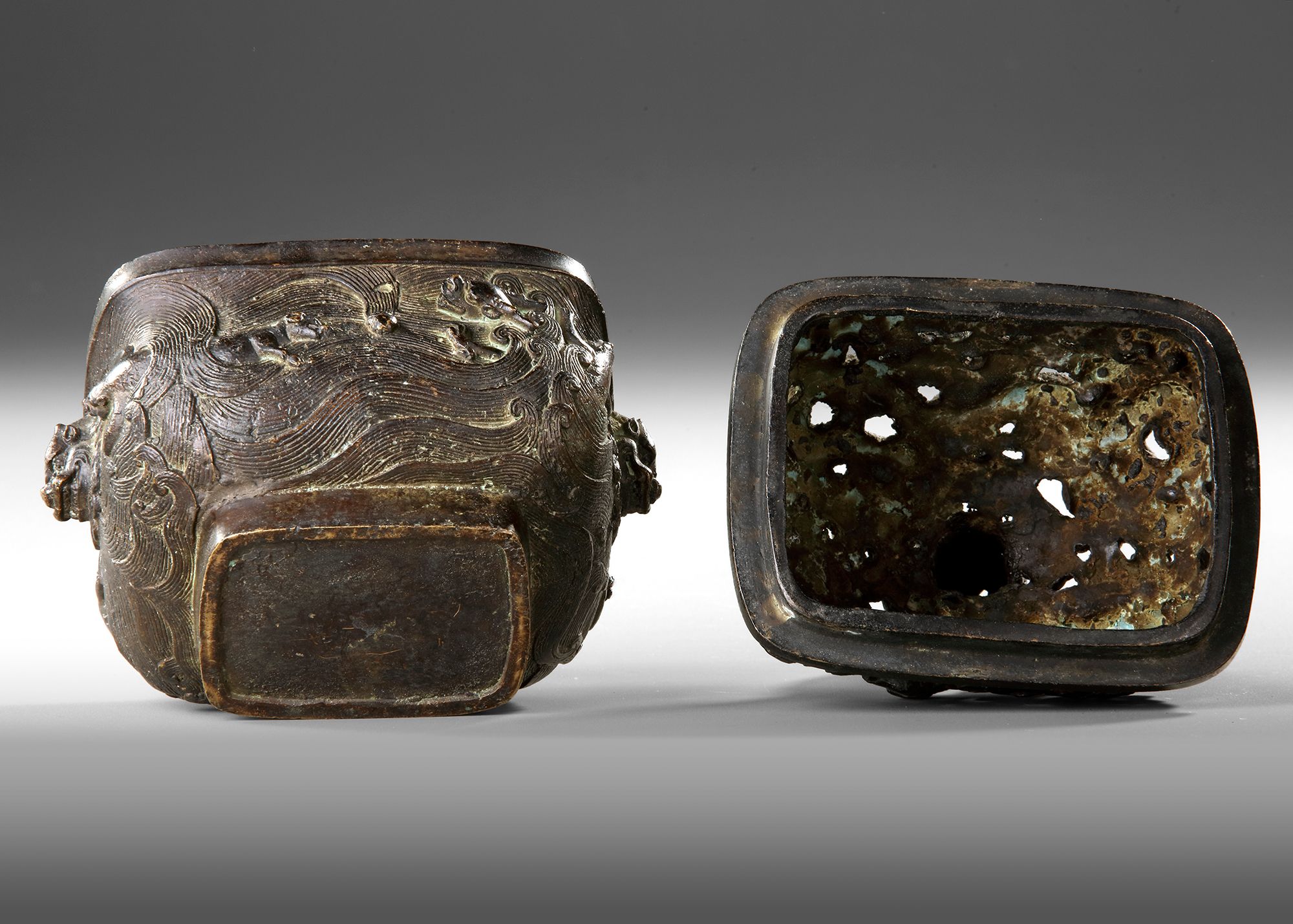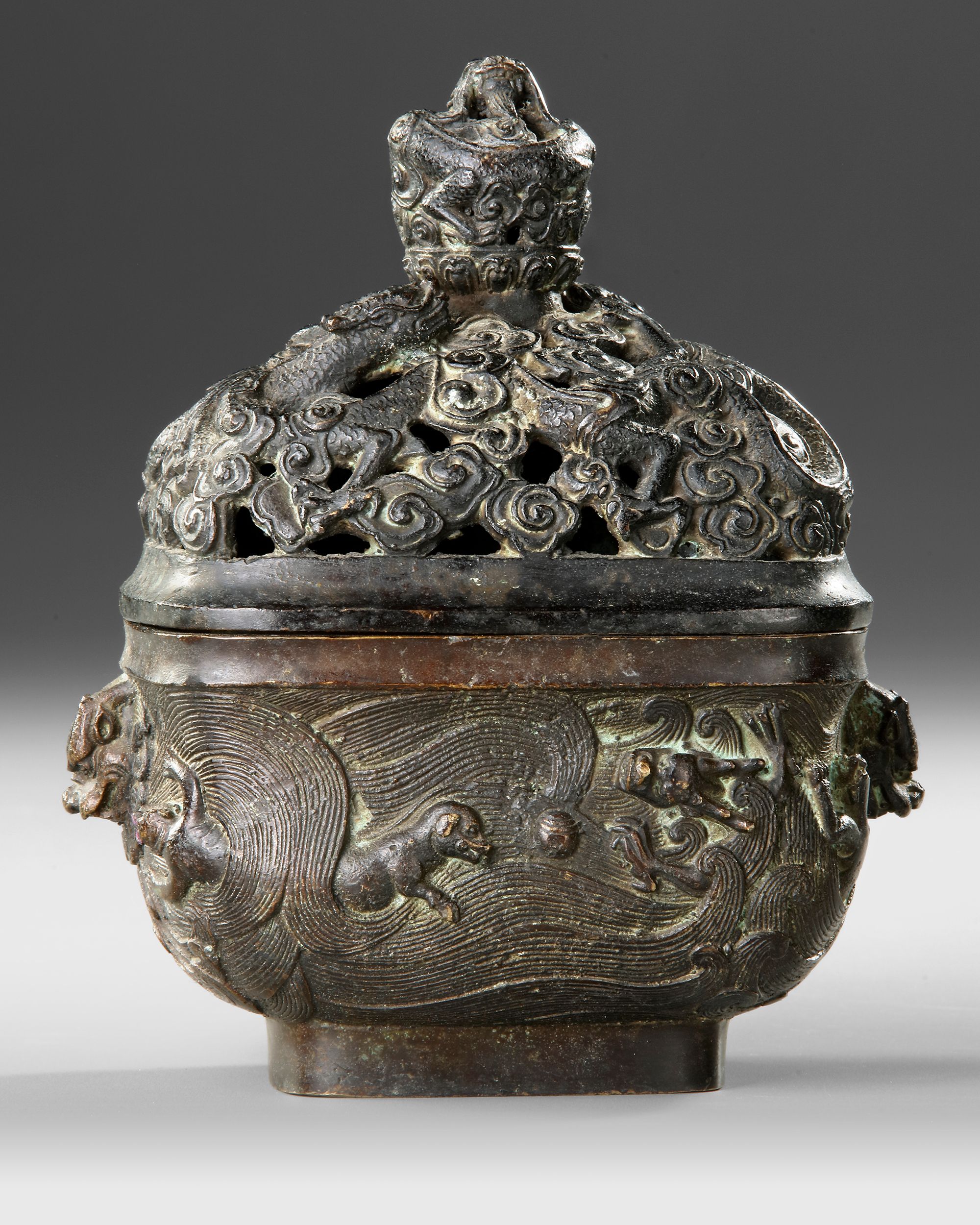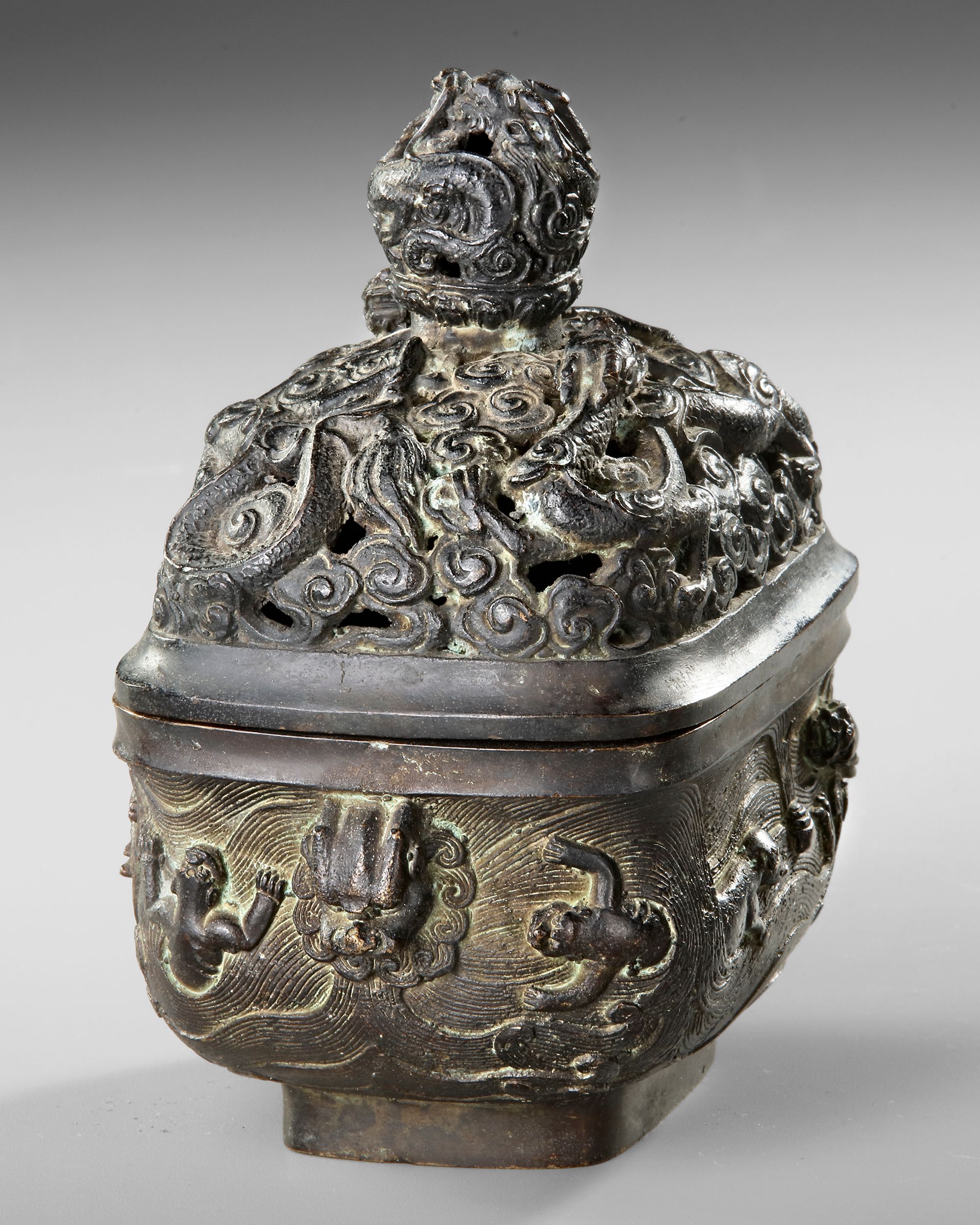 An impressive Chinese bronze incense burner dating to the 17th century, richly decorated with relief motifs and mythical creatures. The pierced domed lid features intricate dragons and swirling cloud patterns, allowing the fragrant smoke to escape elegantly. The body is adorned with dynamic figures and flowing wave designs, showcasing fine craftsmanship and a deep, aged patina. Height: 17 cm. Provenance: Private collection mr. J.K., Switzerland.