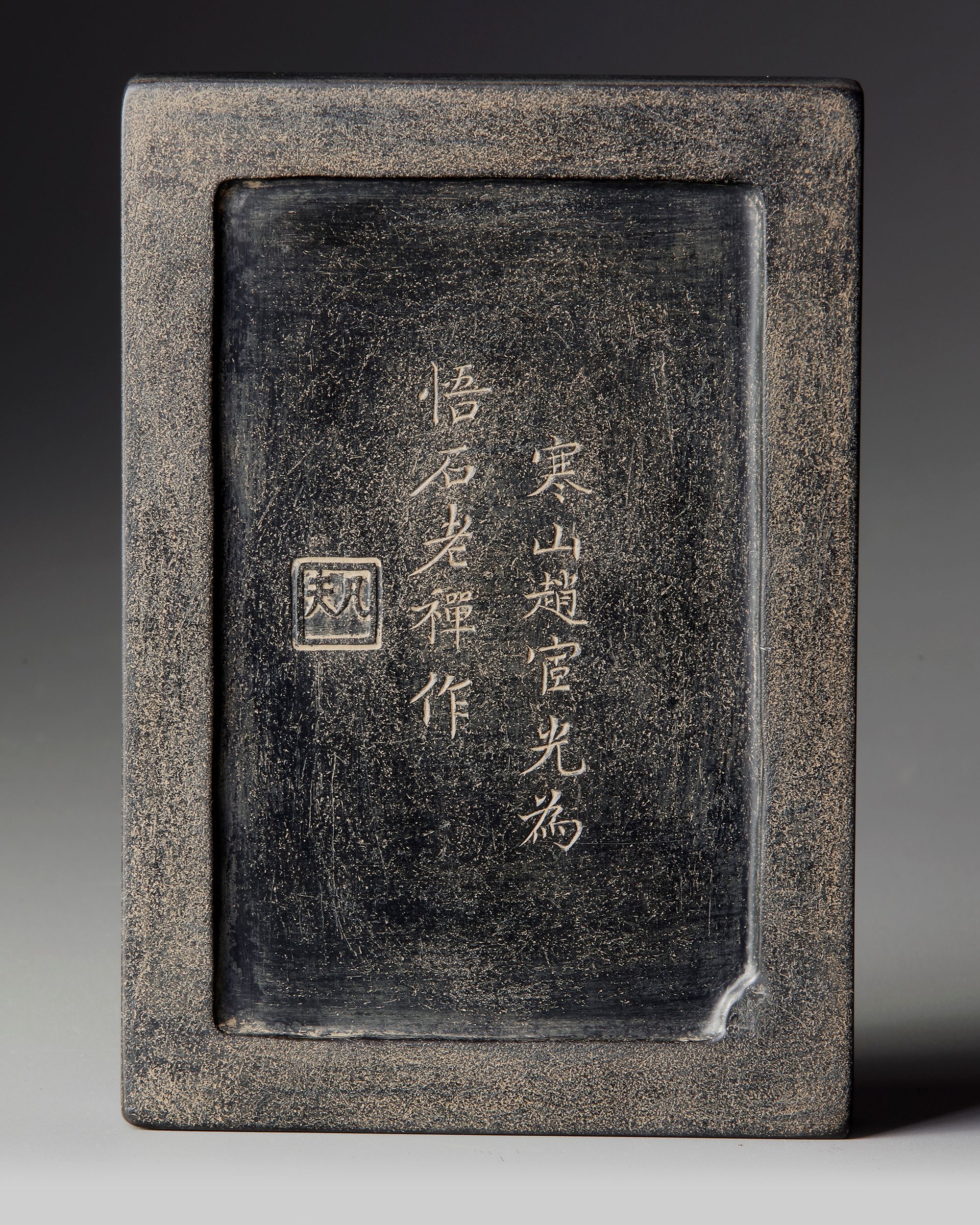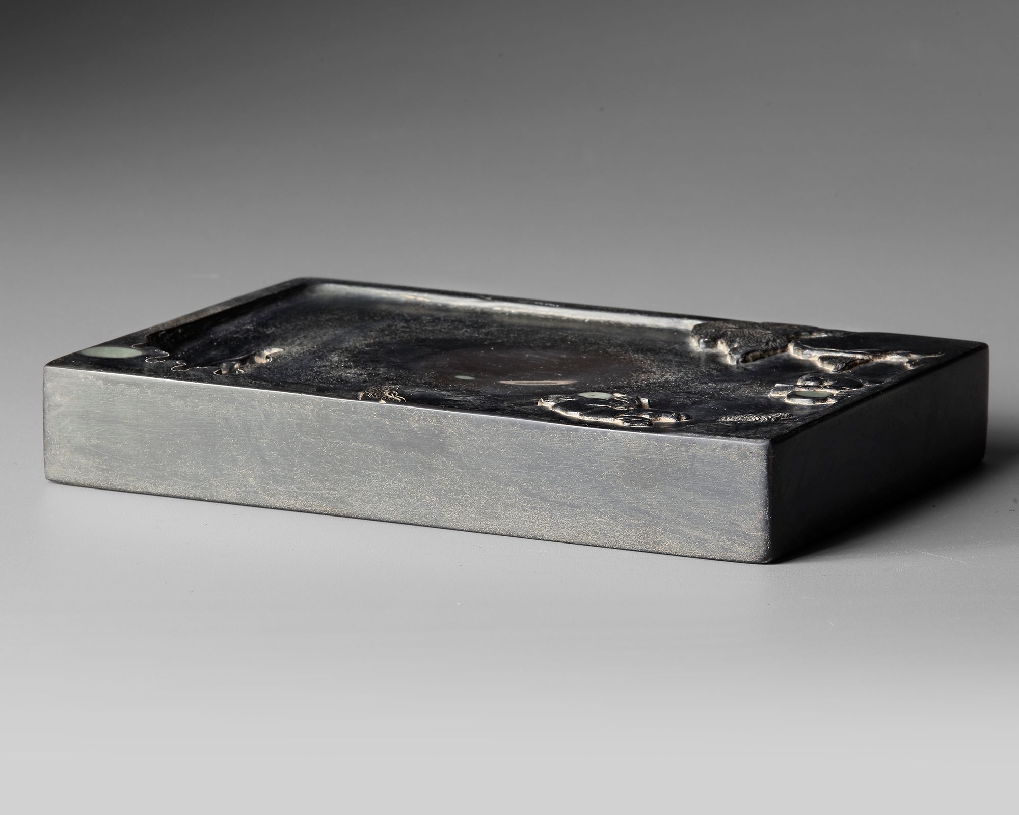 A finely carved Chinese inkstone , crafted from dark stone with a smooth grinding surface. The piece is decorated with a delicate relief scene featuring small figures in a landscape with rocks, trees, and clouds, creating a refined scholarly motif. Inkstones like this were essential tools in traditional Chinese calligraphy and painting.