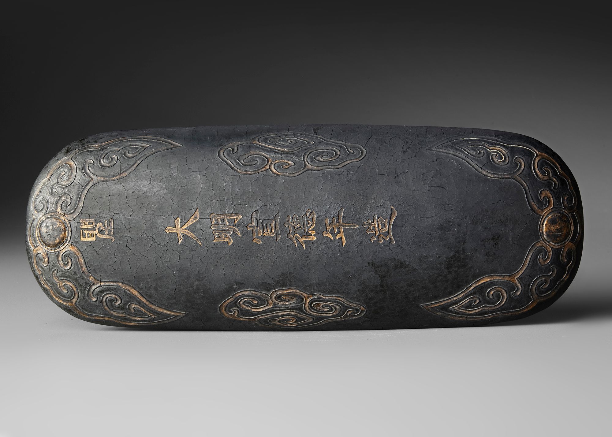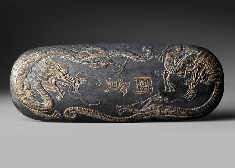 Ink blocks such as this were used in Chinese calligraphy and painting, ground with water on an inkstone to produce ink. The elaborate carving and inscriptions indicate a high-quality scholar’s object, combining artistic craftsmanship with literary culture.