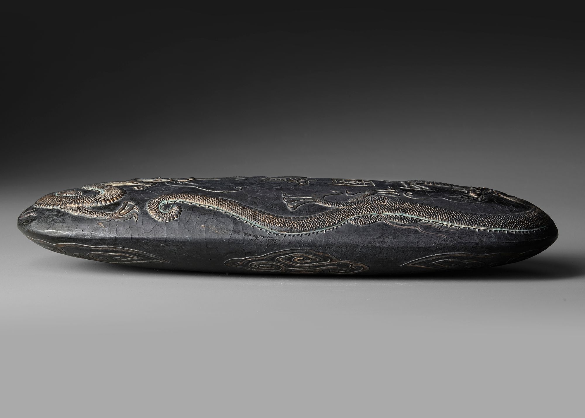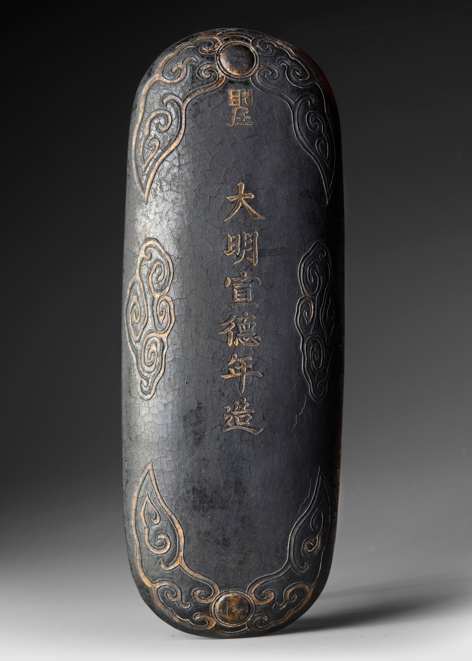WITH XUANDE MARK A finely carved ink block , richly decorated with dynamic dragon motifs in relief. The dragons are shown twisting among clouds, symbolizing power, authority, and imperial auspices in traditional Chinese culture.