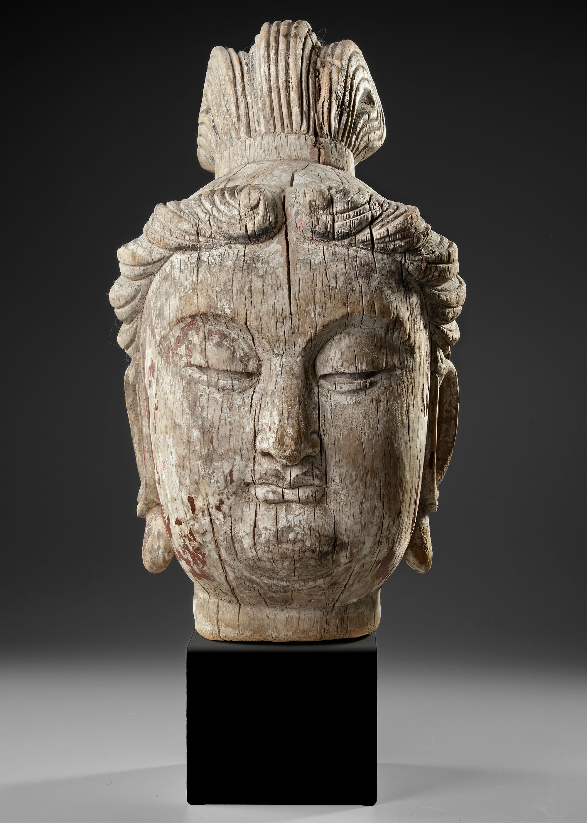 A finely carved wooden head of Guanyin, the Bodhisattva of Compassion. The sculpture displays a serene expression with gently closed eyes, elongated earlobes, and an elaborate coiffure typical of Buddhist devotional imagery of the period.