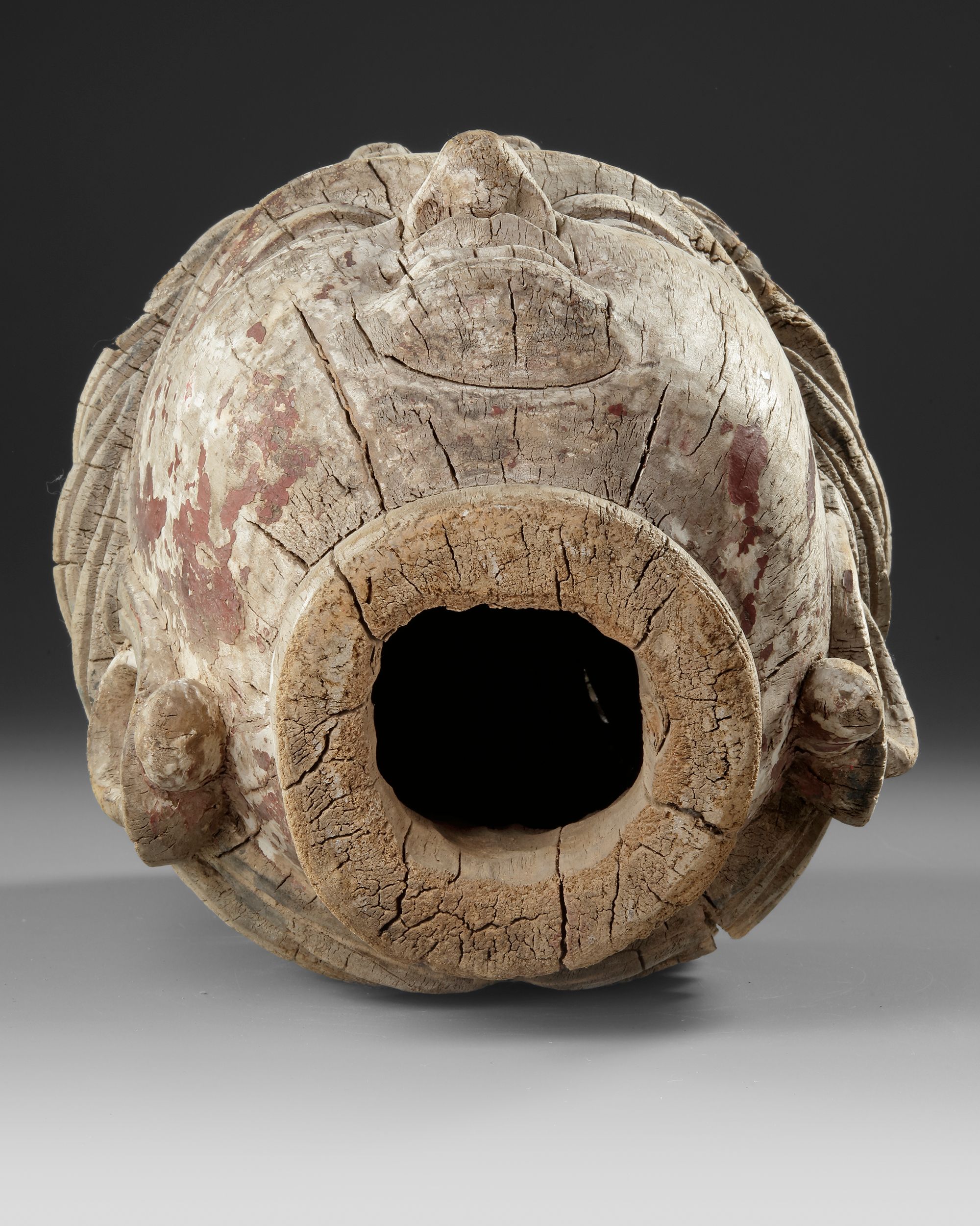 Traces of original polychrome and natural aging remain visible on the surface, enhancing its historical character. The back and base openings indicate it was originally part of a larger temple statue. Height: 42 cm. Provenance: Private collection mr. J.K., Switzerland
