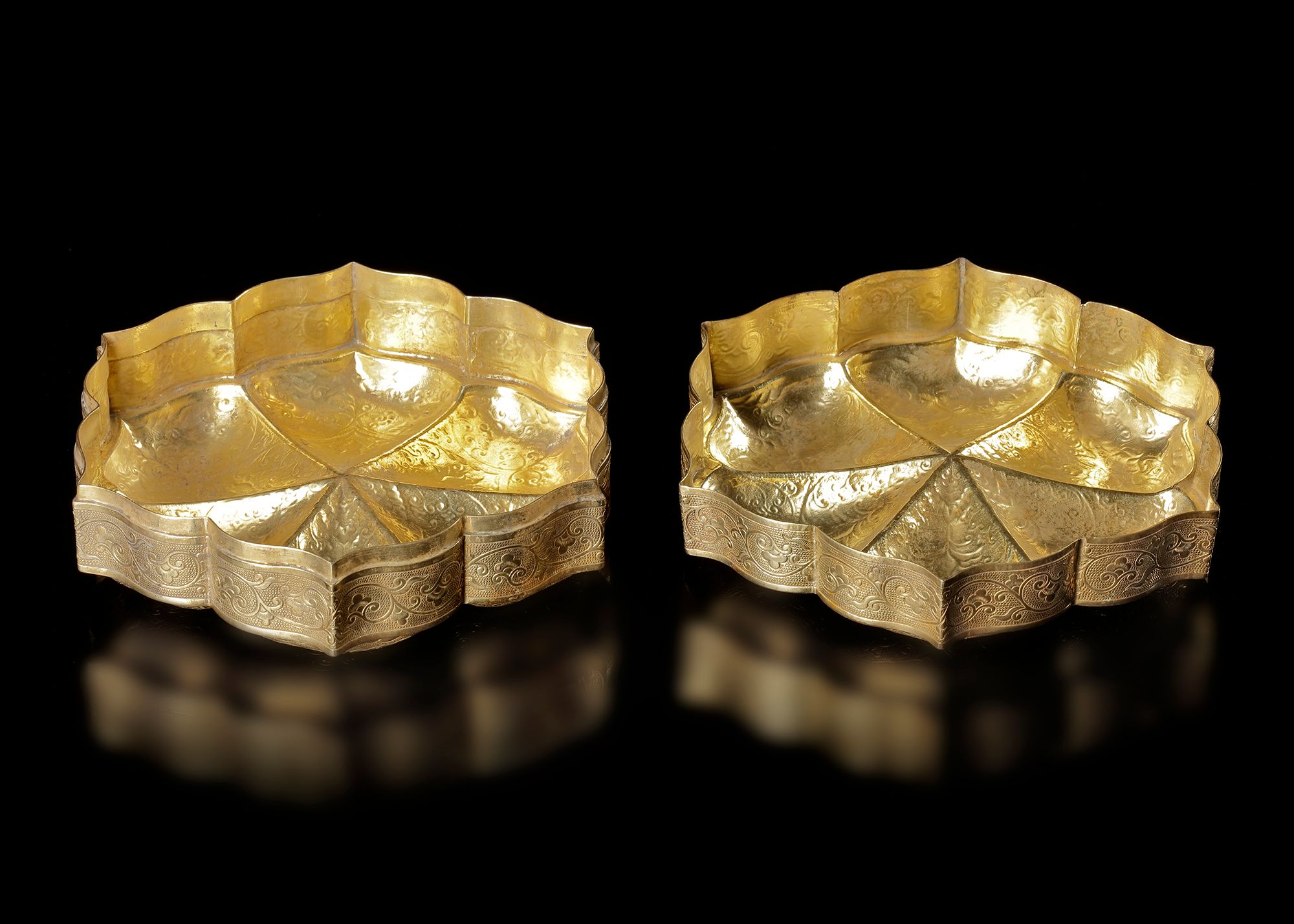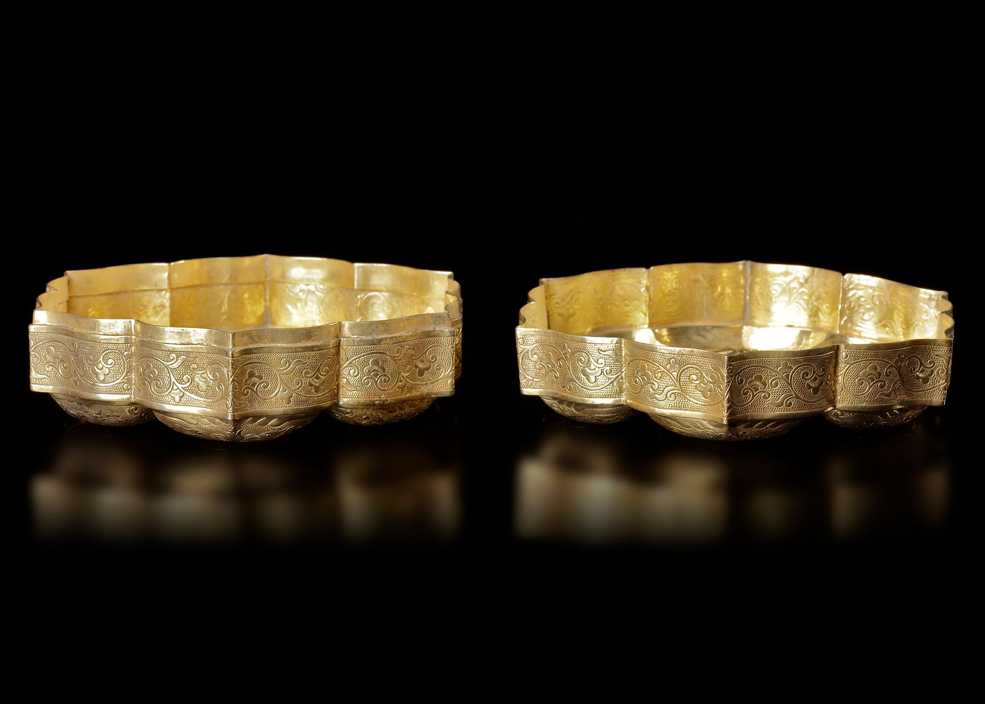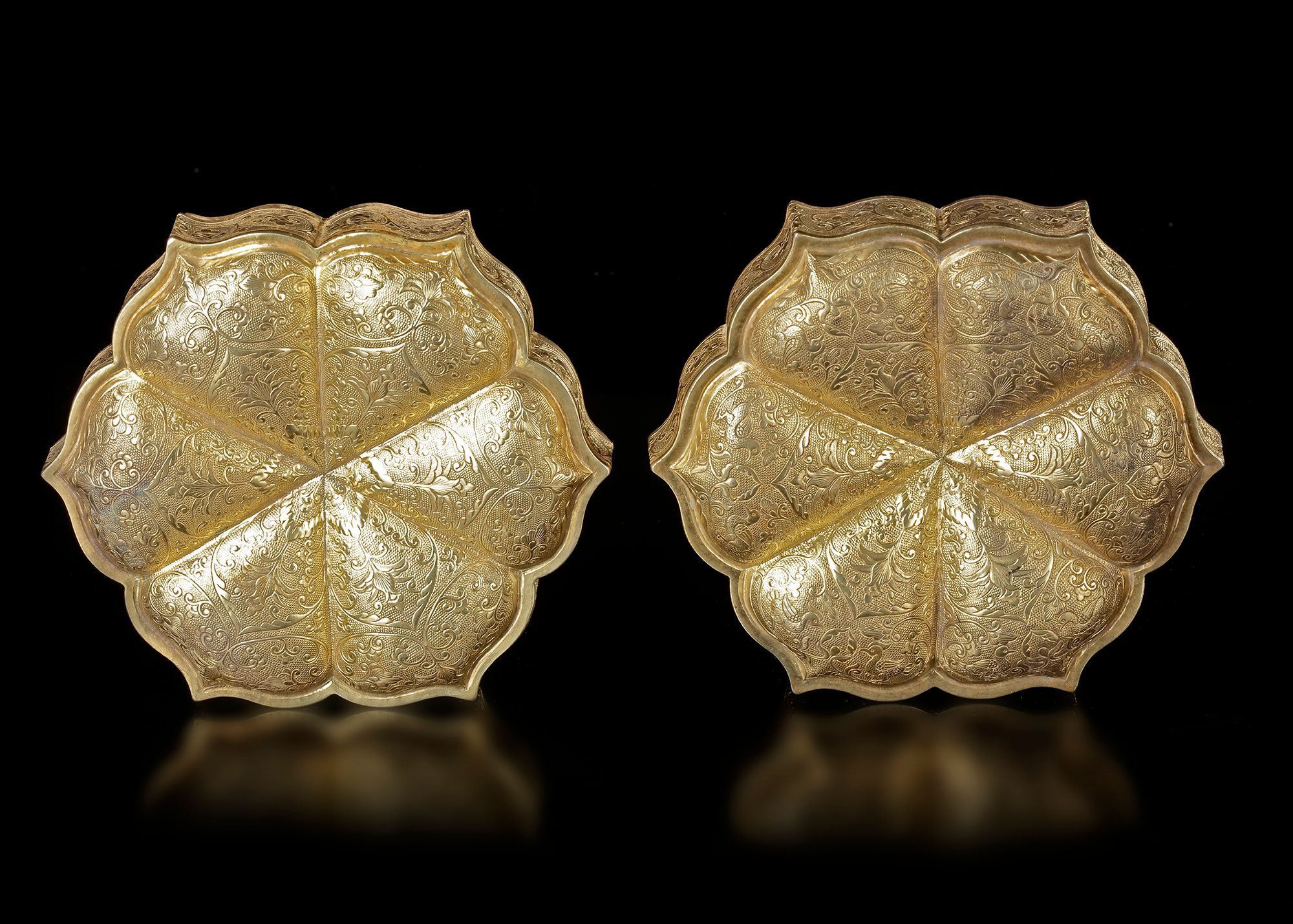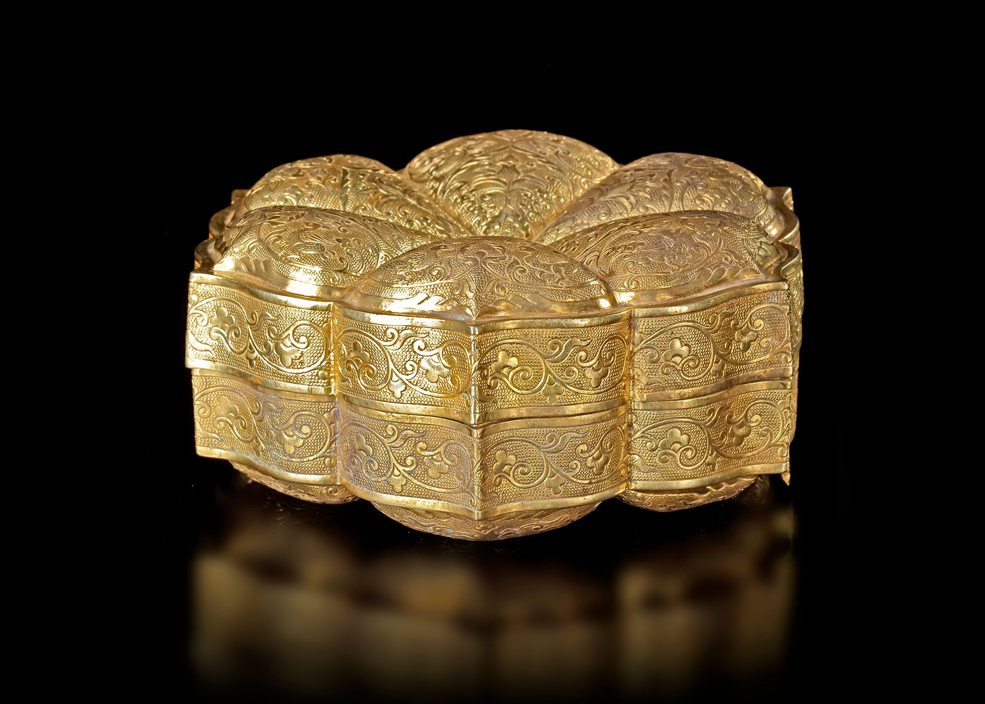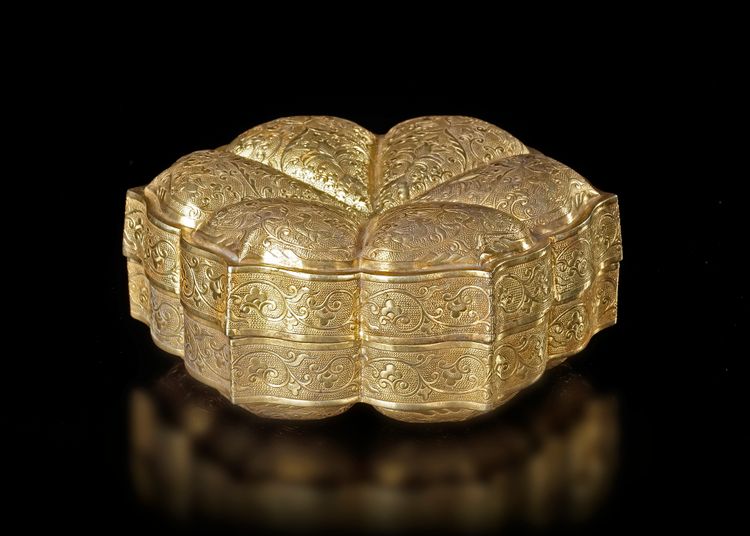 An elegant gilded box , crafted in a graceful lobed form resembling a lotus flower. The surface is richly decorated with finely engraved scrolling floral and foliate patterns, characteristic of refined Chinese metalwork of the period. The box consists of a fitted cover and base, both carefully chased and gilded, giving the piece a luxurious appearance. Objects of this type were traditionally used to hold precious items, cosmetics, incense,