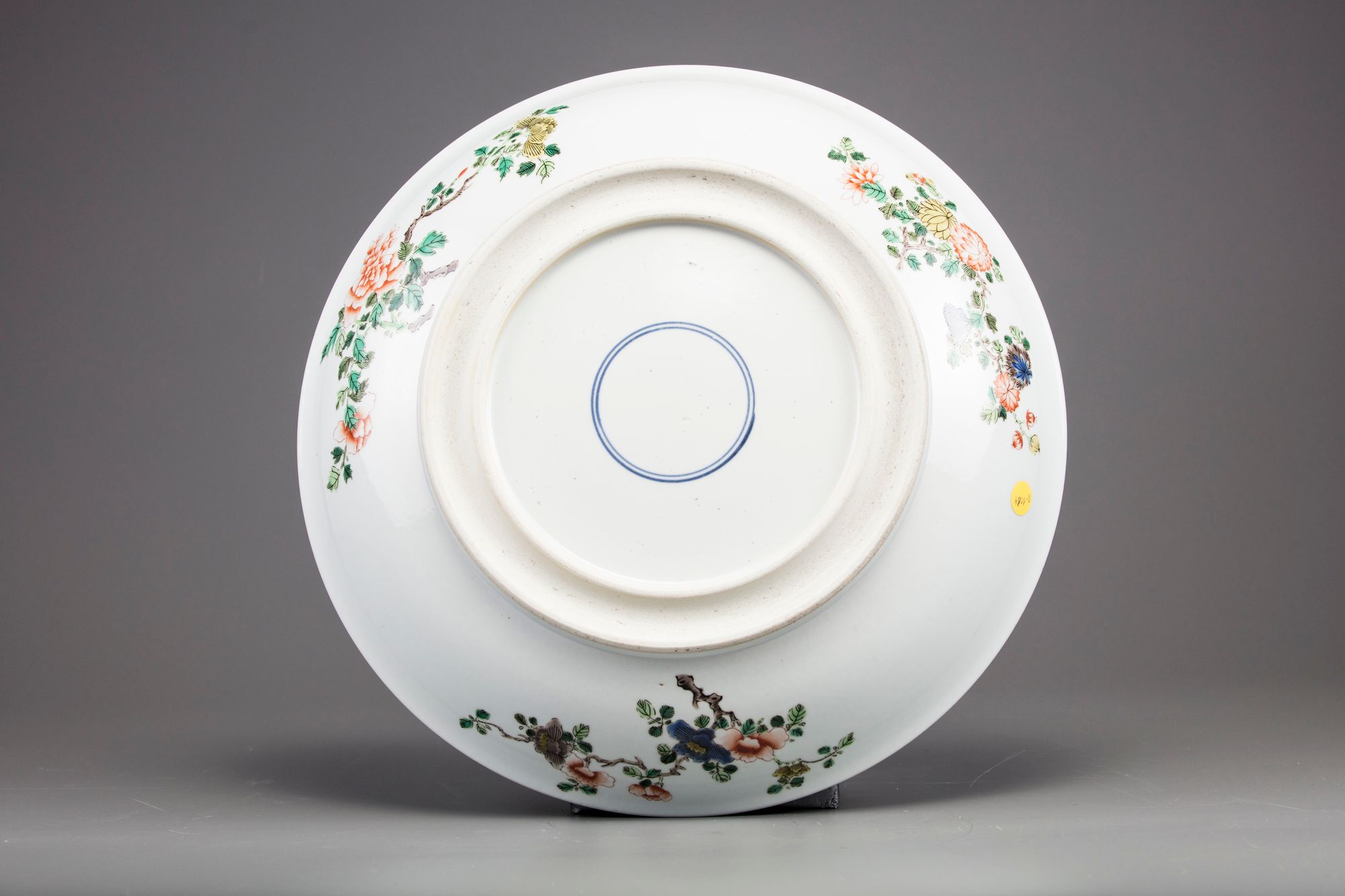 The interior is brightly enamelled with officials and attendants standing in a landscape, the rim decorated with sea creatures separated by flowering trees. The base with an underglaze blue double circle within a double footring.