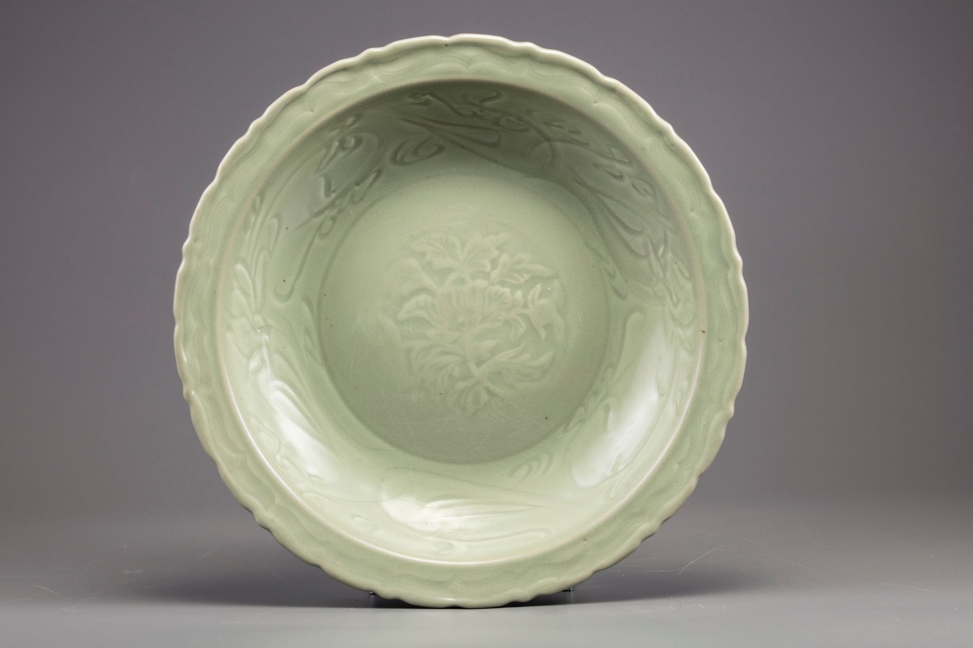With shallow ribbed sides rising to an everted rim, the center of the interior decorated in relief with flower scroll, all under a glaze of sea-green color.