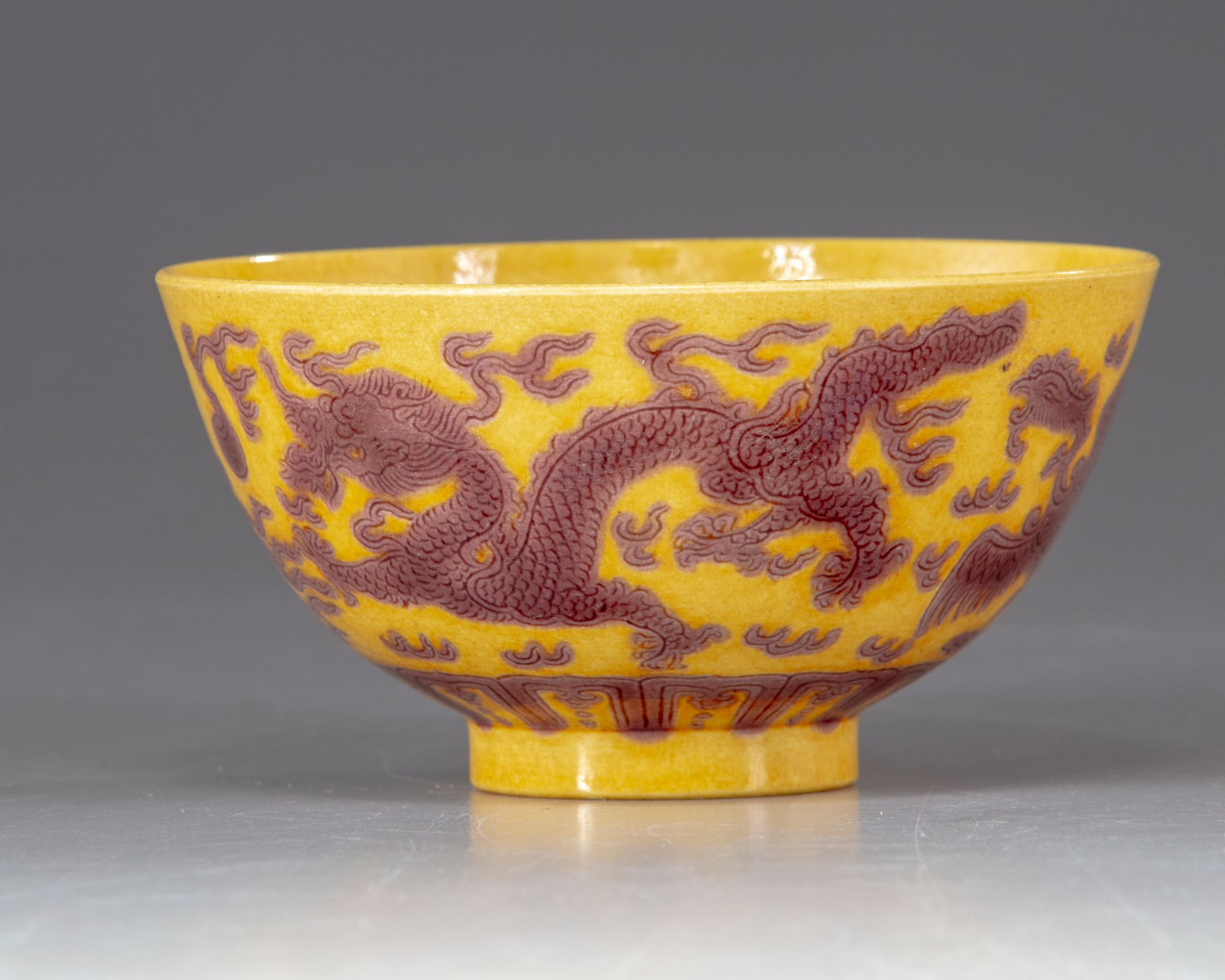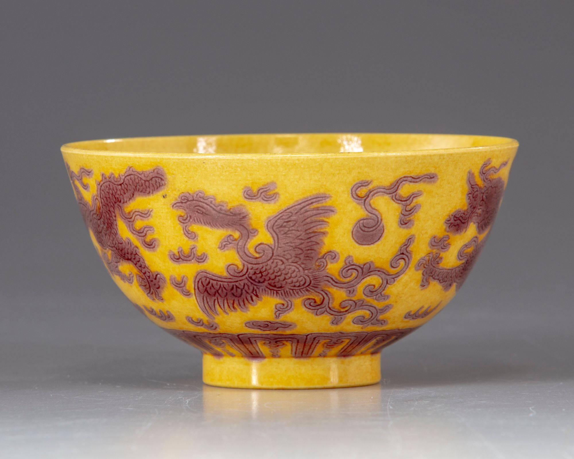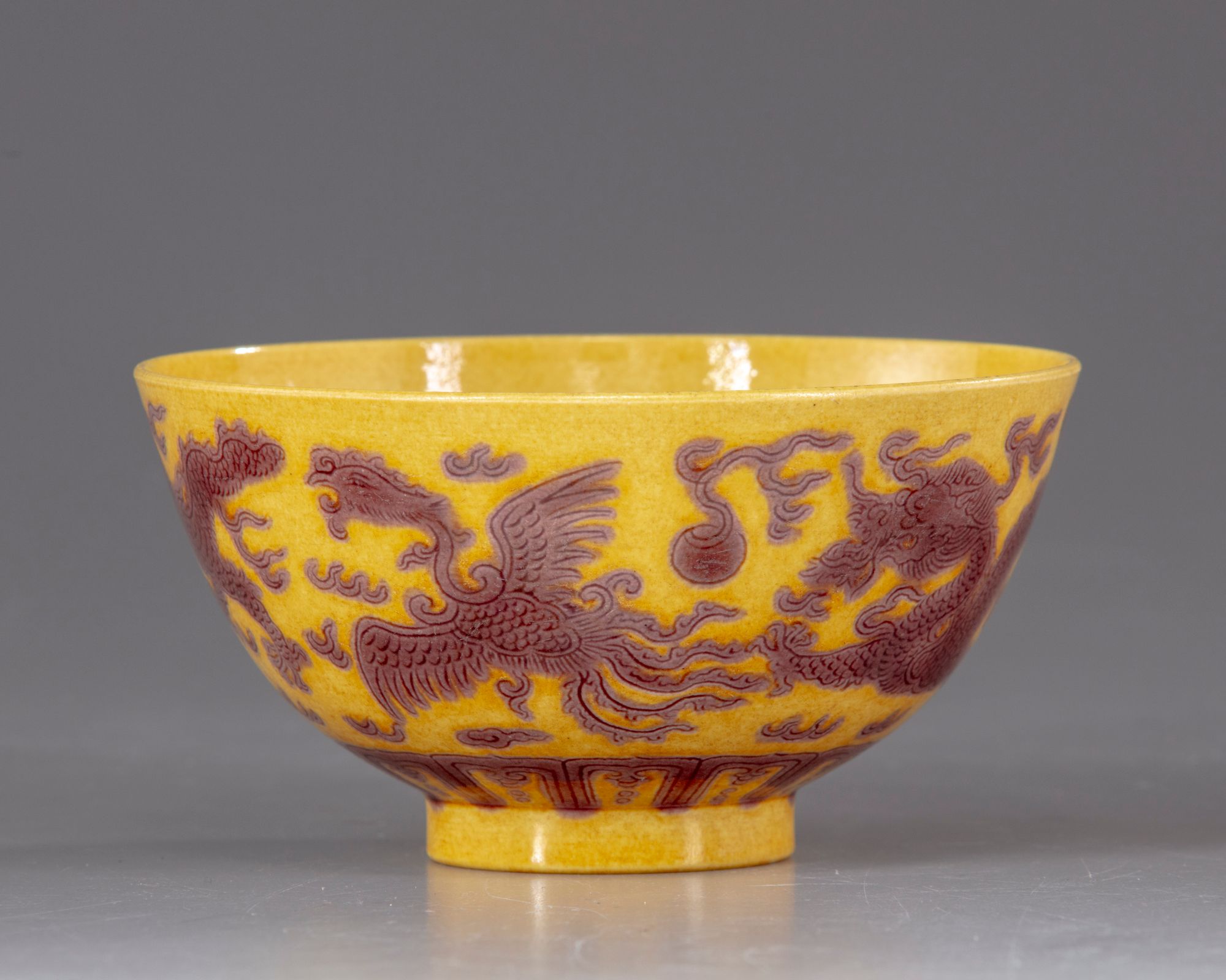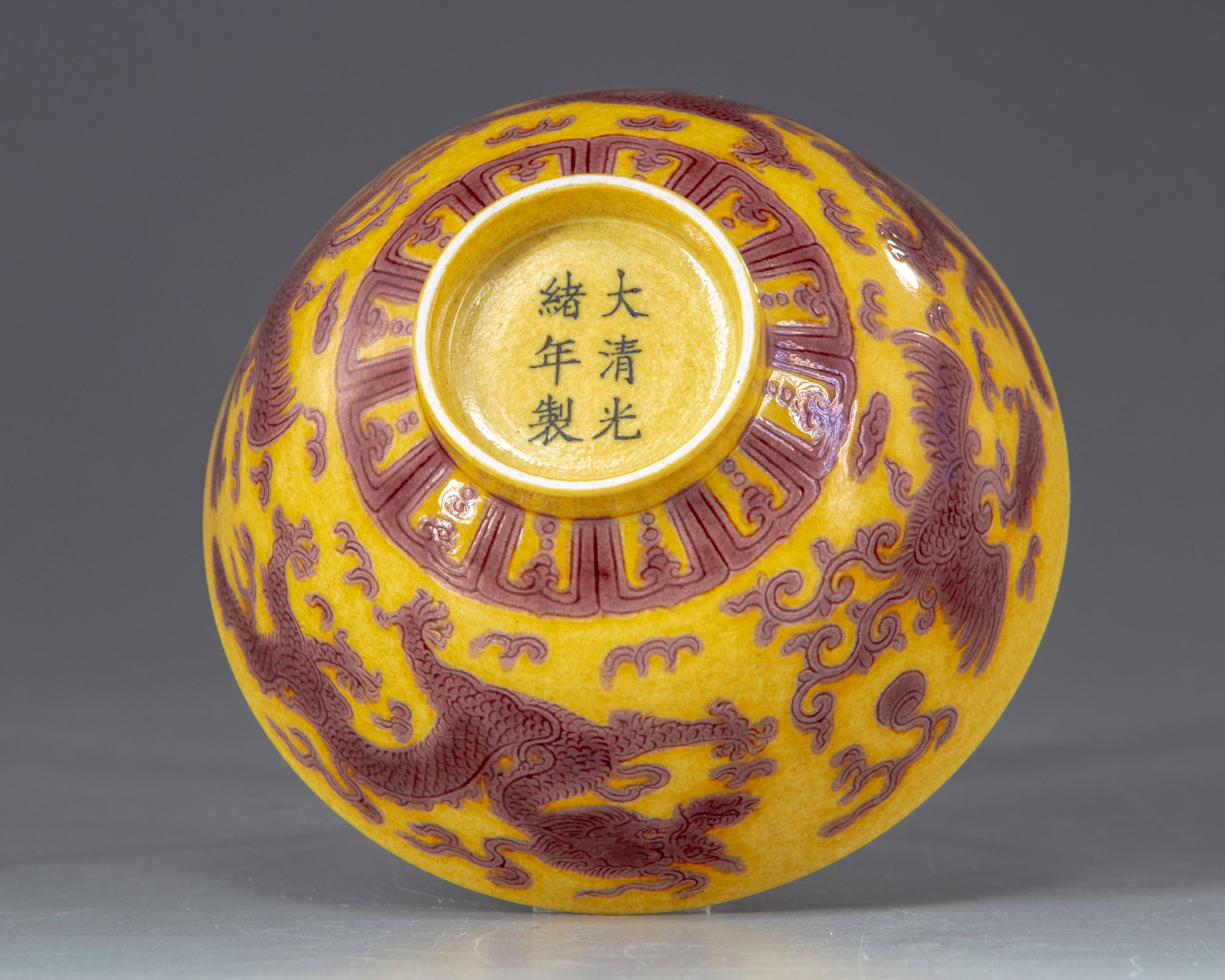 The bowl is decorated to the exterior with two pairs of dragons and phoenix each striding amongst flame scrolls above a lappet band by the foot. The details are finely incised. The interior is decorated with a 'shou' (longevity) character within a roundel. The base with an apocryphal Guangxu mark.