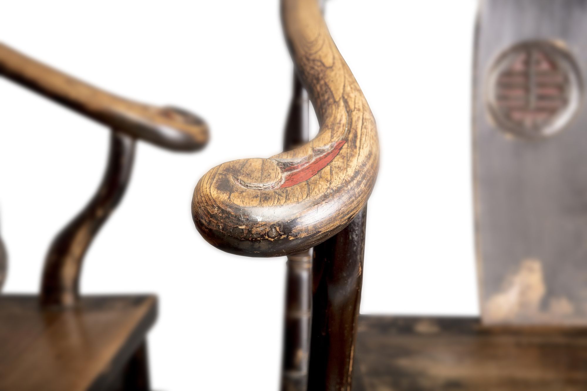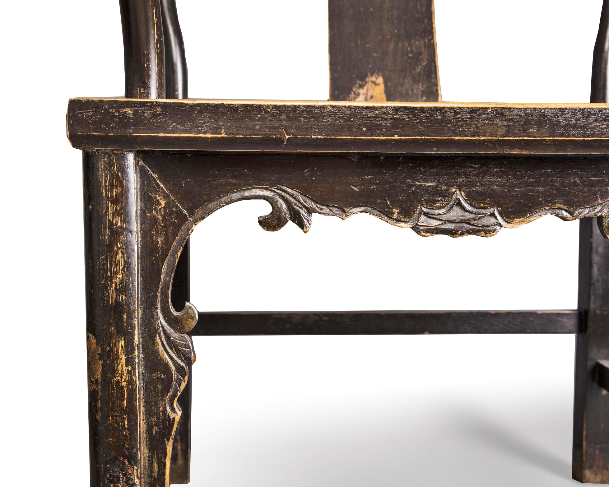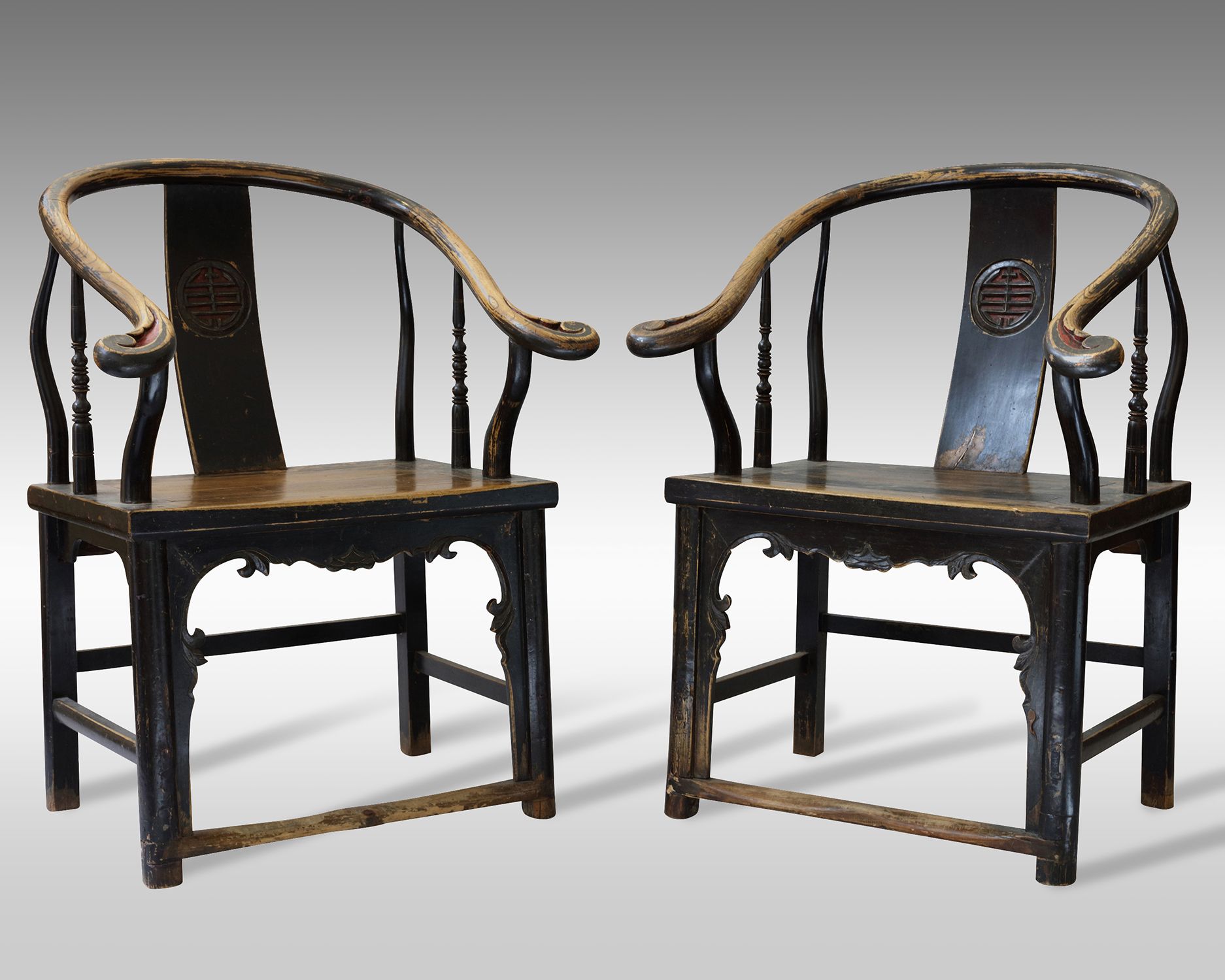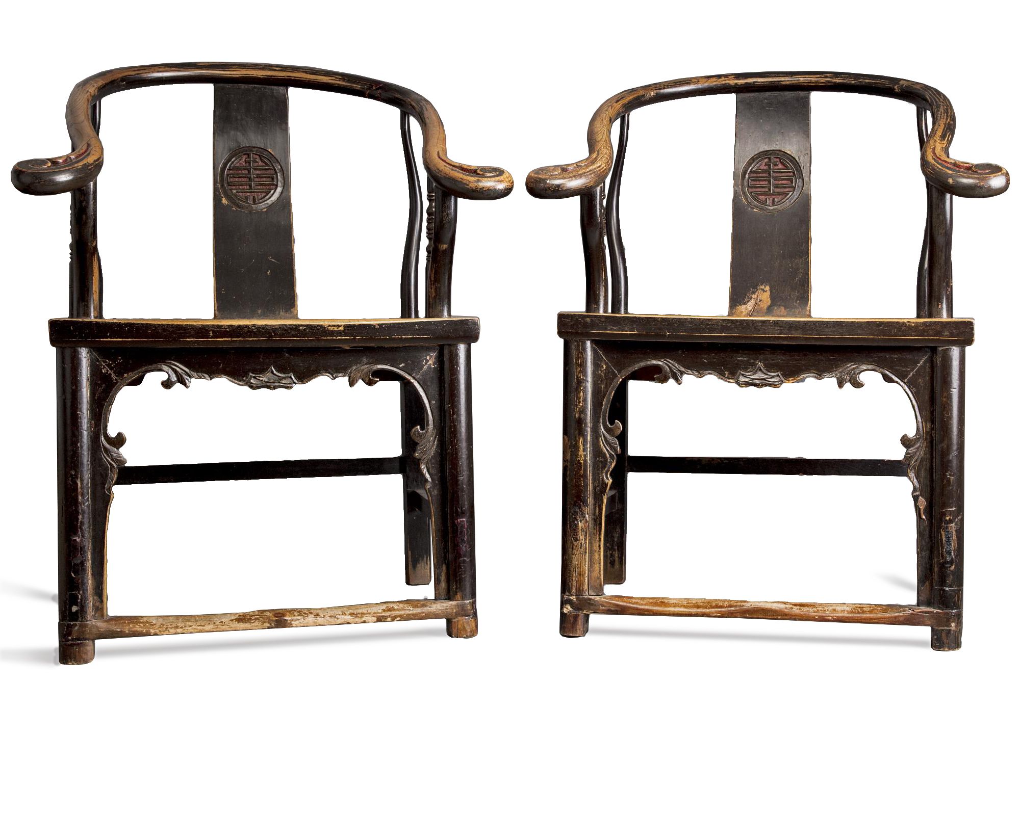 The pair of armchairs are each decorated with a shou roundel to the backsplat, and the tips of the hooked arms with a small area of lacquered detail, all above a foliate apron.