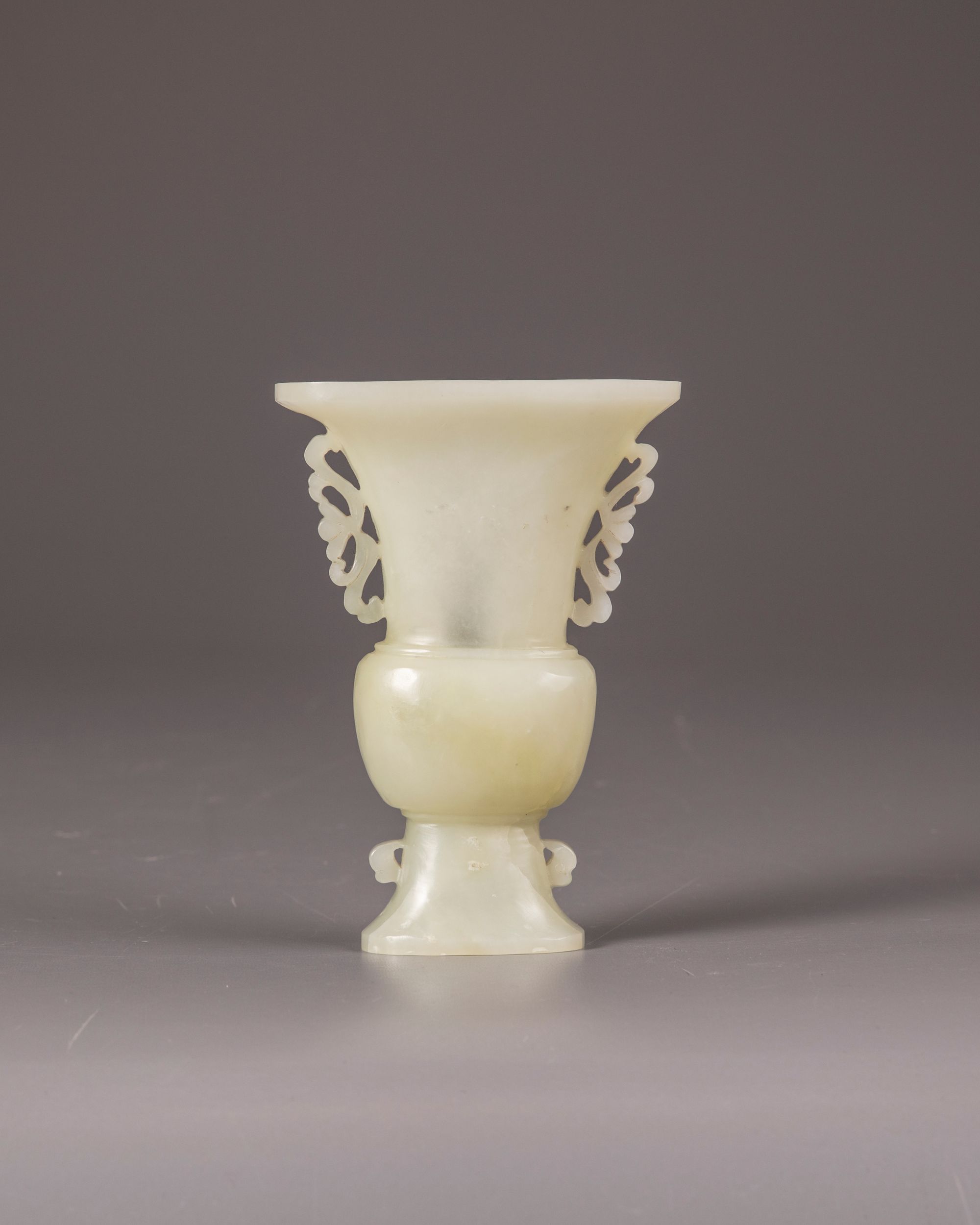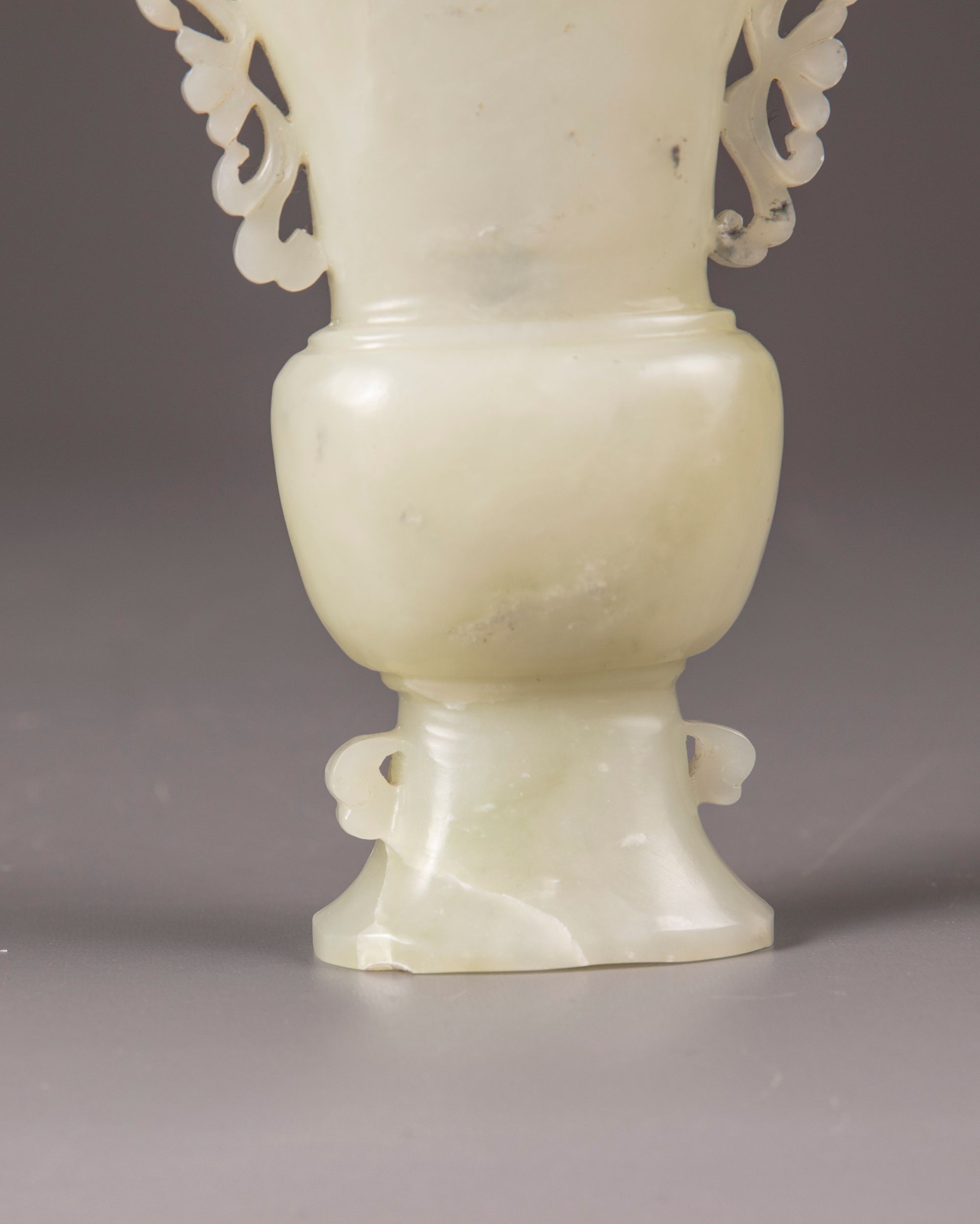The vase is carved with two pierced floral handles to the neck and two small foliate flanges to the foot. The stone is of a pale celadon tone with some inclusions.