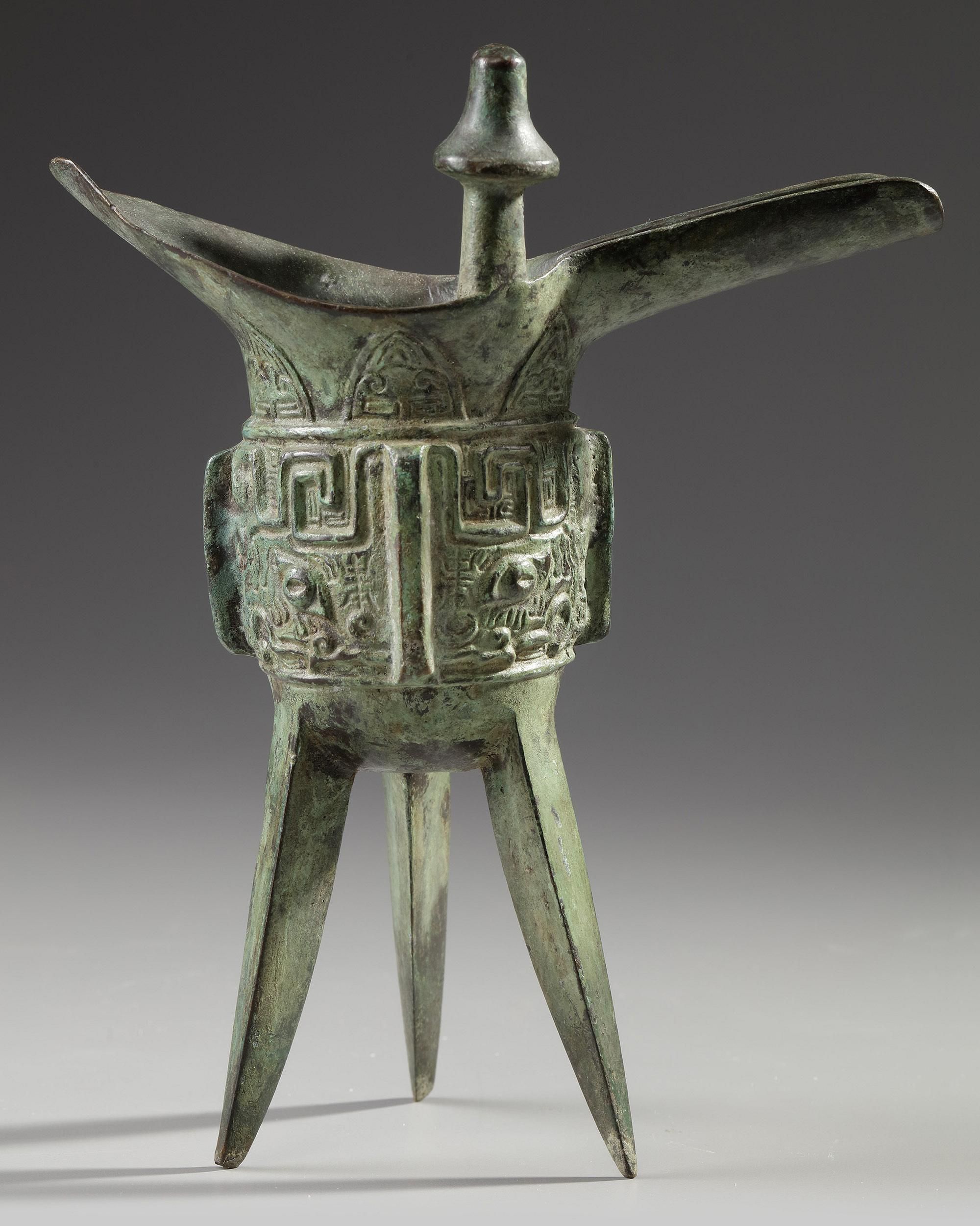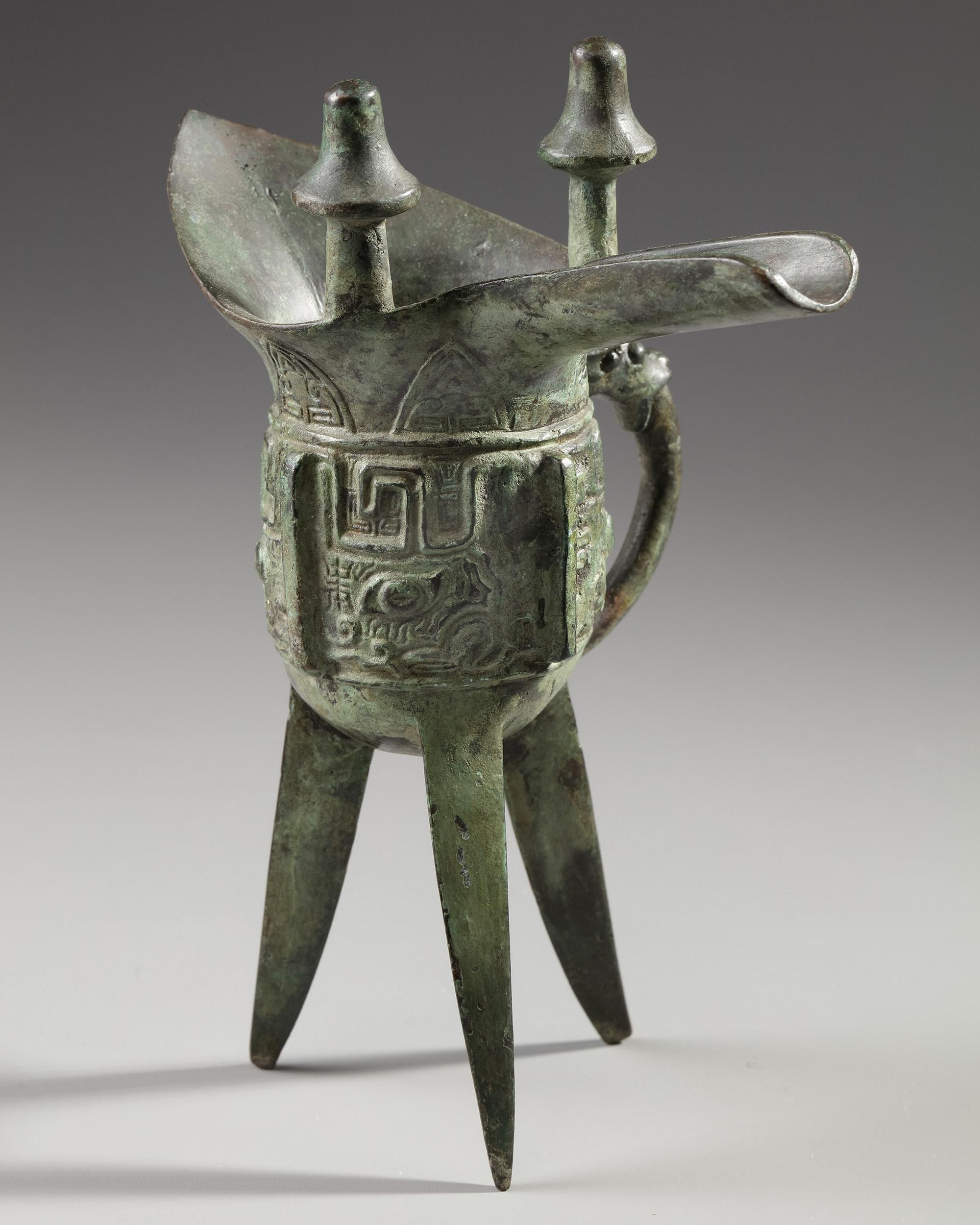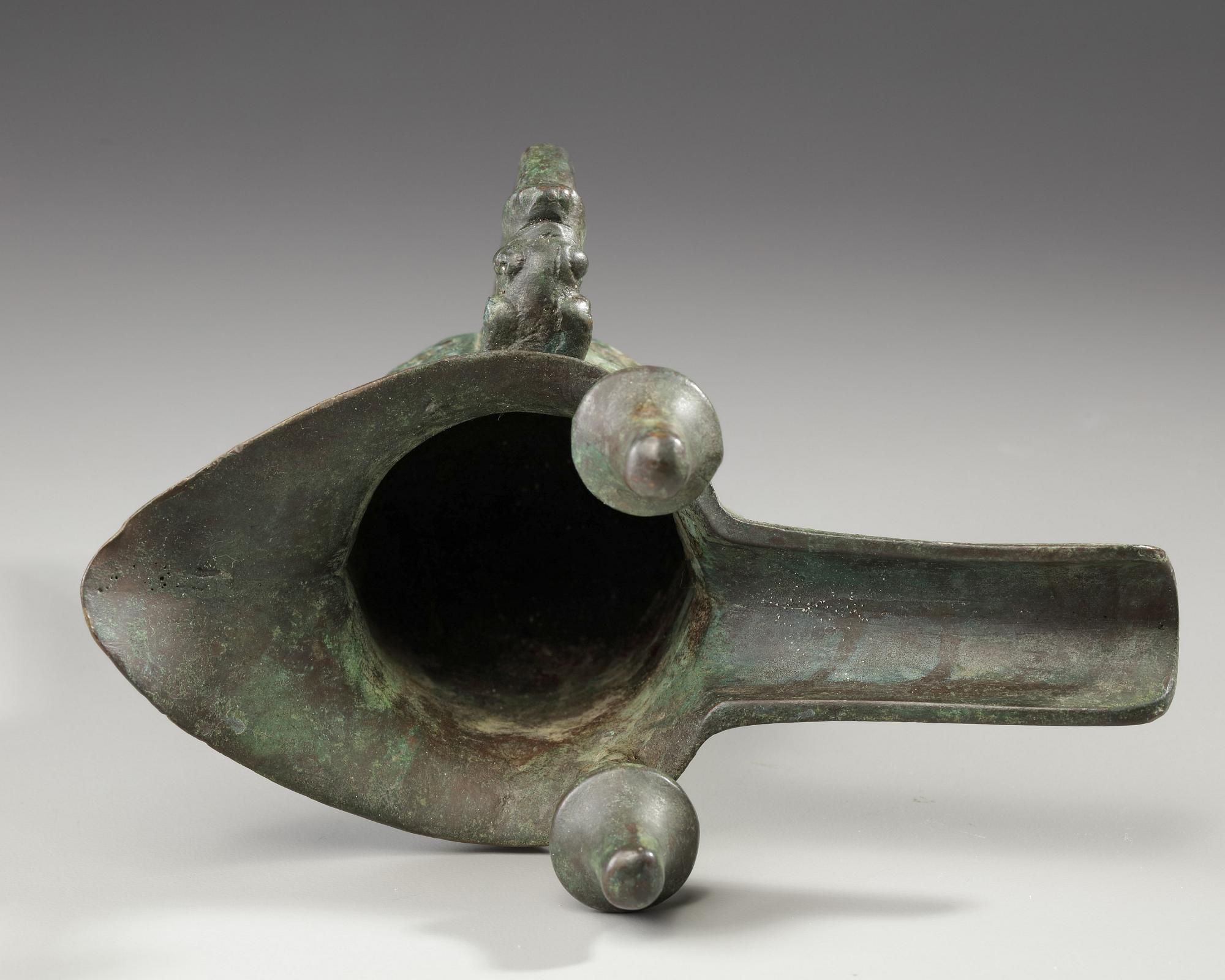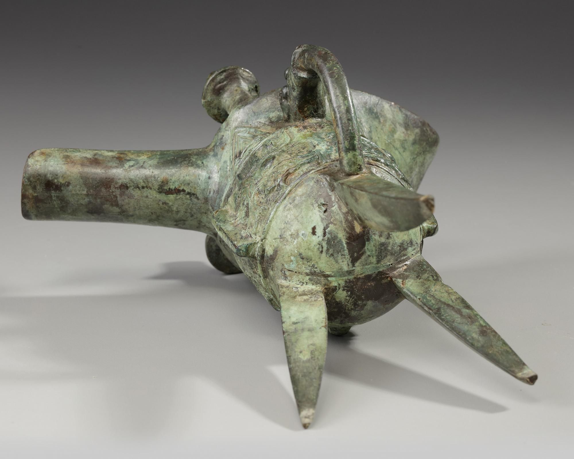 Raised on three blade-form supports, the sides cast with a band of two taotie masks reserved on a leiwen ground and separated by narrow notched flanges, one mask centered on a third flange, the other centered on the C-scroll handle issuing from a bovine mask, below a band of small blades filled with cicadas and larger blades below the spout and opposite end, with a pair of capped posts rising from the rim, with mottled green patina.