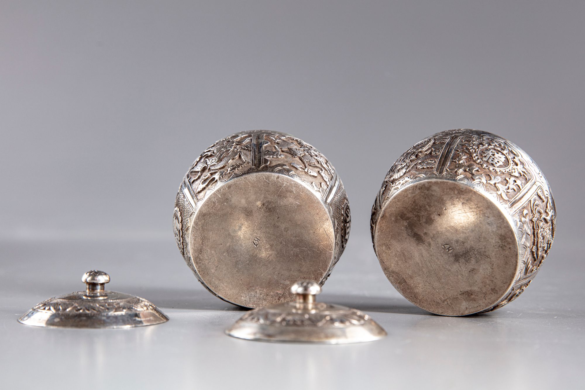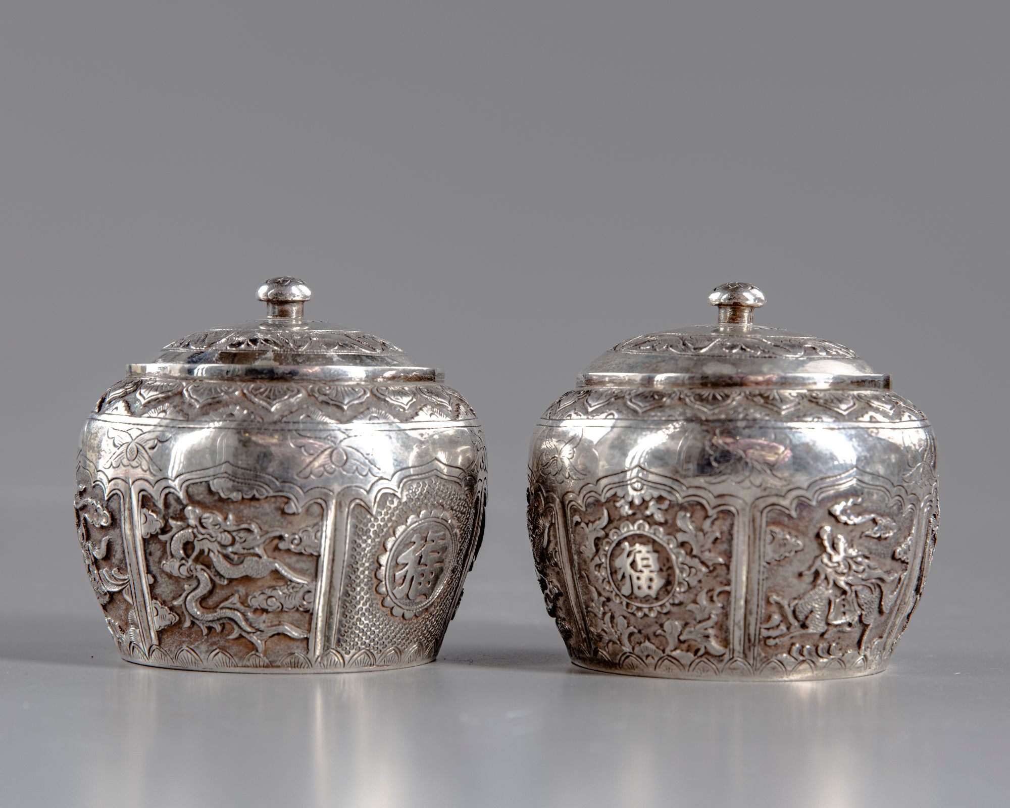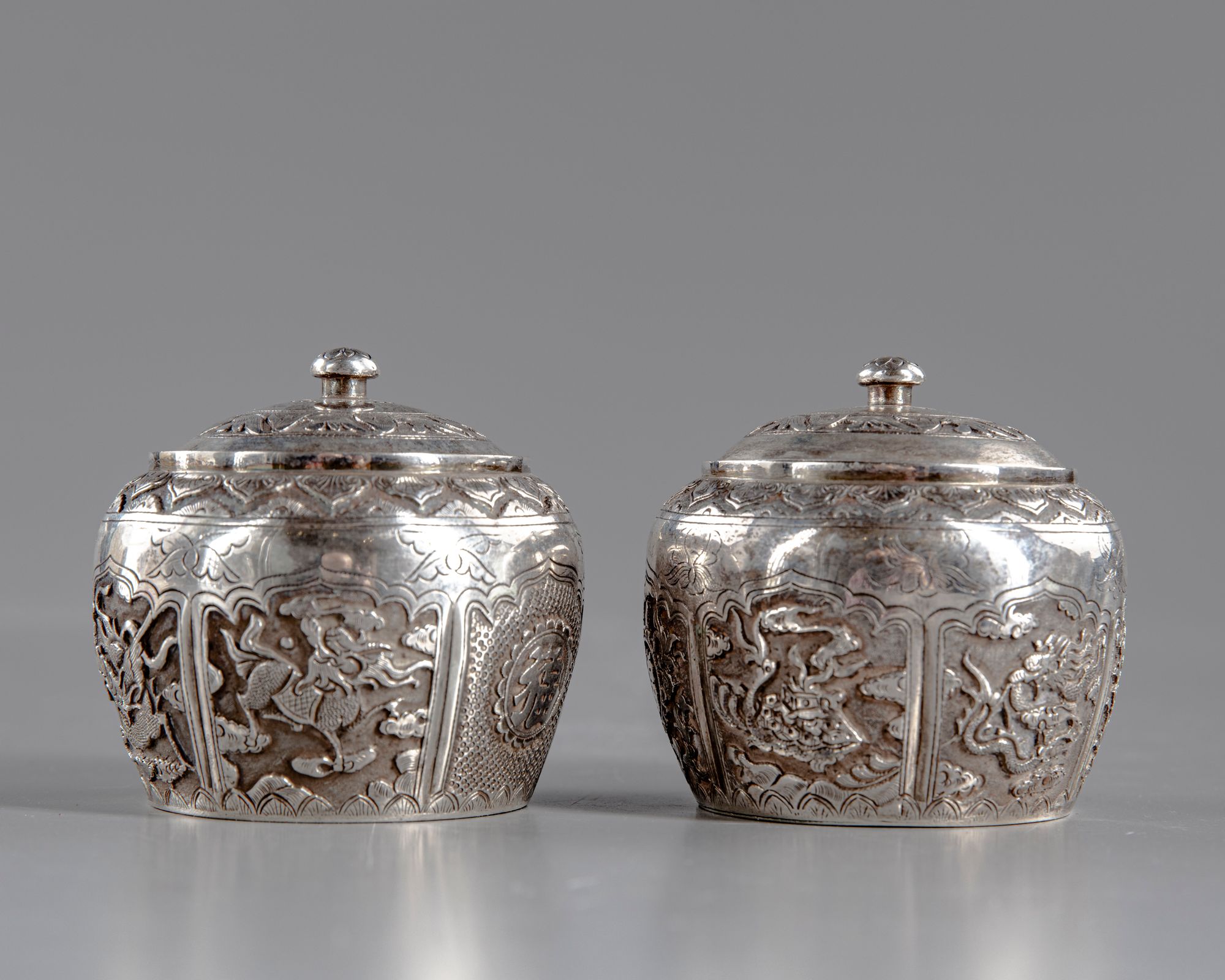 Carved in low relief with panels enclosing dragons and Chinese characters within. Height: 7 cm.