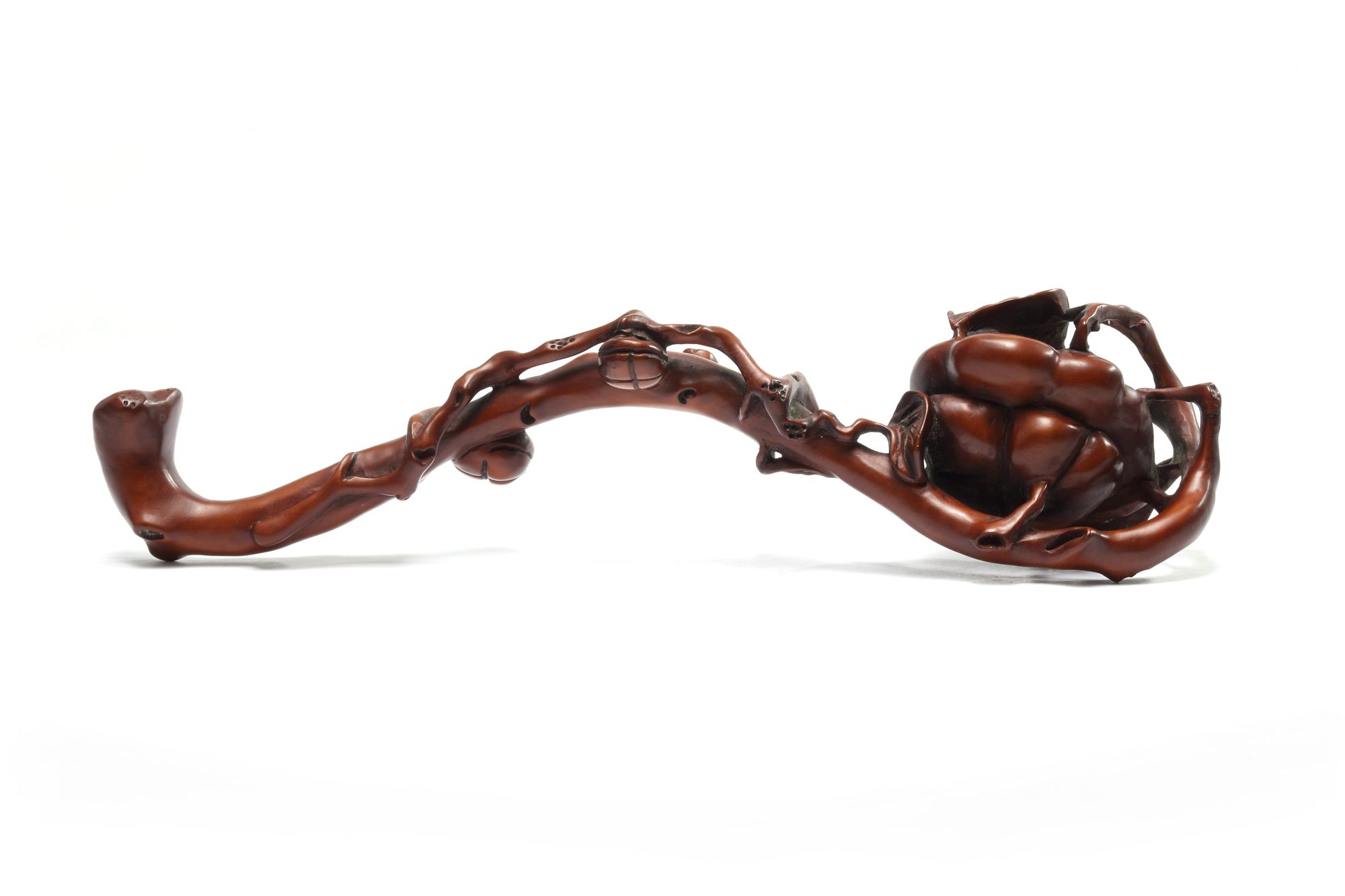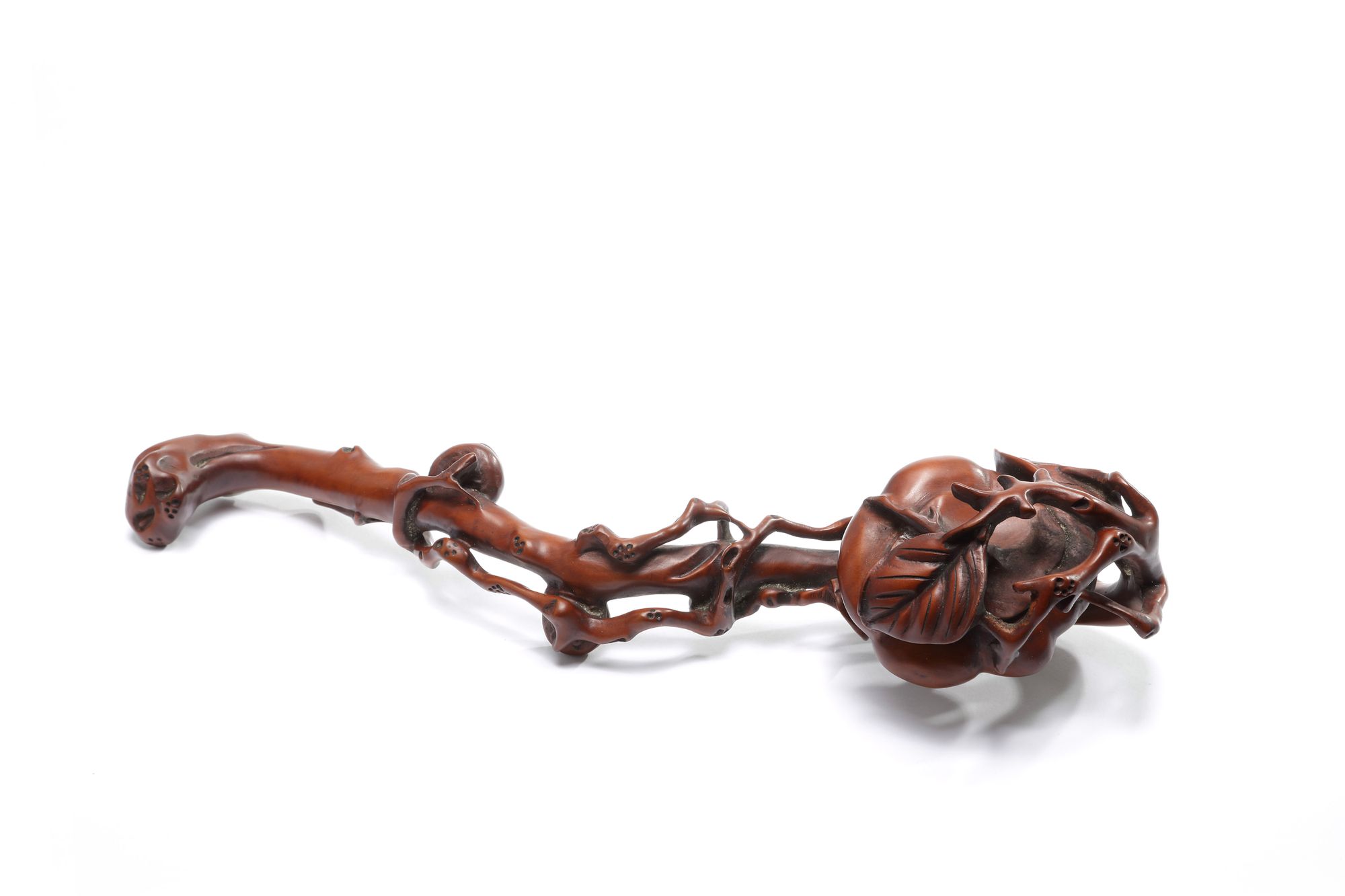 The sceptre is delicately carved and undercut as a gnarled leafy branch bearing persimmons, the largest forming the head of the ruyi-sceptre. The wood is of a lustrous honey brown tone.