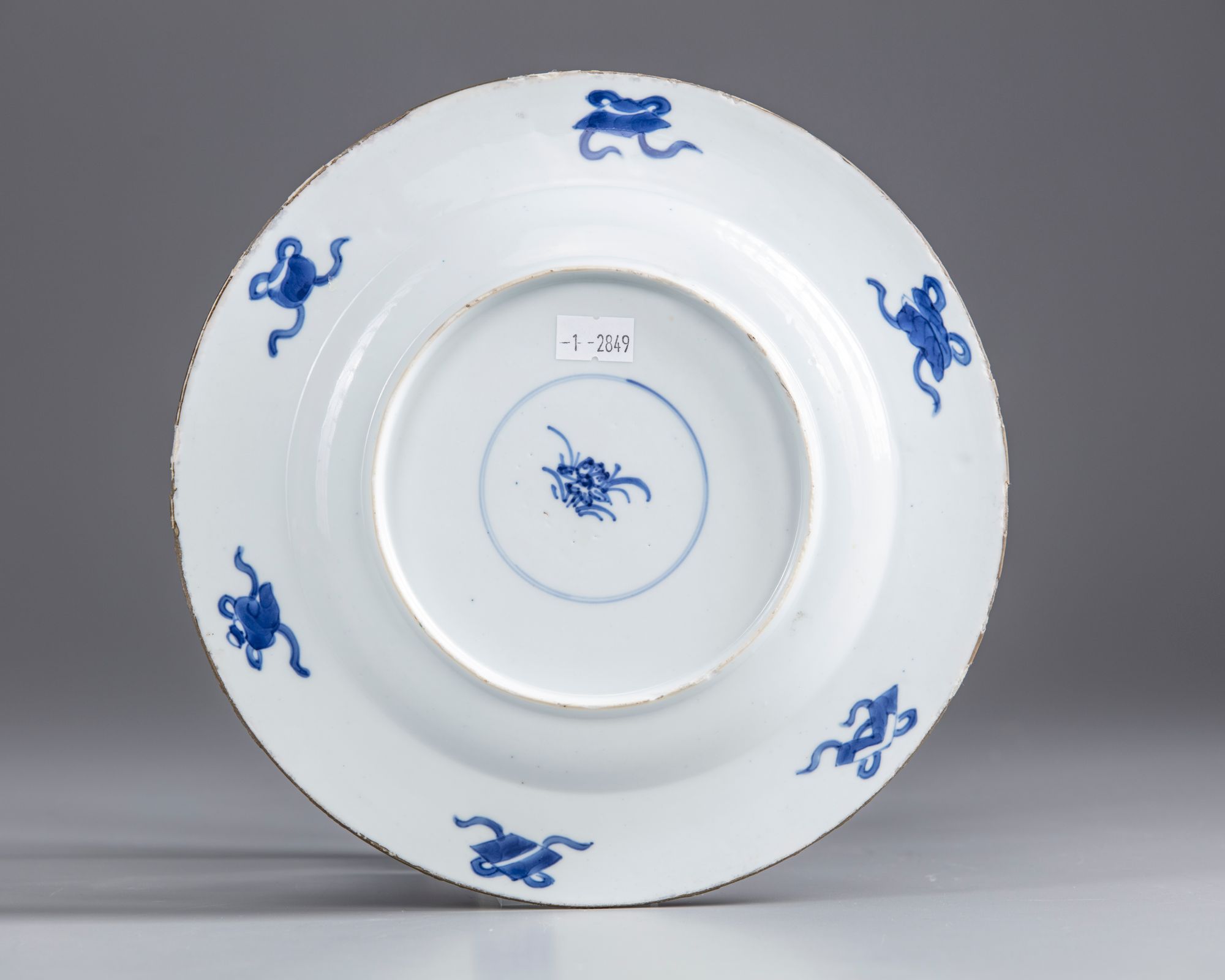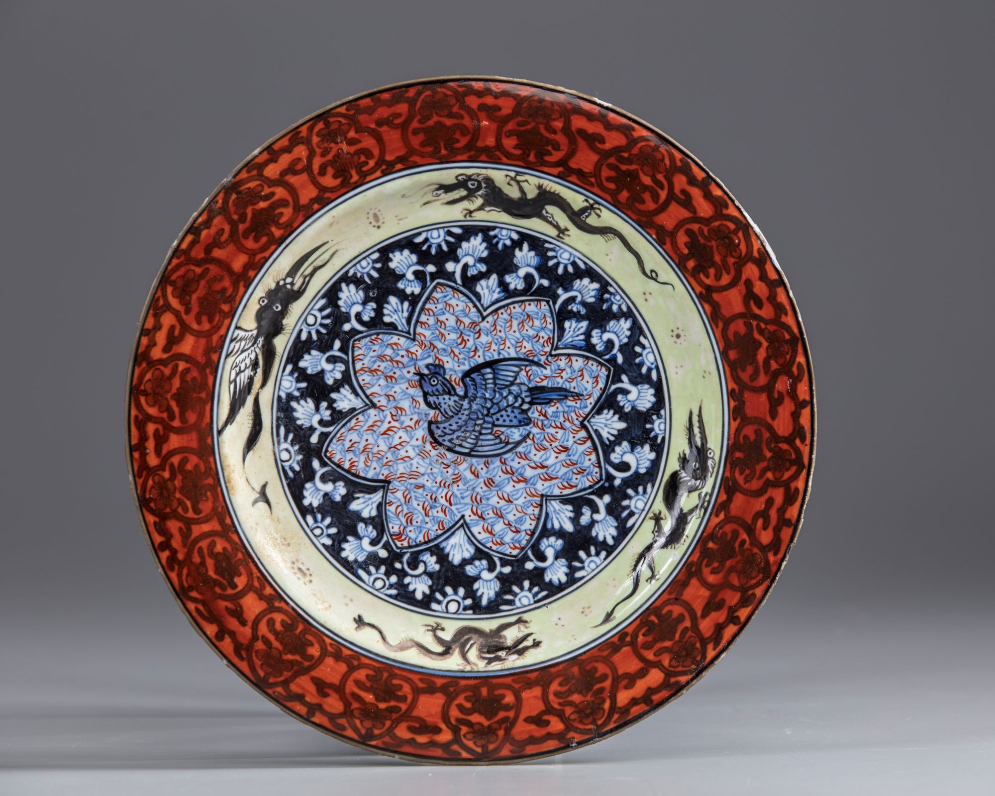 The dish is originally decorated with an underglaze blue design of a bird in a star-shaped panel surrounded by a trefoil band at the rim, and has now been later enamelled with dragons and phoenix on a yellow ground to the cavetto and iron-red to the rim. The exterior is untouched and decorated with six of the Eight Precious Things, babao, and the base with a lotus mark within a double circle.
