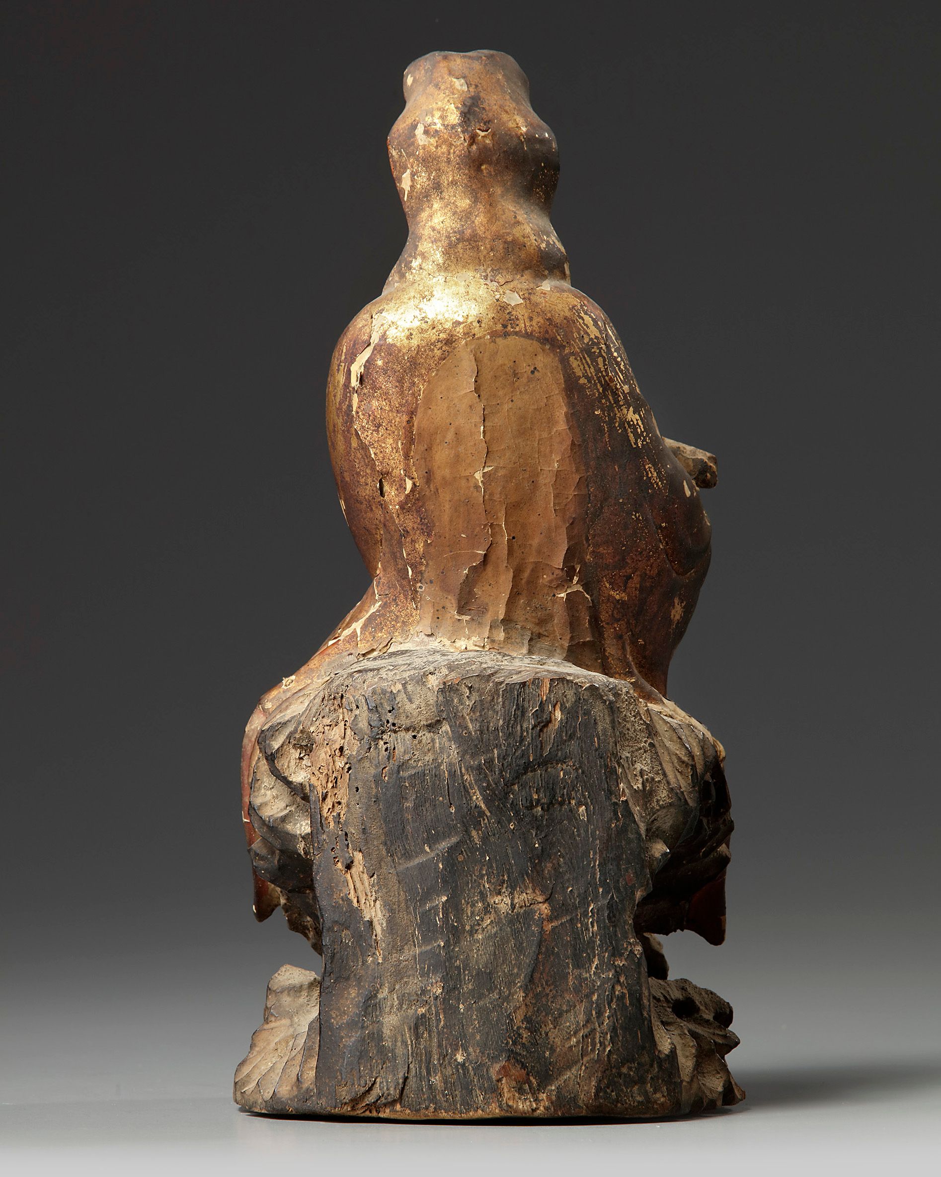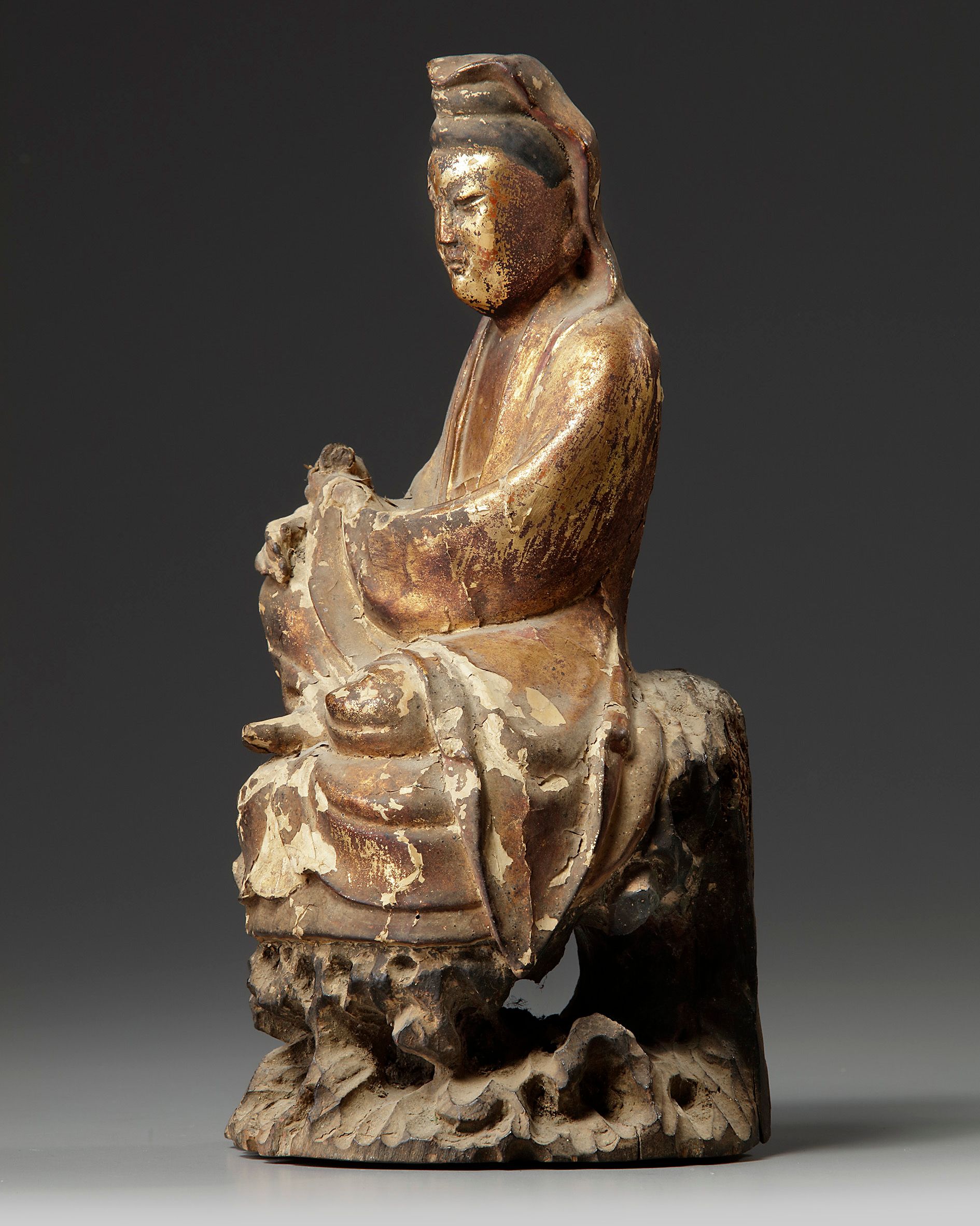 The Goddess of Mercy is carved with a serene face and her hair in high chignon. She wears long robes and in one hand holds a scroll and the other hand rests on her right knee as she sits in Royal Ease. The figure and her robes are covered in gilt lacquer.
