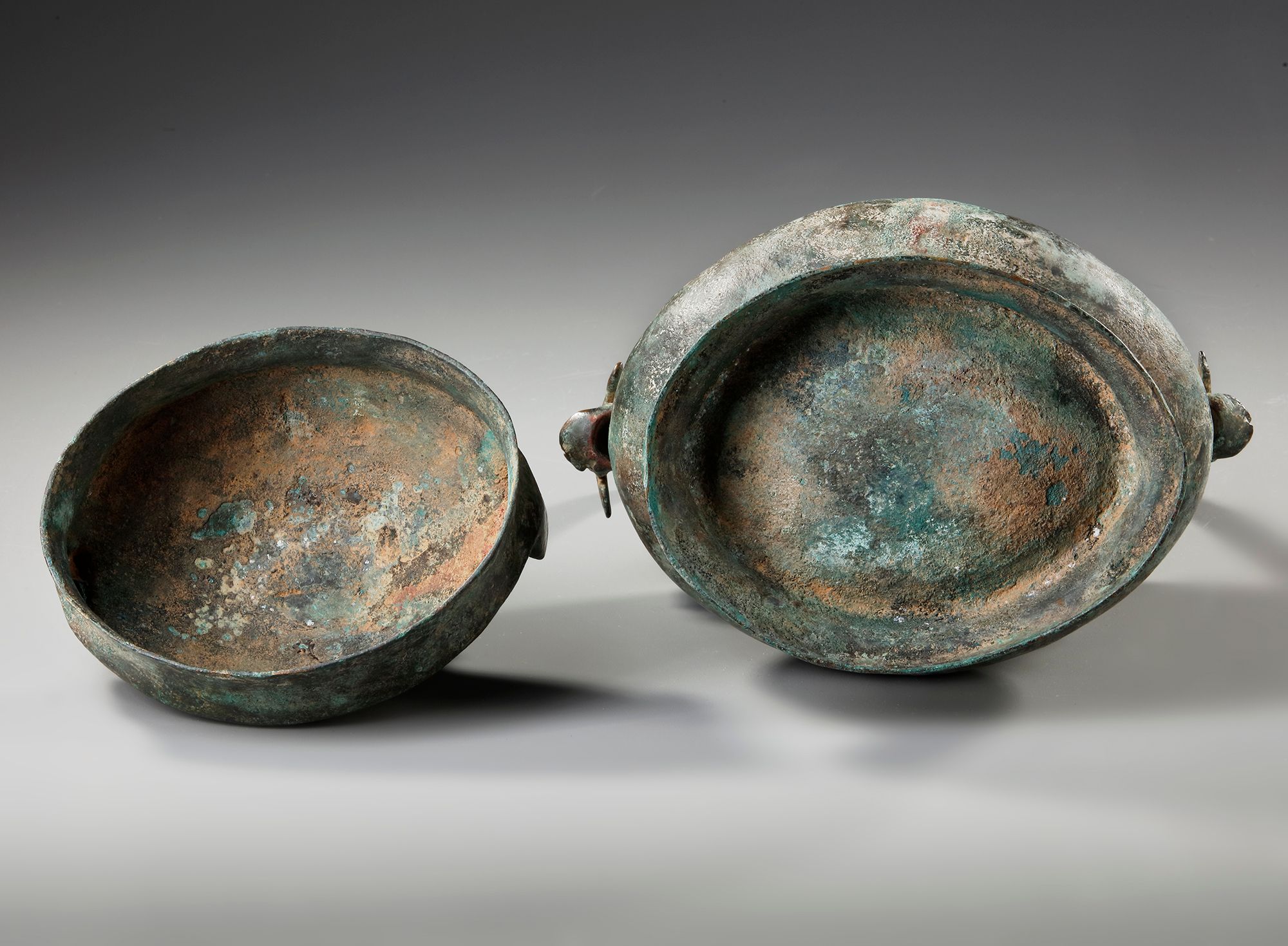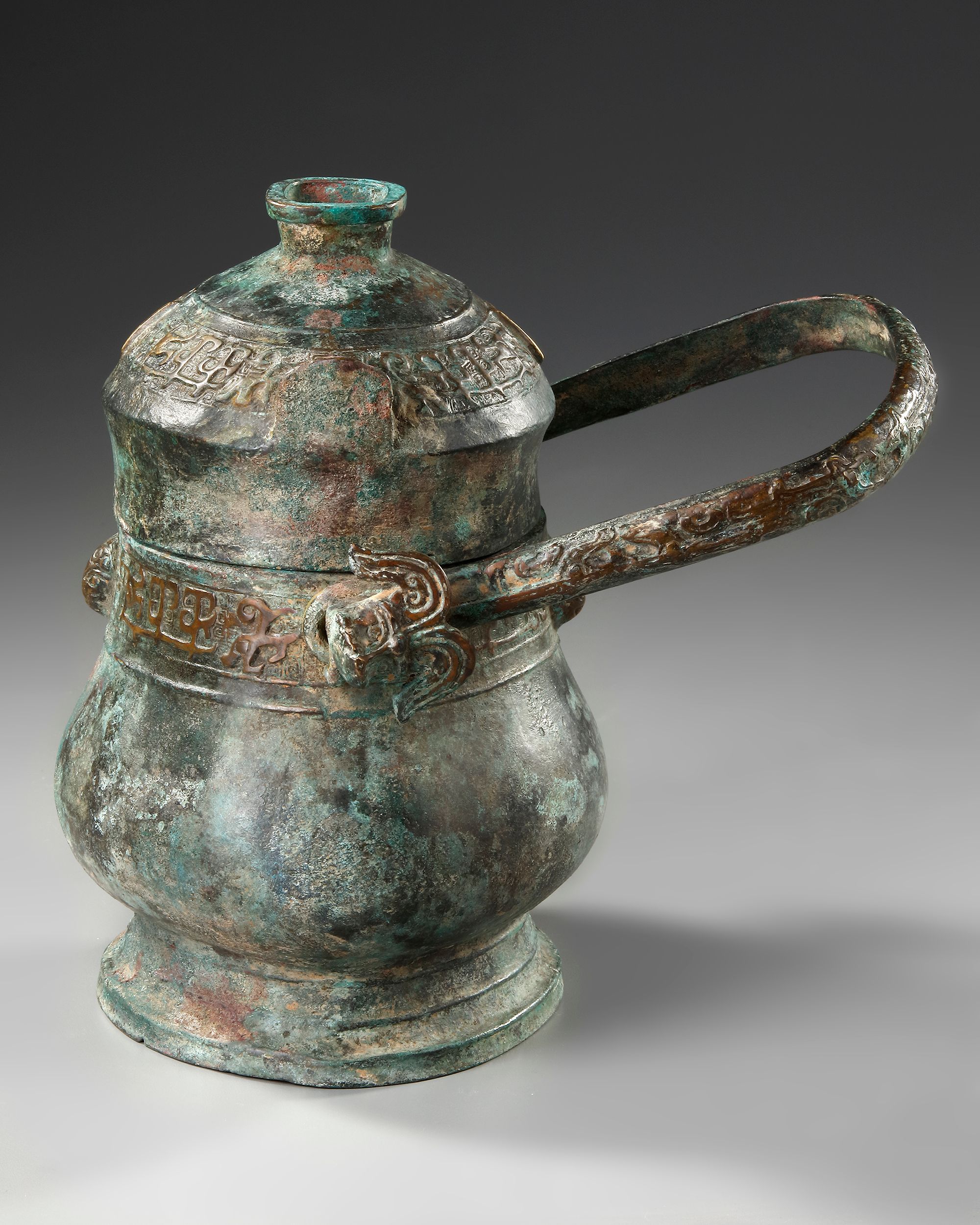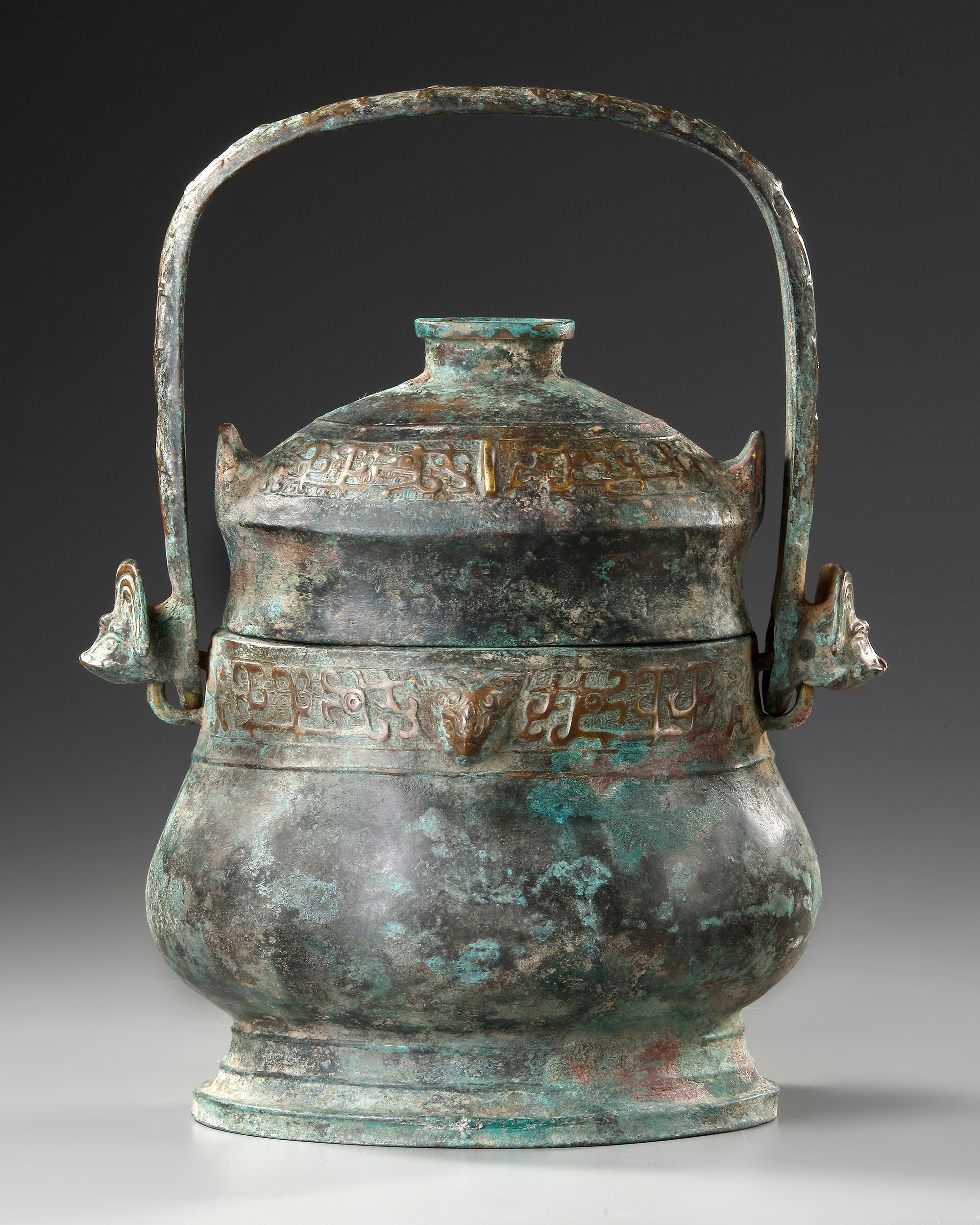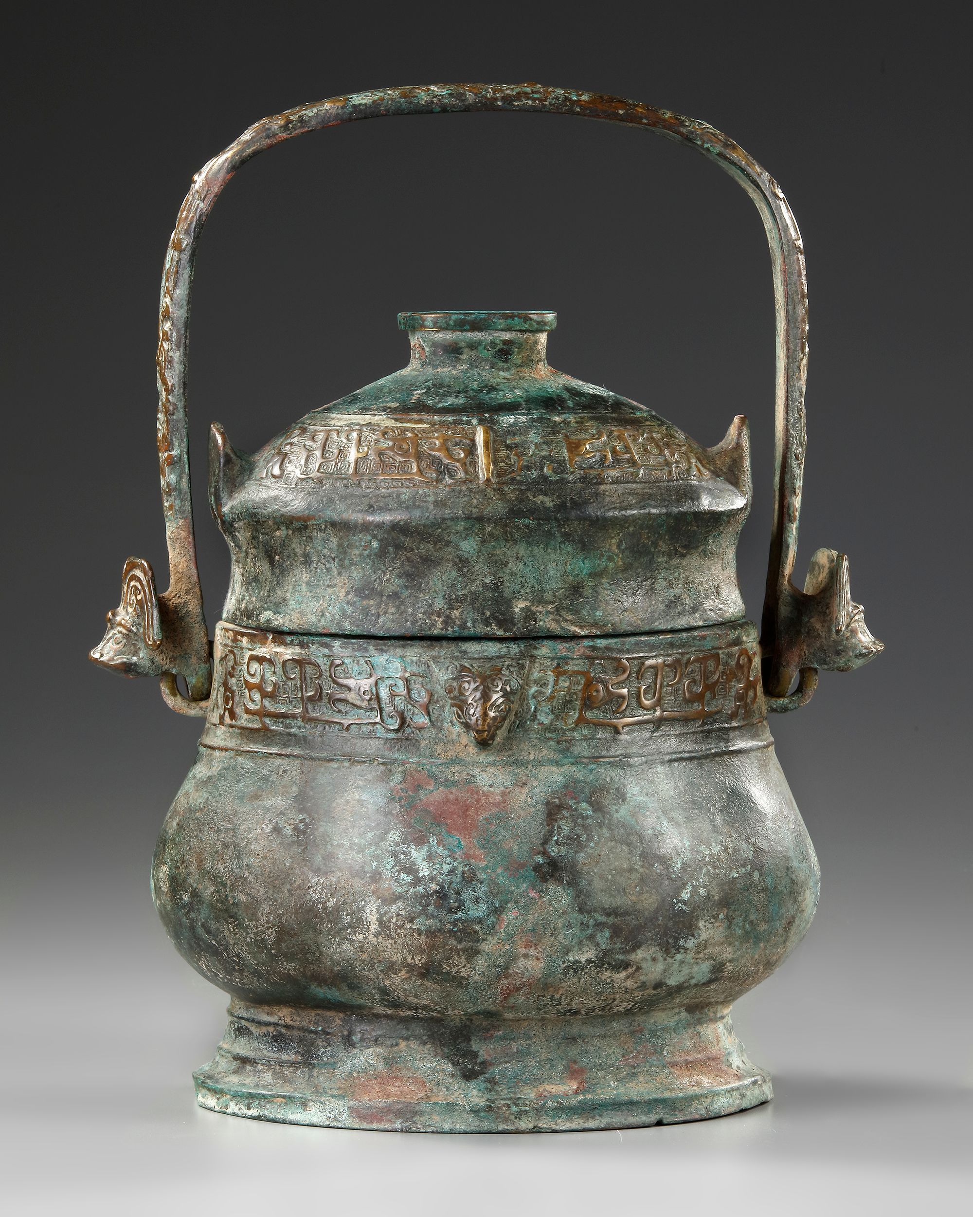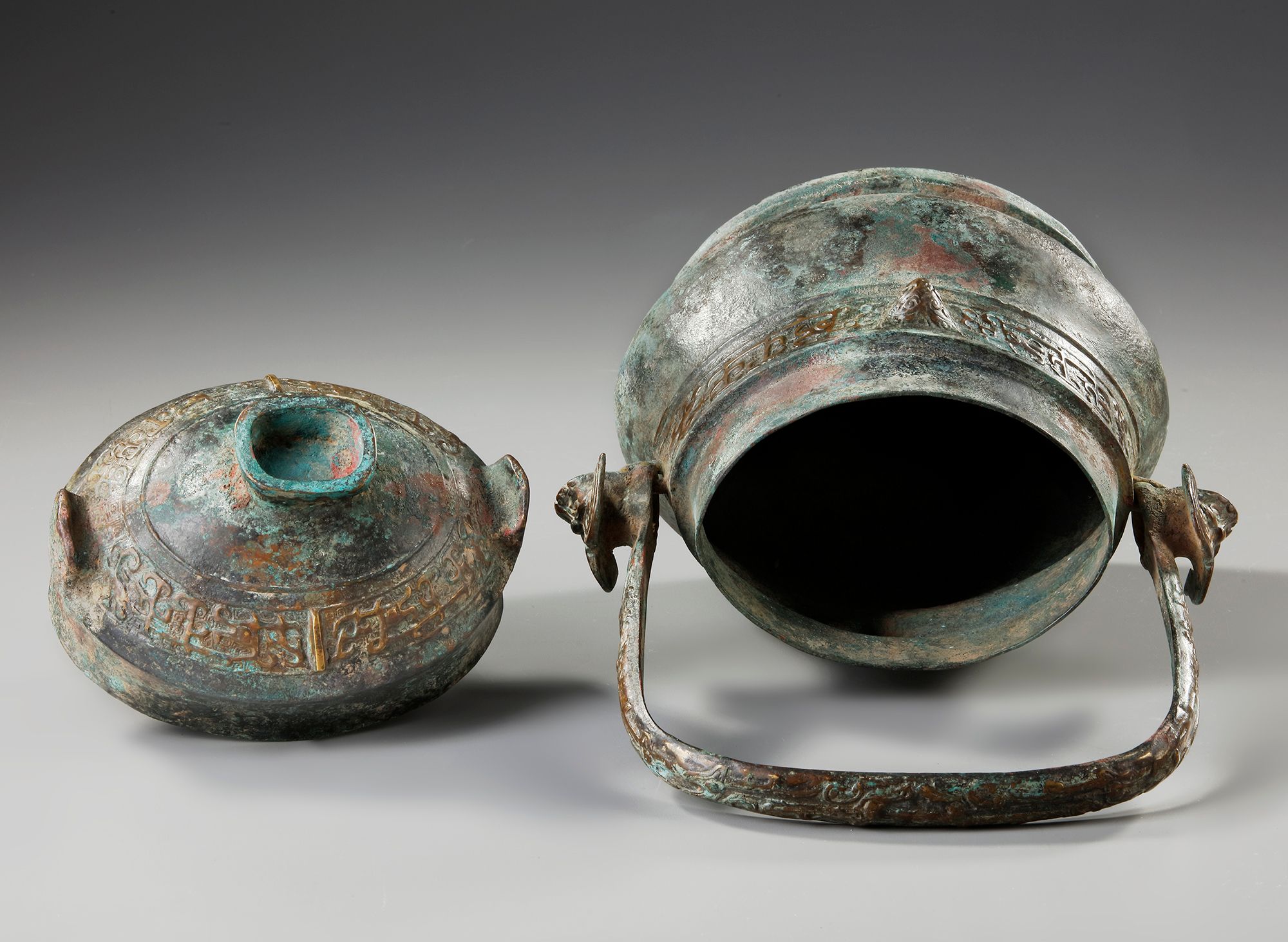 The vessel is cast with a globular body, the neck with two raised beast head masks on a band of kui dragons, each side is affixed with a swing handle with a beast head at the terminals. The cover is similarly decorated.