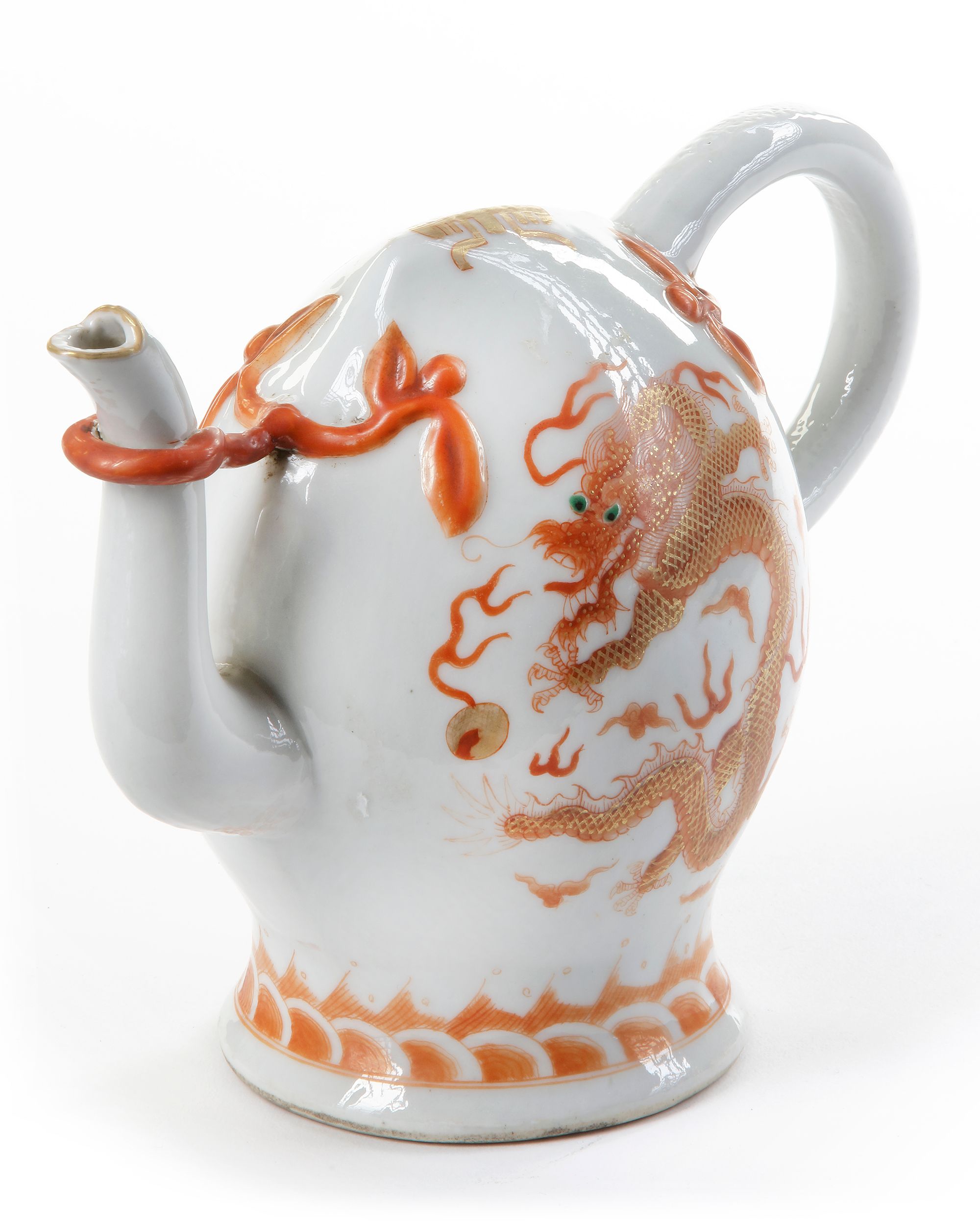 The peach-shaped teapot is decorated to both sides with a leaping dragon chasing the flaming pearl above waves. The s-shaped spout and c-chaped handle are decorated with imitation ribbons.