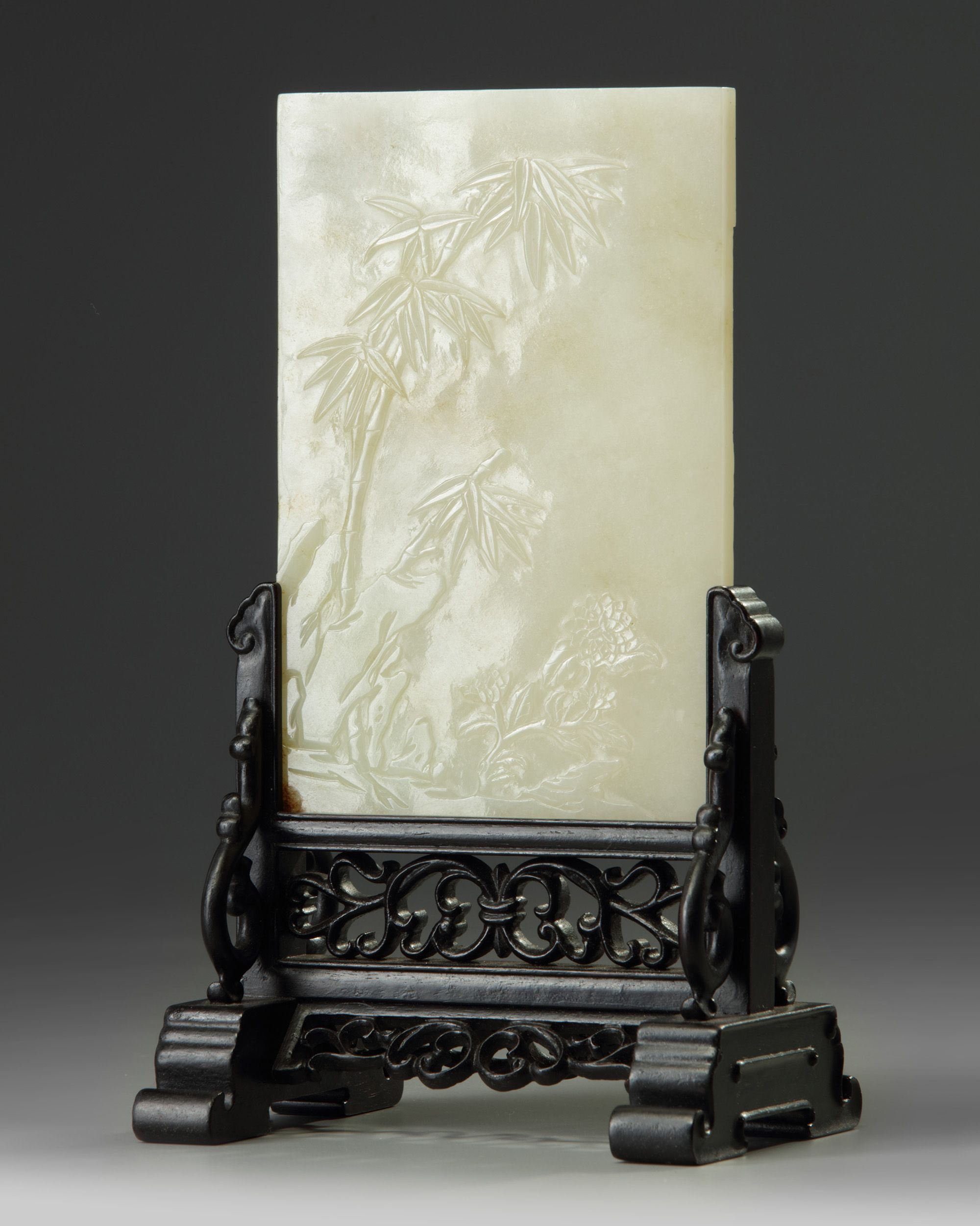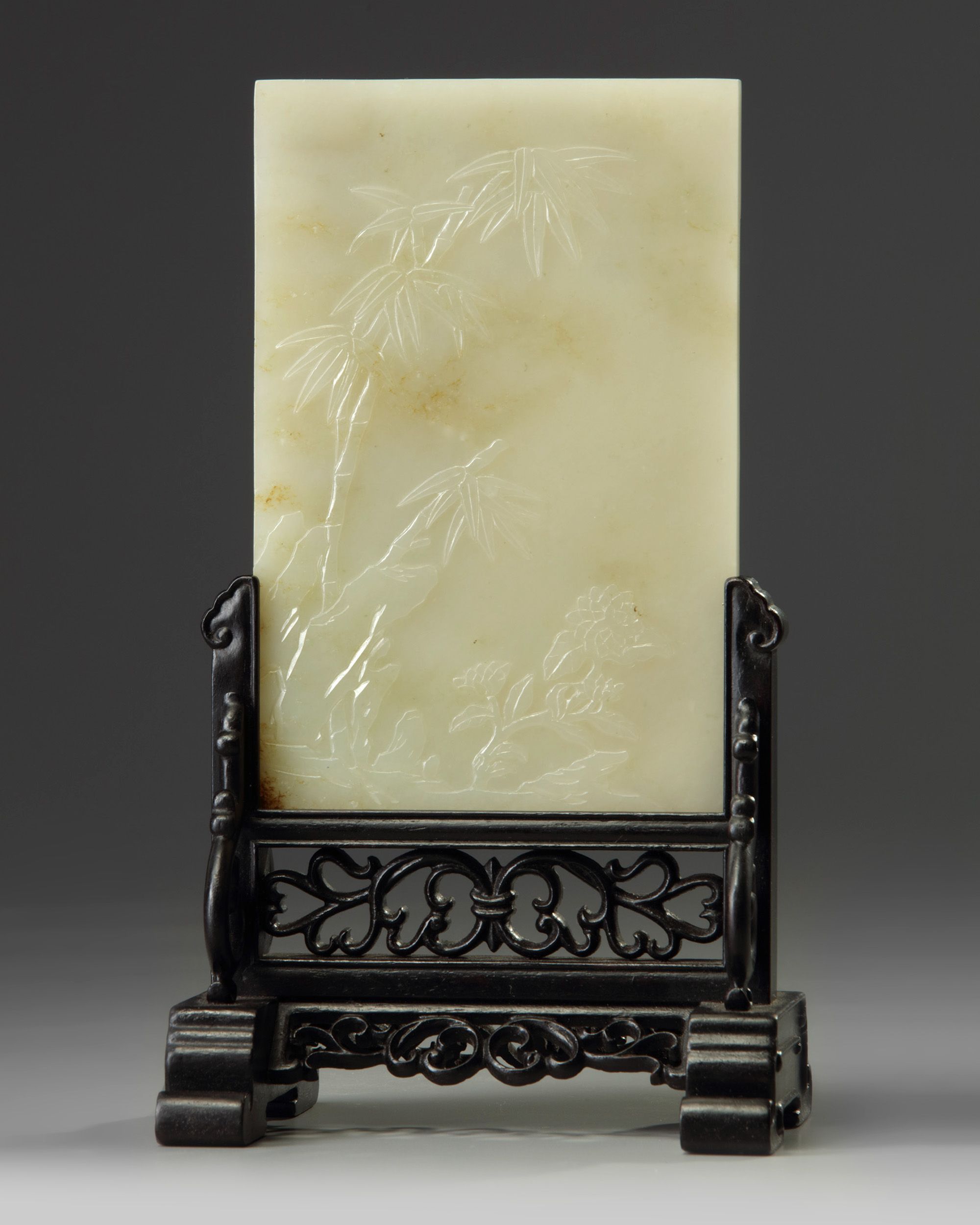 One side is carved in relief with a standing Guanyin holding a bamboo branch accompanied with a boy attendant, all on tumultuous waves below clouds and a bird in flight. The reverse is carved with bamboo and rocks.