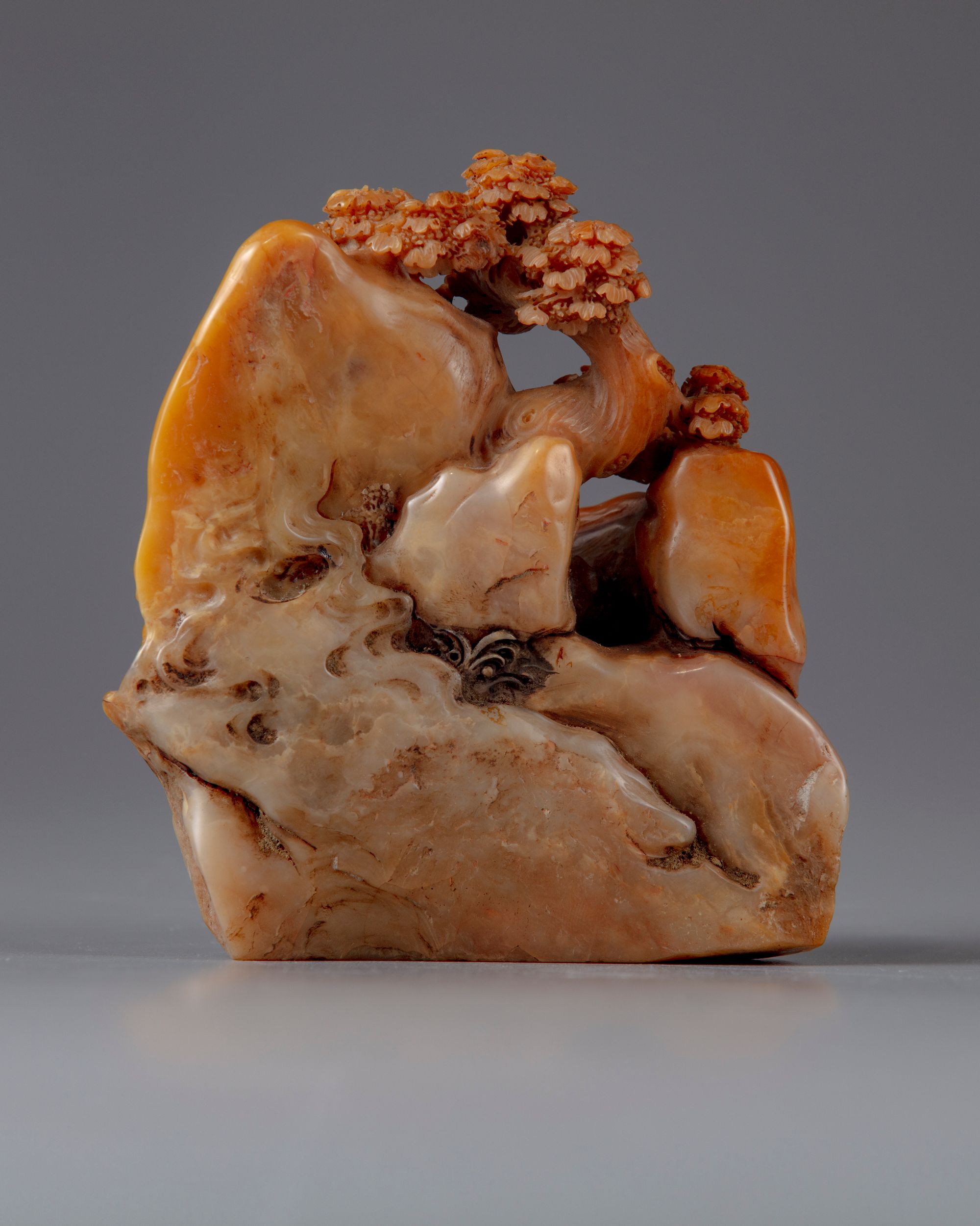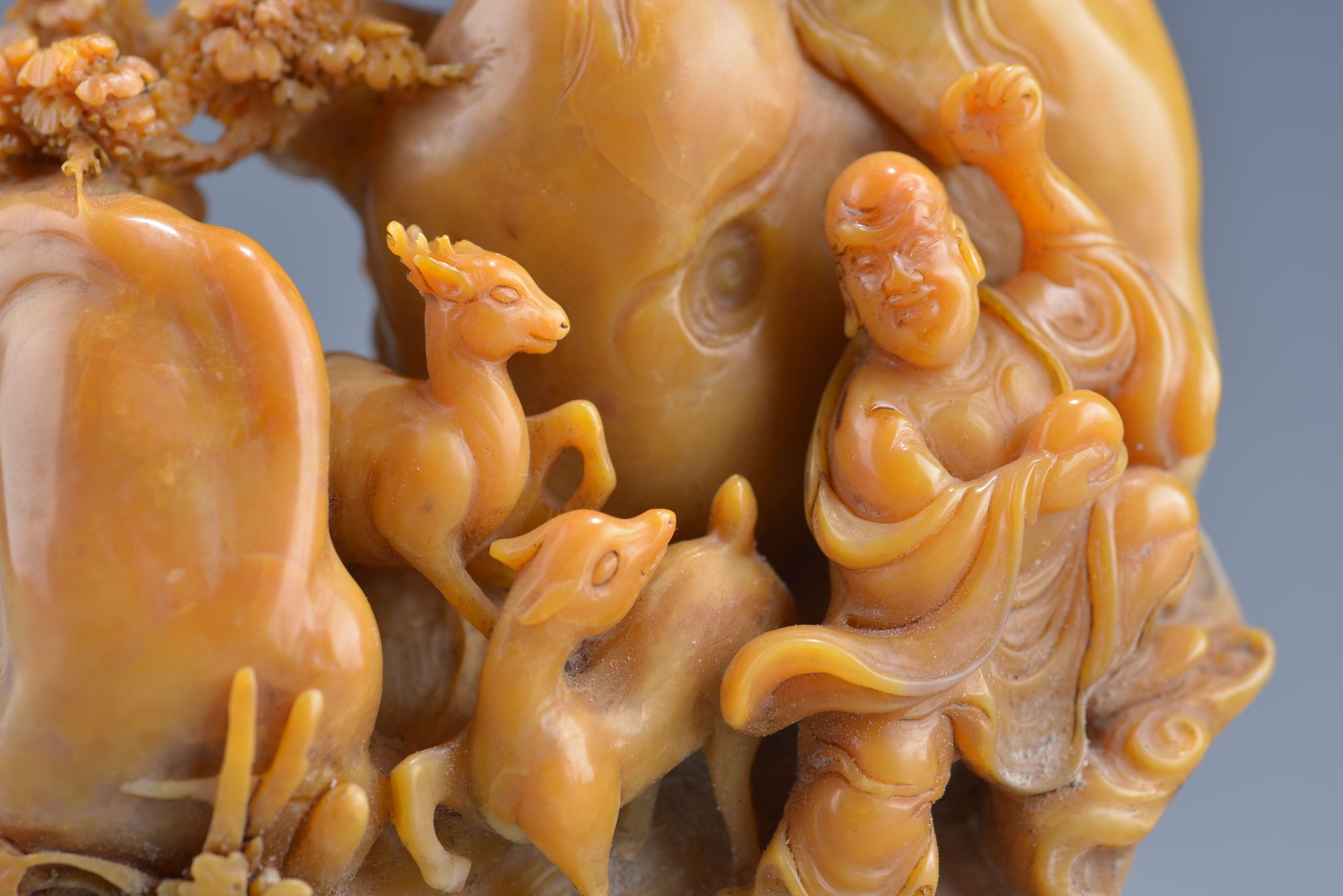 The irregular boulder is exquisitely carved and pierced in the form of a mountainous landscape inhabited by an immortal and two deer.