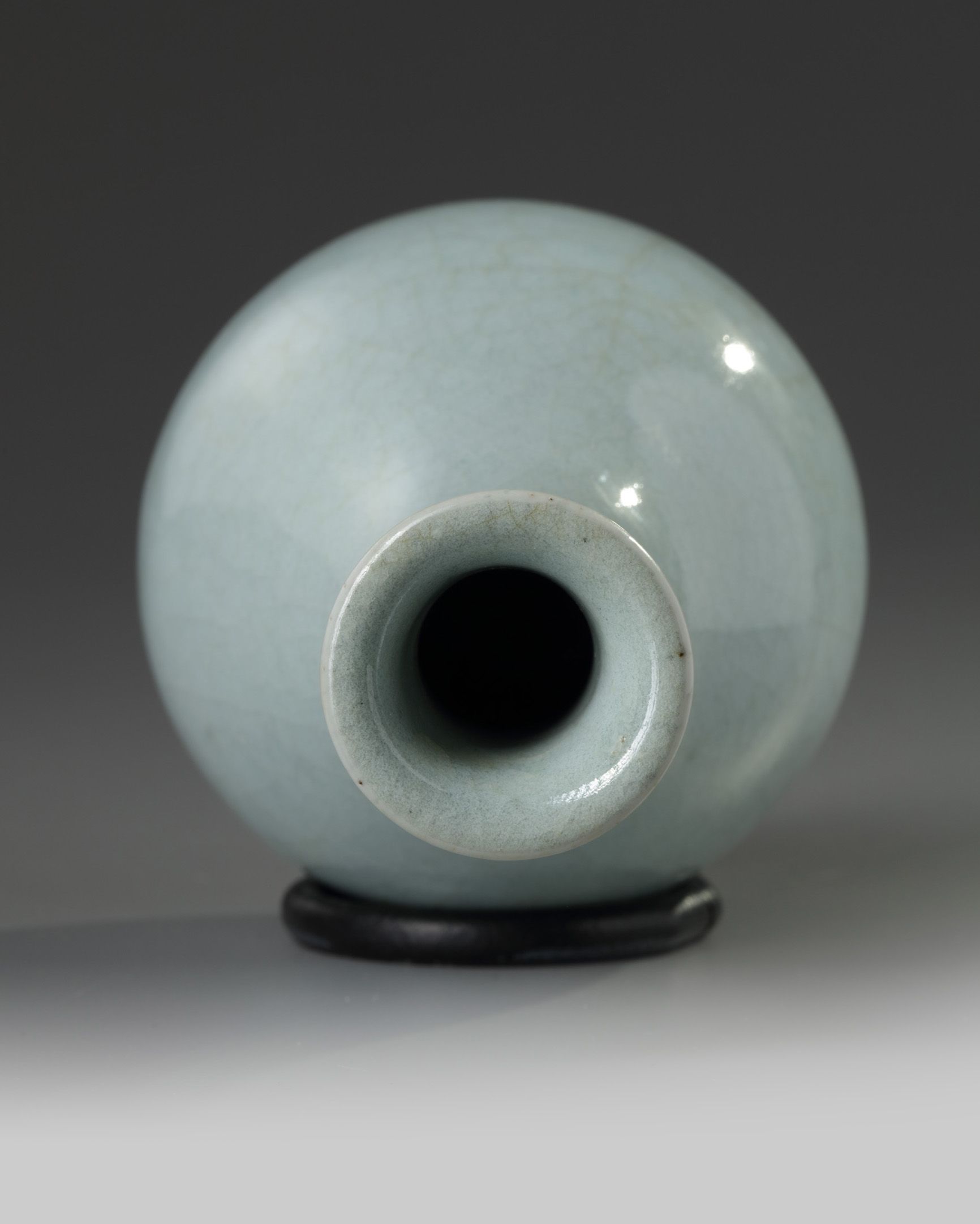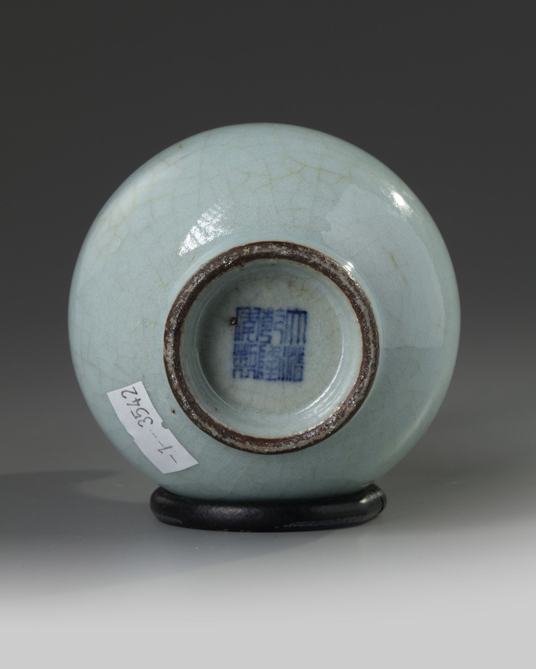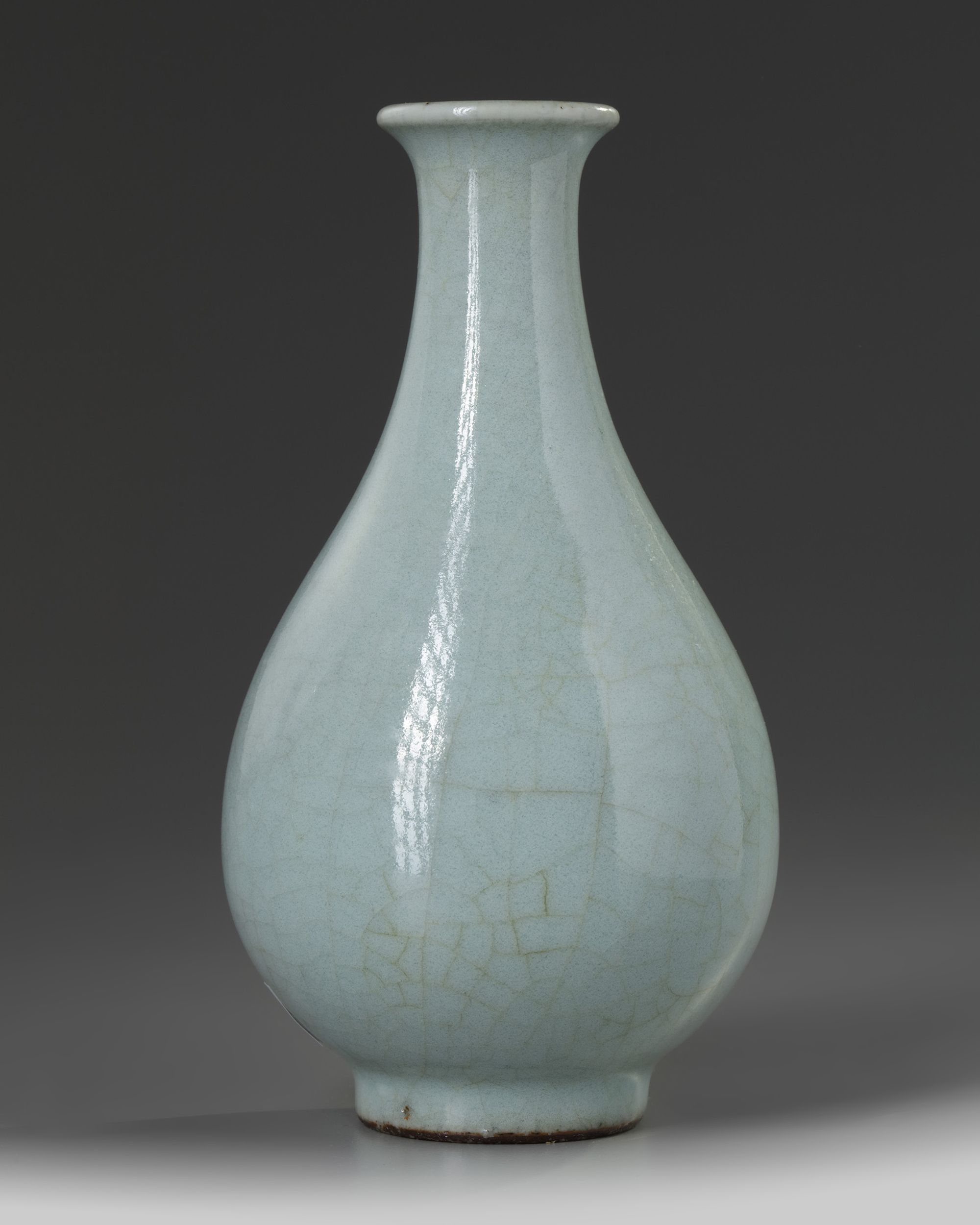 The vase is covered overall with a celadon glaze which is suffused with a fine network of pale crackles. The base with an apocryphal Qianlong mark.