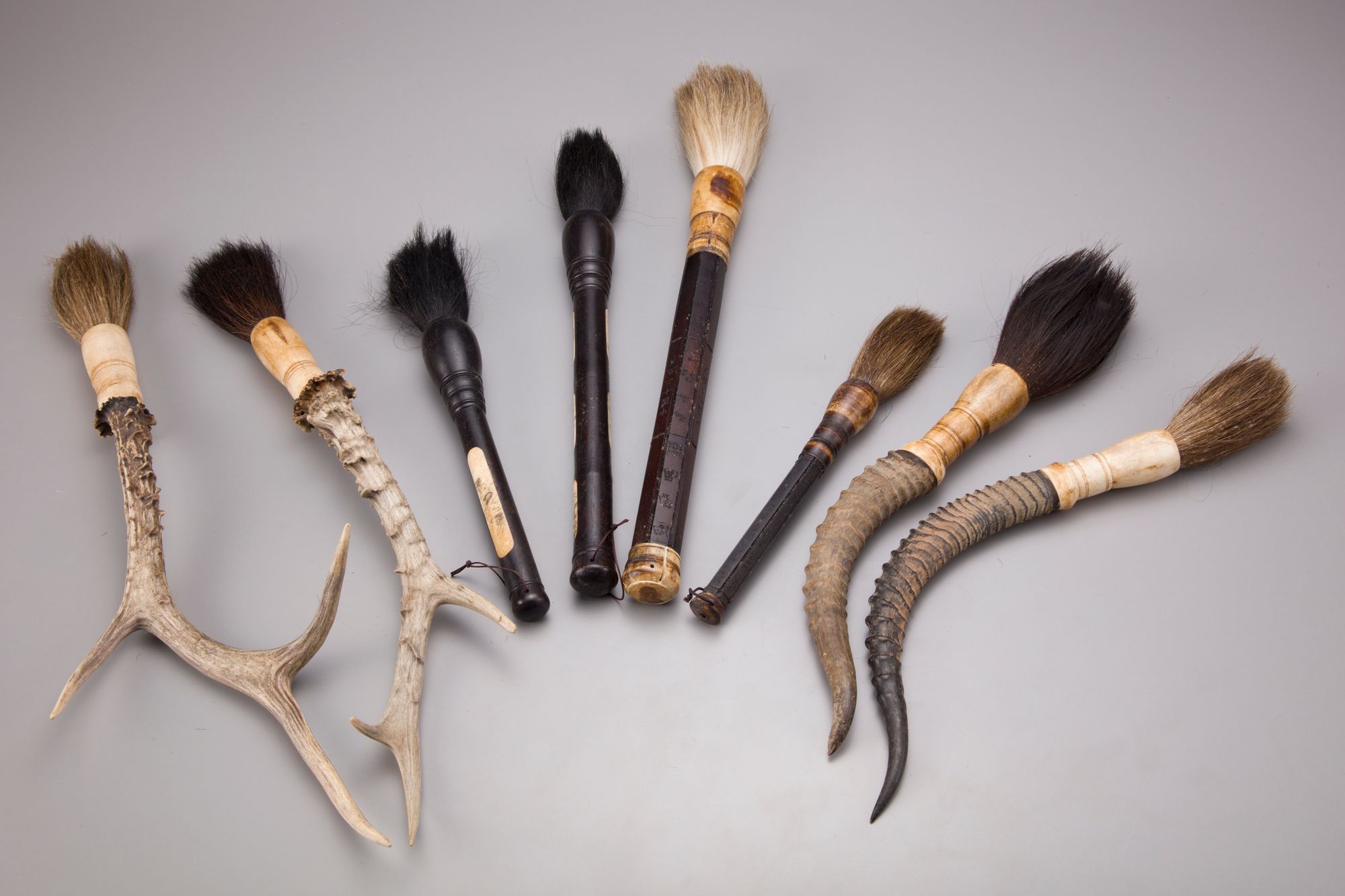 Horse hair with carved wood, antler and horn handles. 52 cm. and smaller.