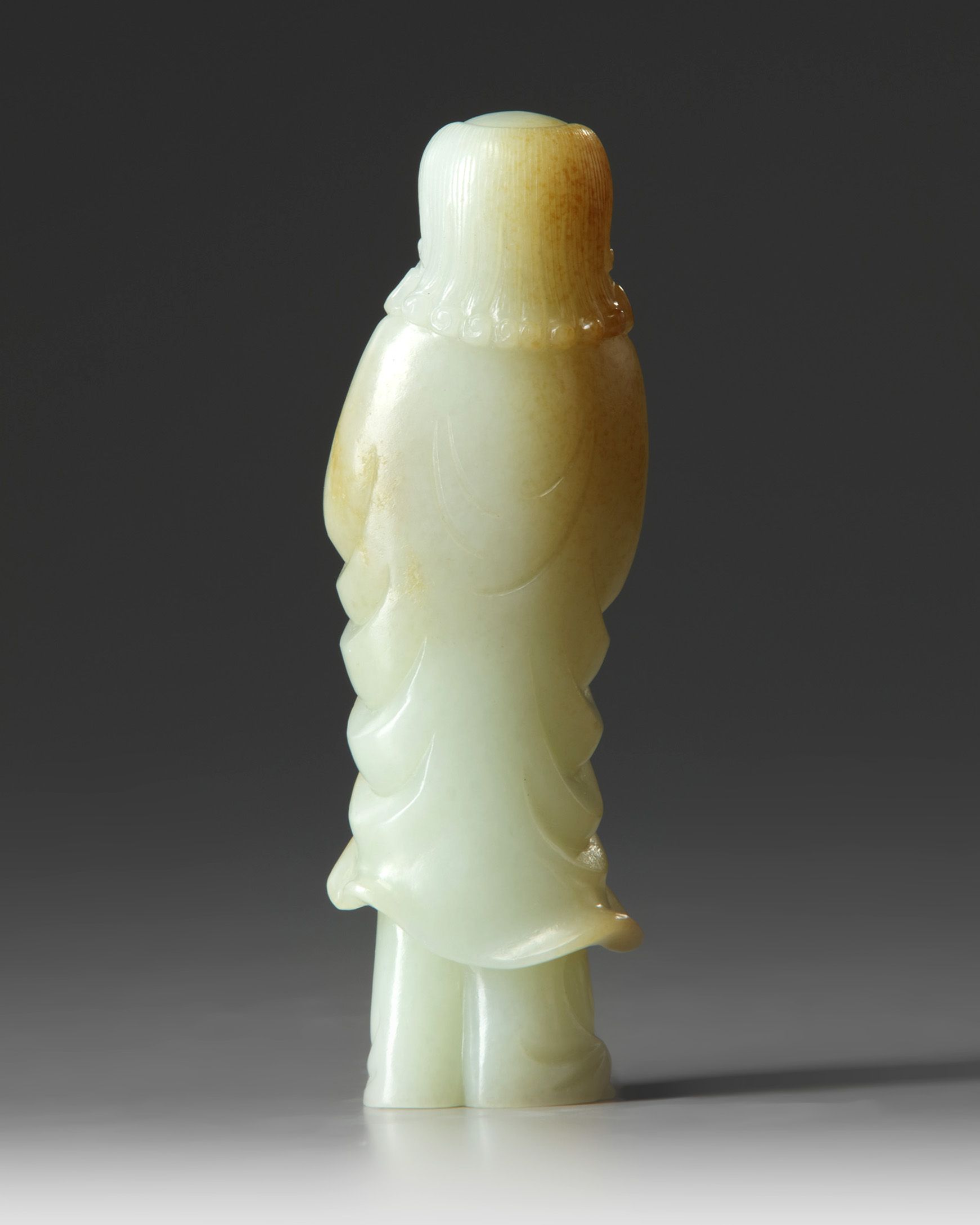 The Luohan is carved with curly hair and beard, and with an intense expression on his face. He is standing wearing long robes. 13.5 by 4.5 cm.