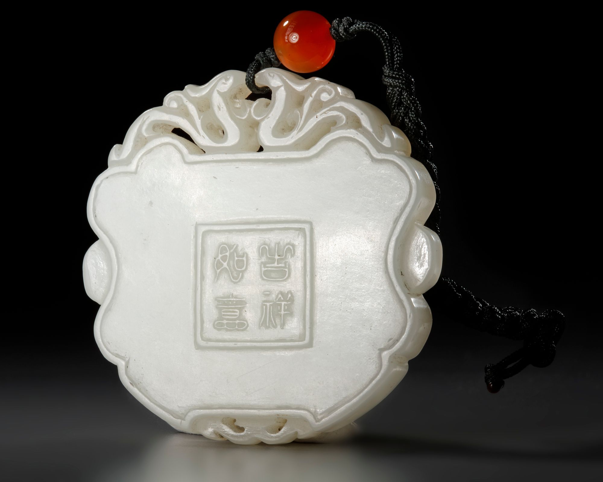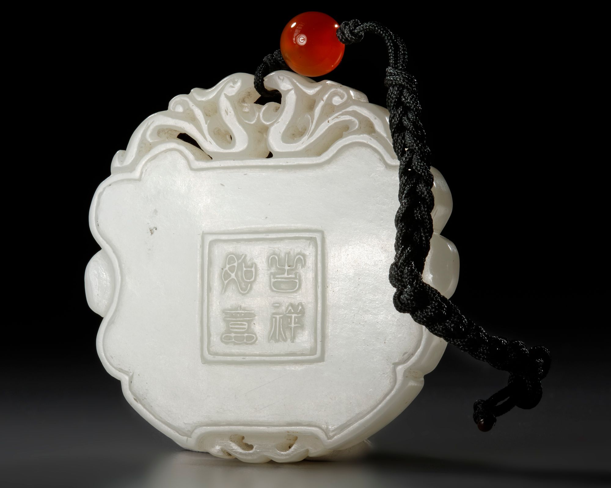 One side of the plaque is carved with two boys, one with a dog and the other with a hand drum. The reverse is carved with a four character auspicious wish, ‘jixiang ruyi’.