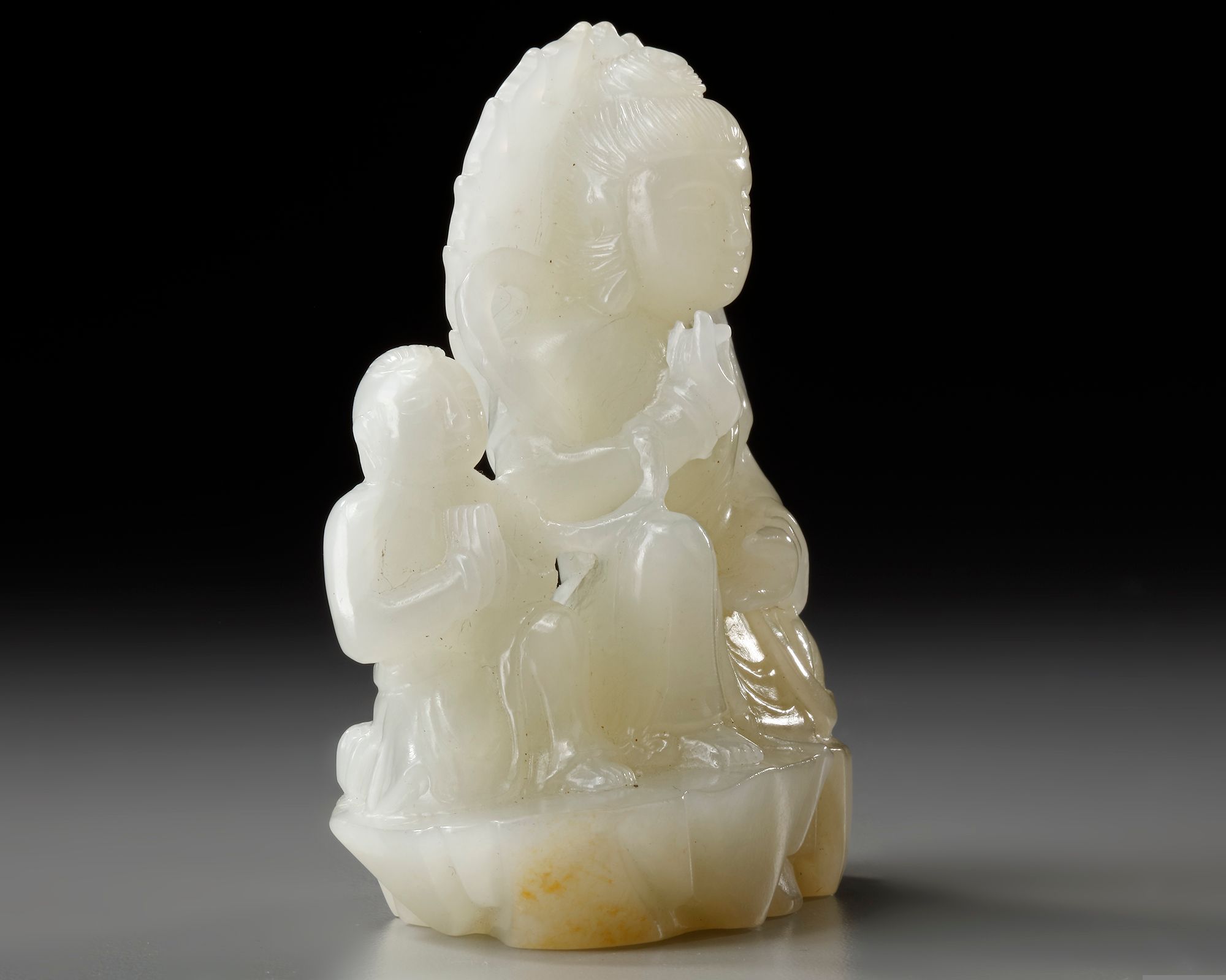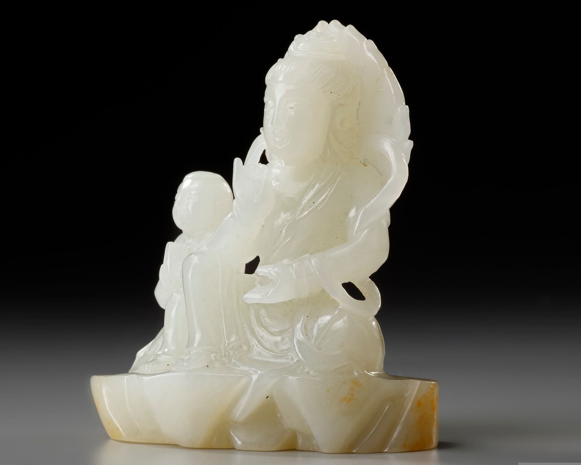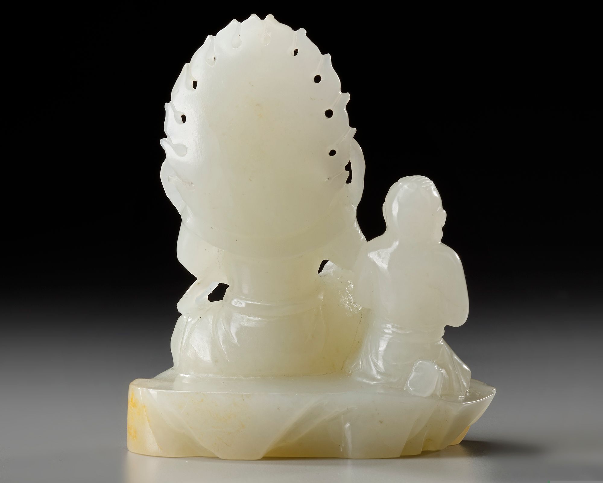 The piece is carved and pierced, with Guanyin seated in royal ease with one hand held up and the other down, all before a flaming mandorla. She is accompanied by a kneeling acolyte.