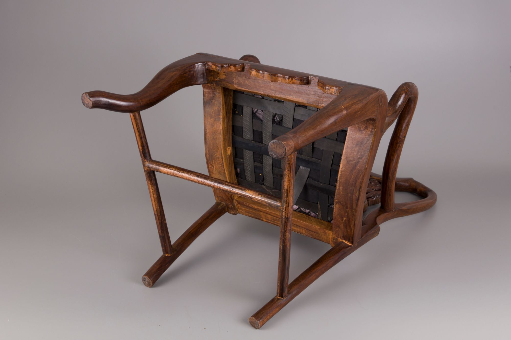 Hardwood chairs with marble inset into the back of each chair, elegant scroll designs with original dark hardwood finish.