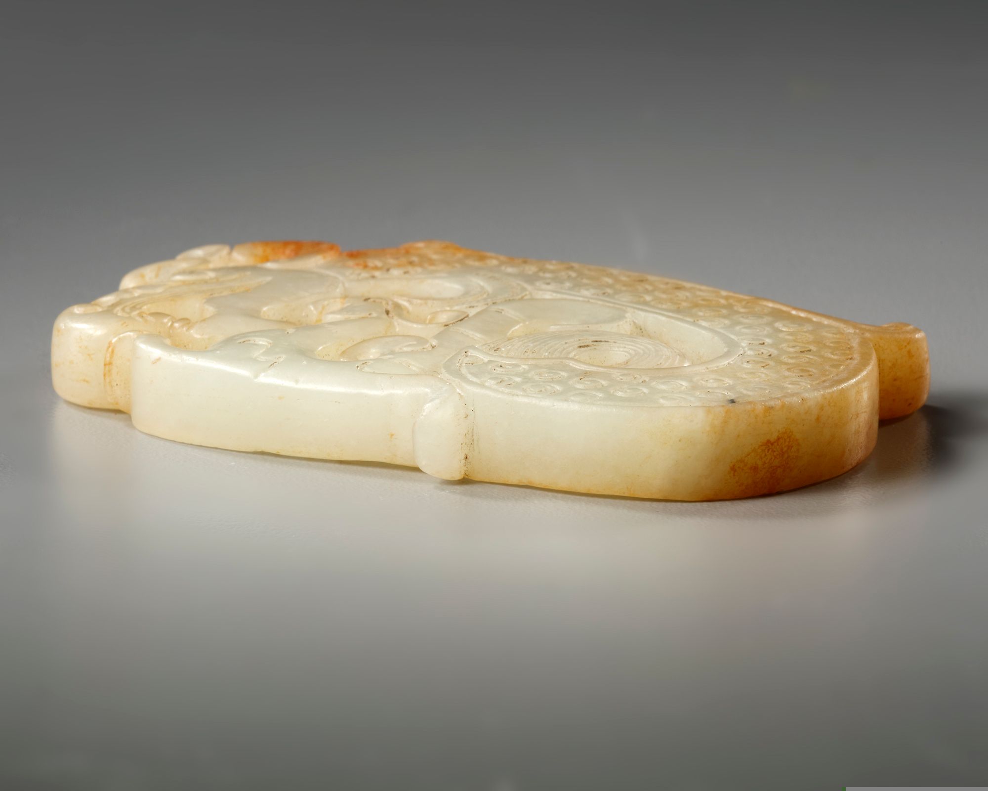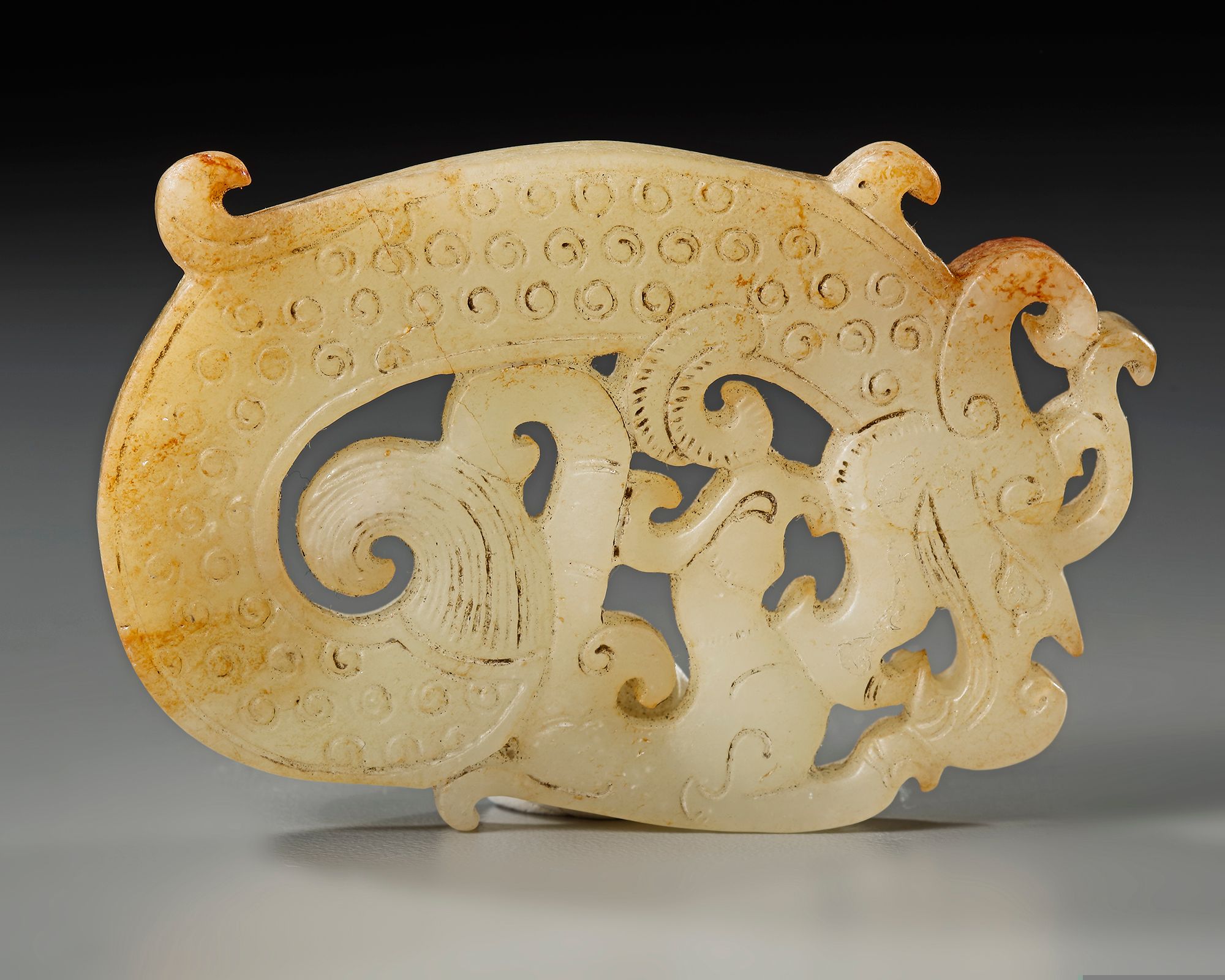 Carved as a coiled mythical beast with a dragon head and carp tail, decorated with nodes to the body. The dragon fish is coiled around a phoenix.