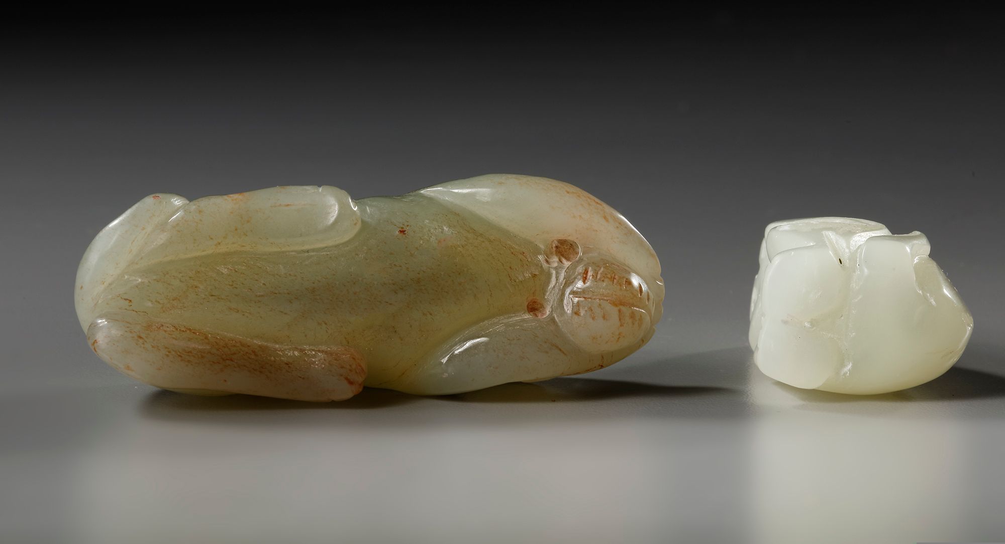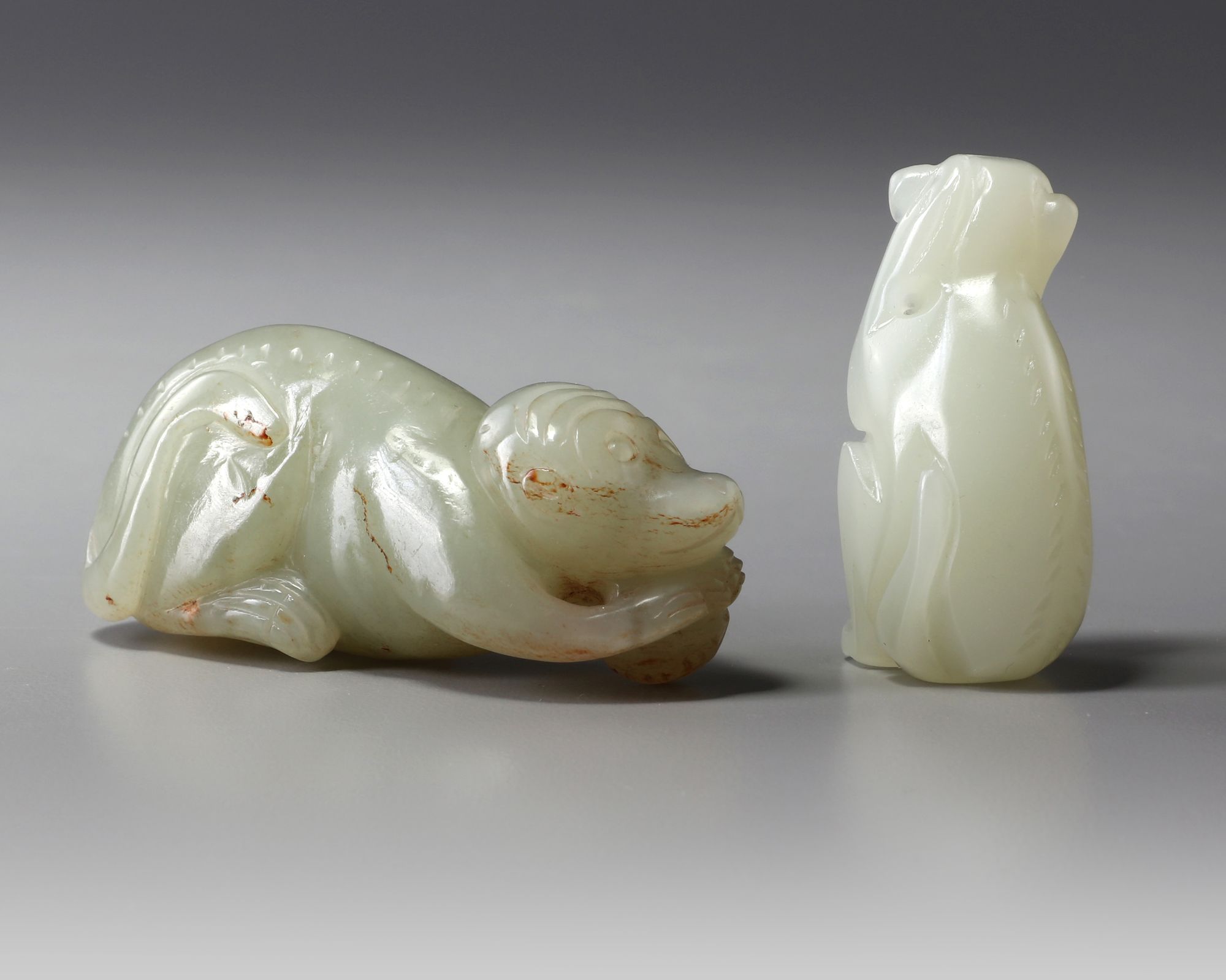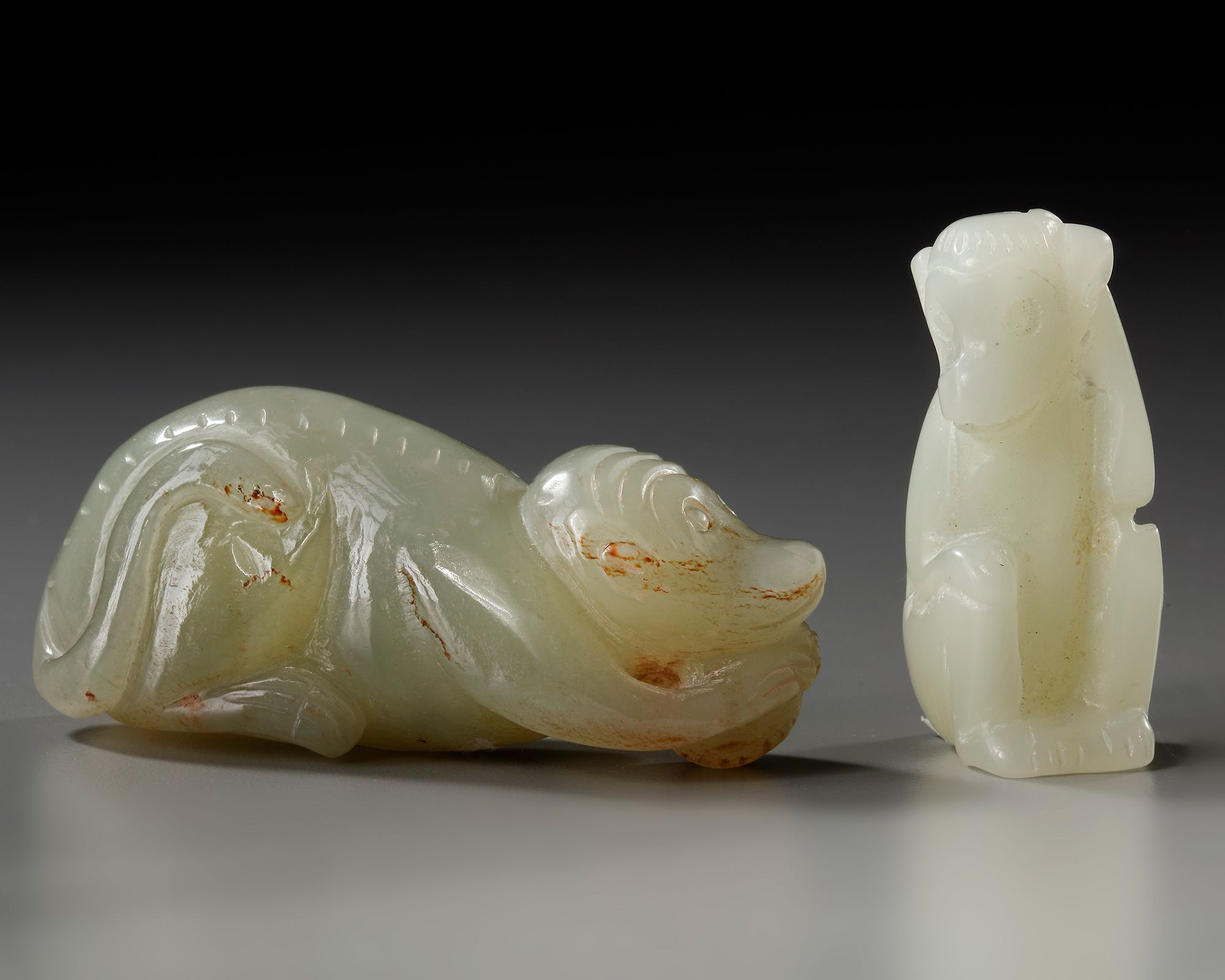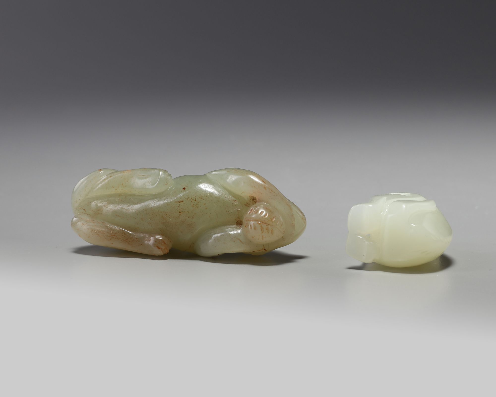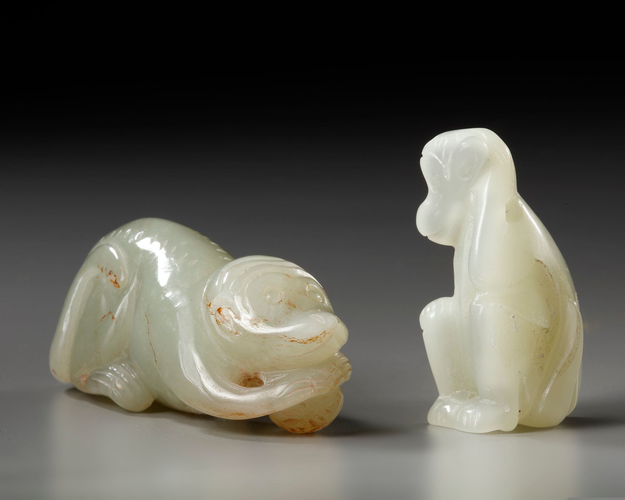 The first is a celadon jade monkey carved crouching, and the other is a pale celadon jade monkey carved seated.