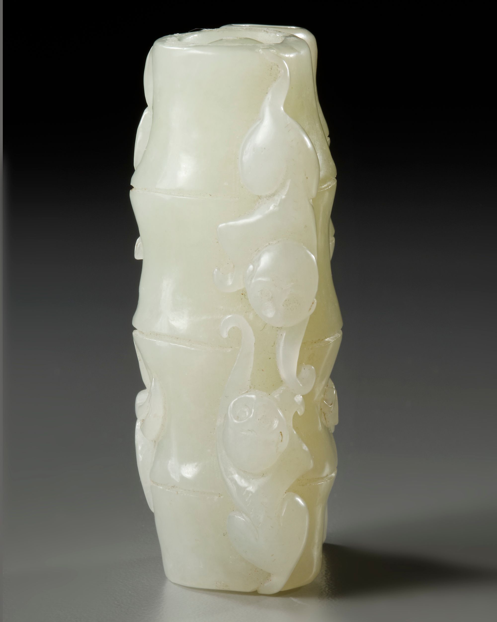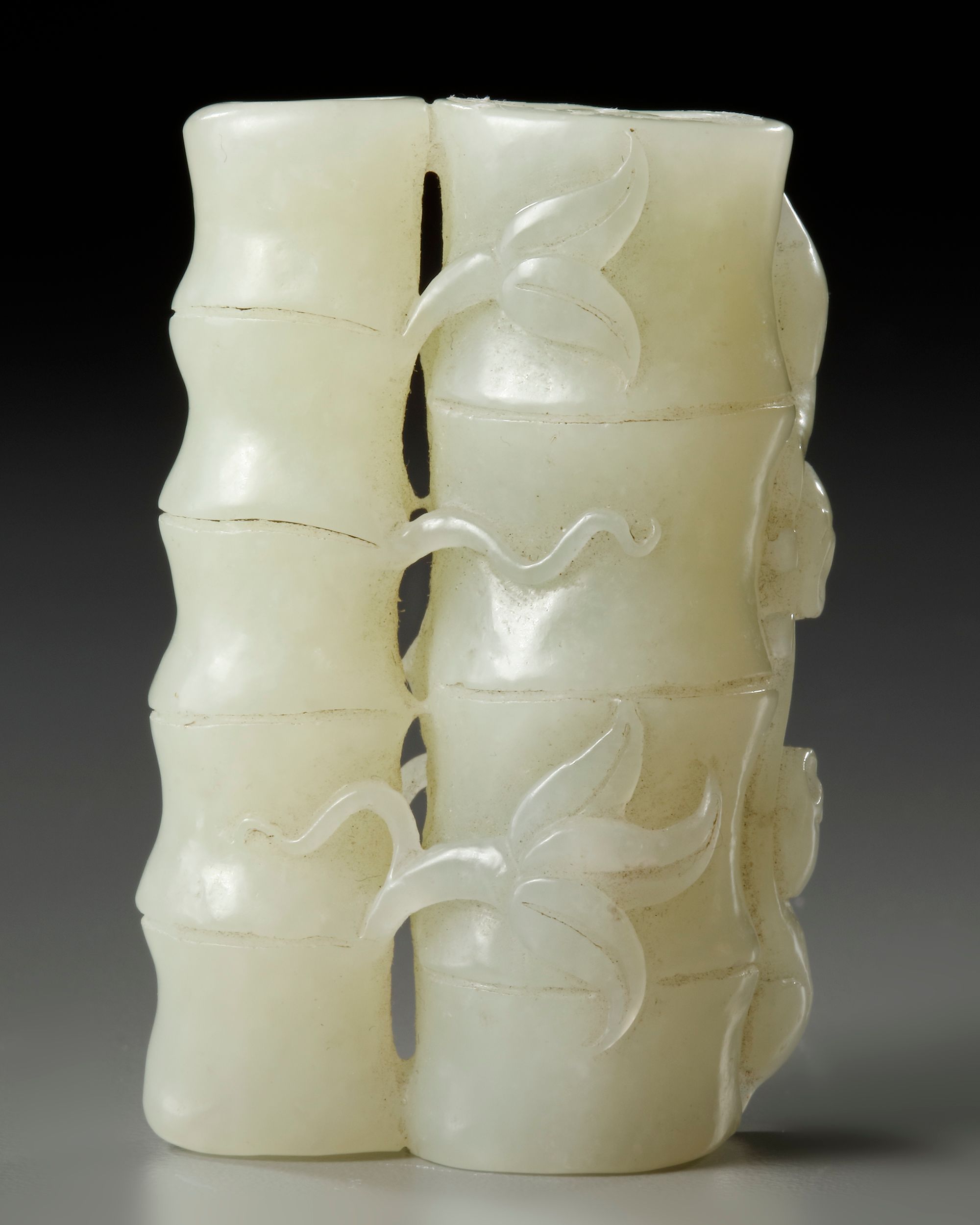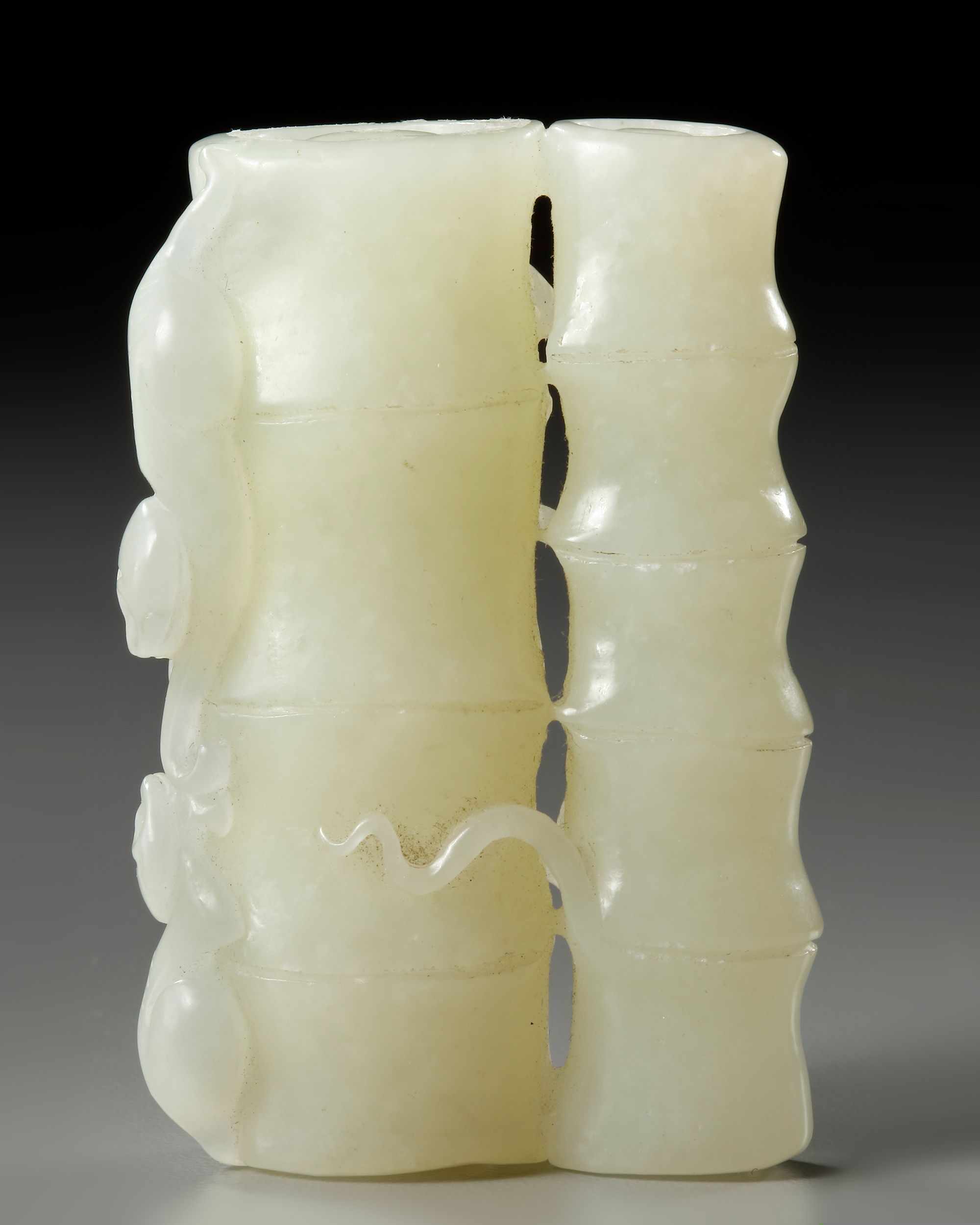 The piece is carved and pierced as two monkeys on a double bamboo stalk. The jade is of a pale tone. 6 cm. length.